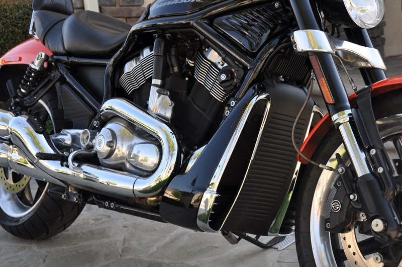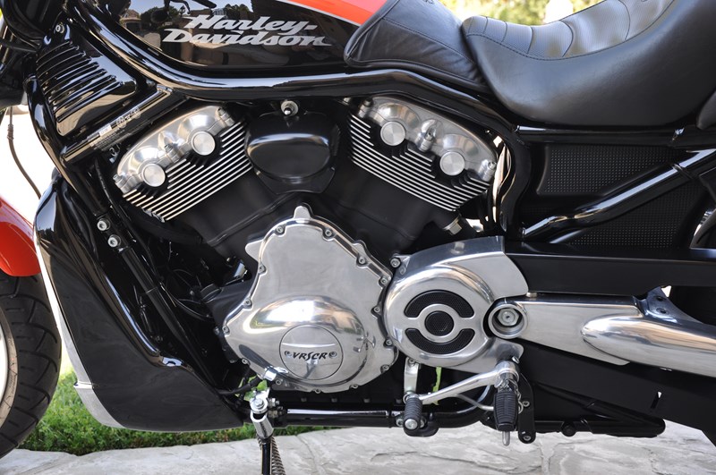 The V-ROD VRSCR Street Rod combines an upright seating position, a 40-degree lean angle and improved suspension to create a motorcycle that marries custom styling with a new level of cornering agility. Inverted fork with sculpted triple clamp 30-degree rake, cornering clearance, mid-mount controls. Staggered 10-Spoke wheels. The 43mm inverted forks and rear shocks have a performance calibration to help deliver a performance-oriented ride. The Revolution V-Twin four valve per cylinder overhead cam engine with straight-shot dual exhaust pipes is pumped up to make 120 hp and 80 ft. lbs. of torque. This one has new METZLER ME880 MARATHON tires and BREMBO triple-disc brakes within last 1,000 miles, tank bra, K&N intake, chrome backrest/luggage rack baseplate w/ passenger backrest and, a battery tender connection.
