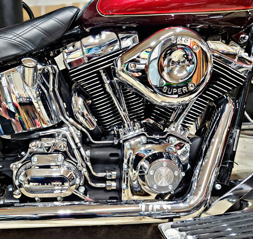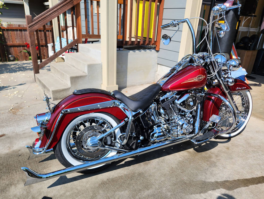 16 inch apes, 21 inch 40 spoke. Lowered 2 inches in rear 1 inch in front. 6 speed transmission with 96ci twin cam. S&S air. Only 5,800 miles. Completely chromed out bike. Clean title in hand.