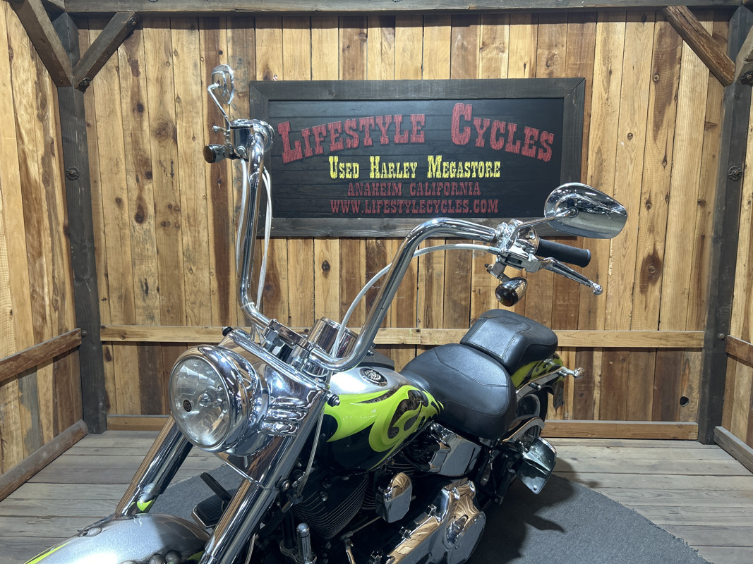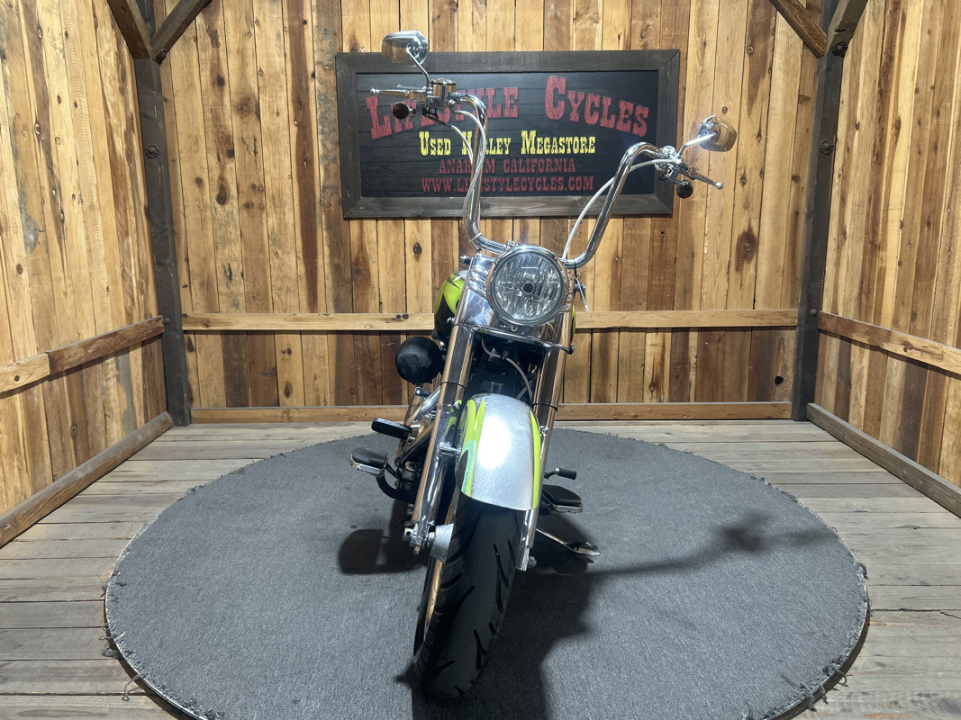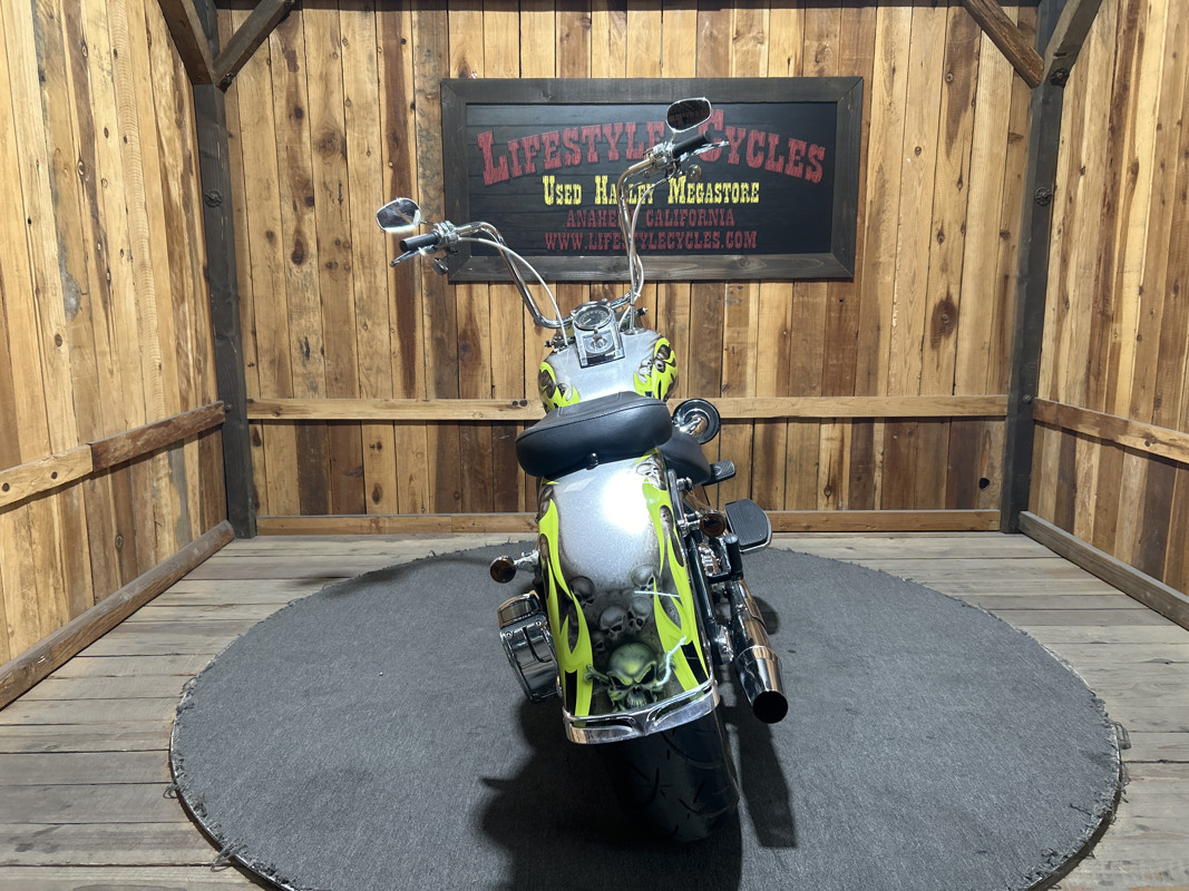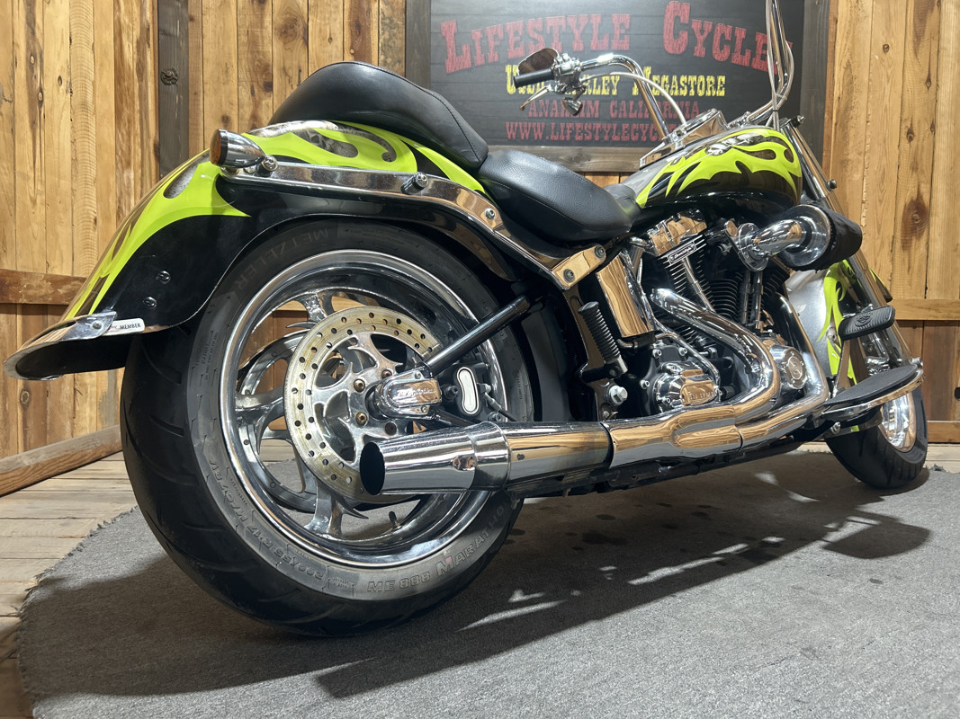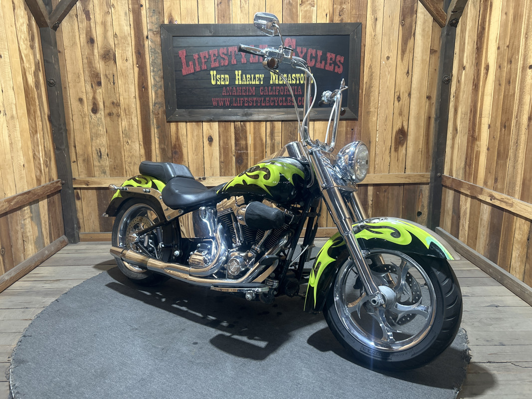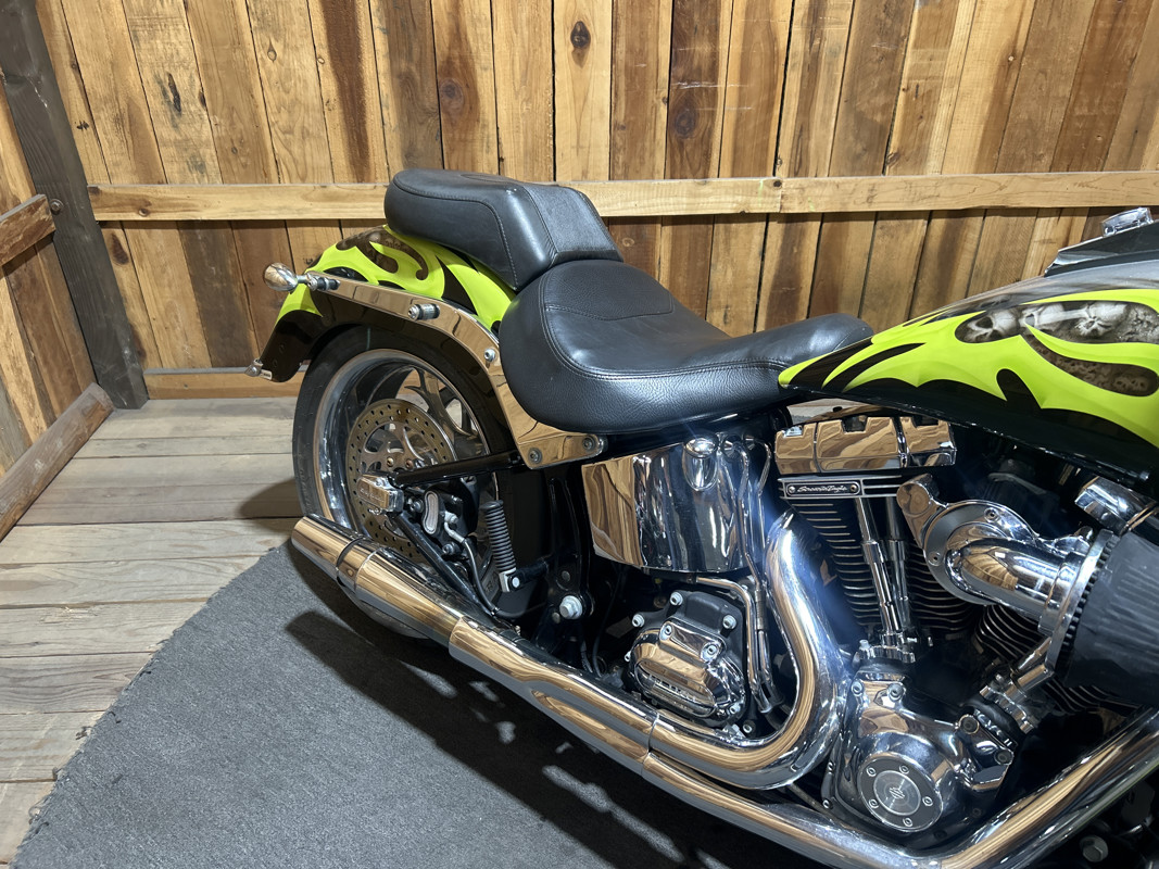 * Custom Paintjob with Black, Green Tribal, and Silver Base Color * Screamin Eagle Twin Cam Motor * 6 Speed Transmission * 14-inch Chrome Ape Hanger Handlebars * Chrome Front and Rear Wheels * Stainless Steel Braided Cables * Stock Solo Seat with Detachable Passenger Seat Pad * 4 Point Docking Hardware * Chrome Flush Mount Gas Cap * Stock Rider Floorboards and Passenger Foot Pegs