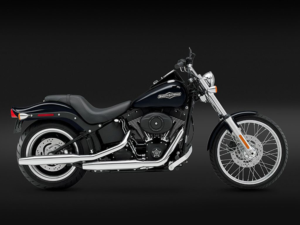 The sinister FXSTB Night Train™ features an all-black powertrain with wrinkle-black trim on the engine covers and air cleaner, oil tank and rear fender supports, and a black fuel tank console. The raked-out FX front end and narrow 21-inch laced front wheel contrast with a meaty 200 mm rear tire on a slotted cast disc covered with a wide bobtail fender.