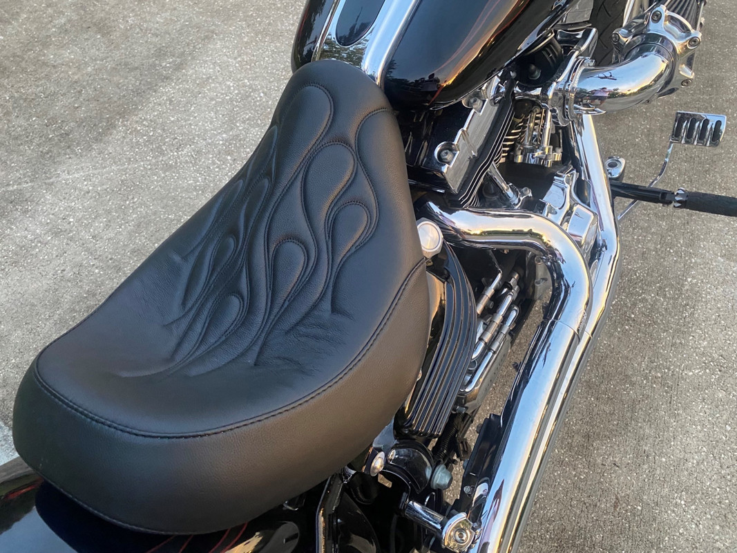 New Danny Grey seat with flame stitching to match gas tank