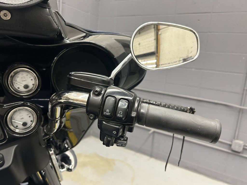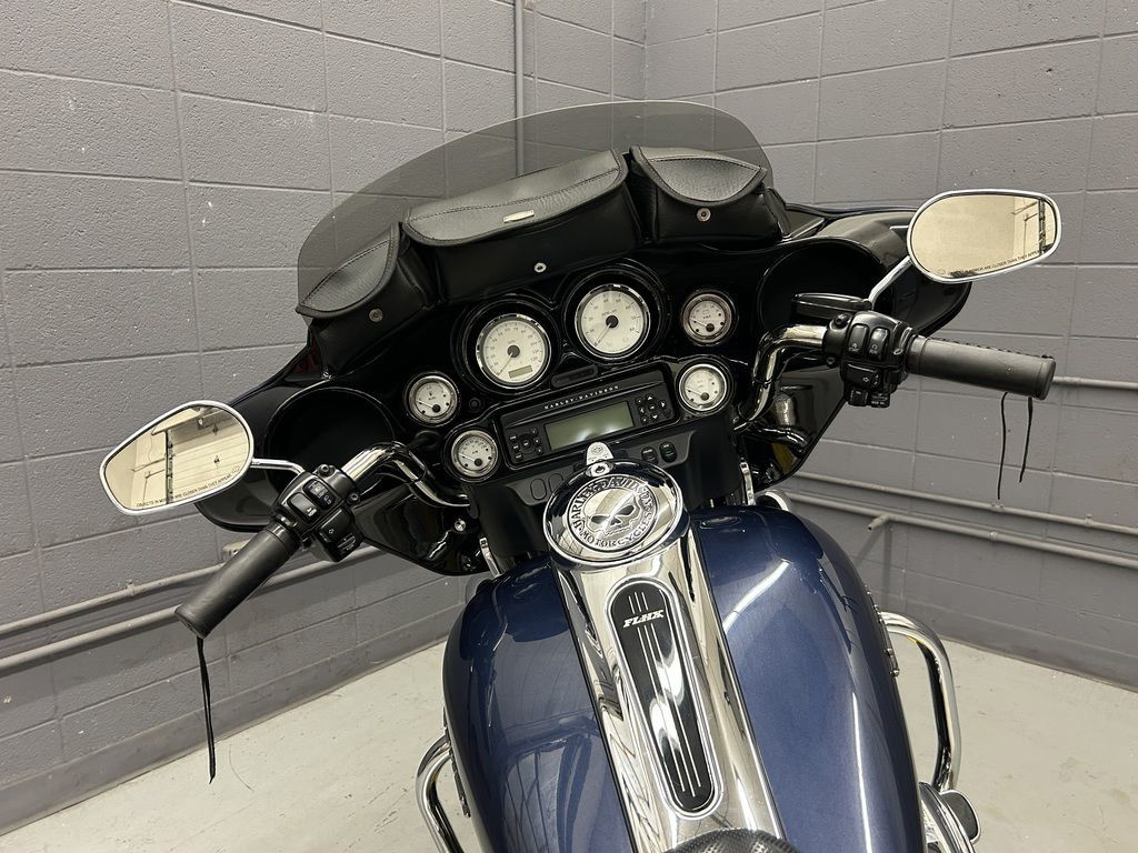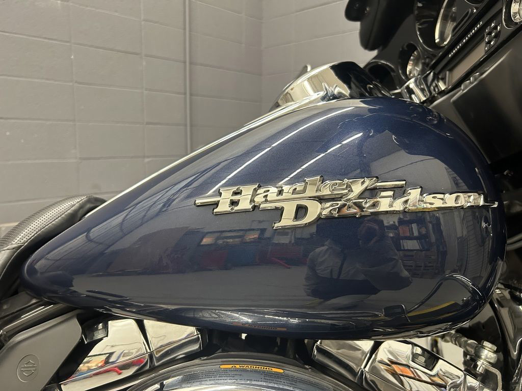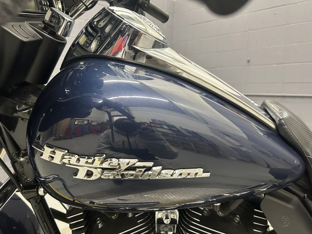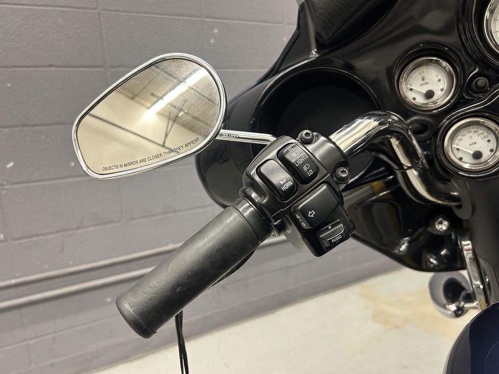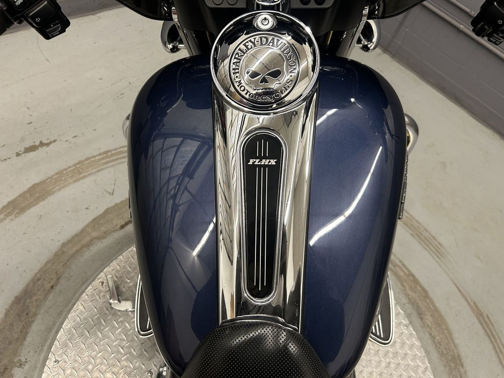 A custom for the long haul, the FLHX Street Glide® offers the comfort and function of a dresser with stripped-down styling. Lowered rear suspension, a smoked mini-wind deflector, and Tri-line LED lighting at the bottom of the rear fender gives the Street Glide® a low, lean profile. A traditional "bat wing" fairing holds a 40-watt Advanced Audio System by Harman/Kardon®, while a new, shorter antenna streamlines the look.