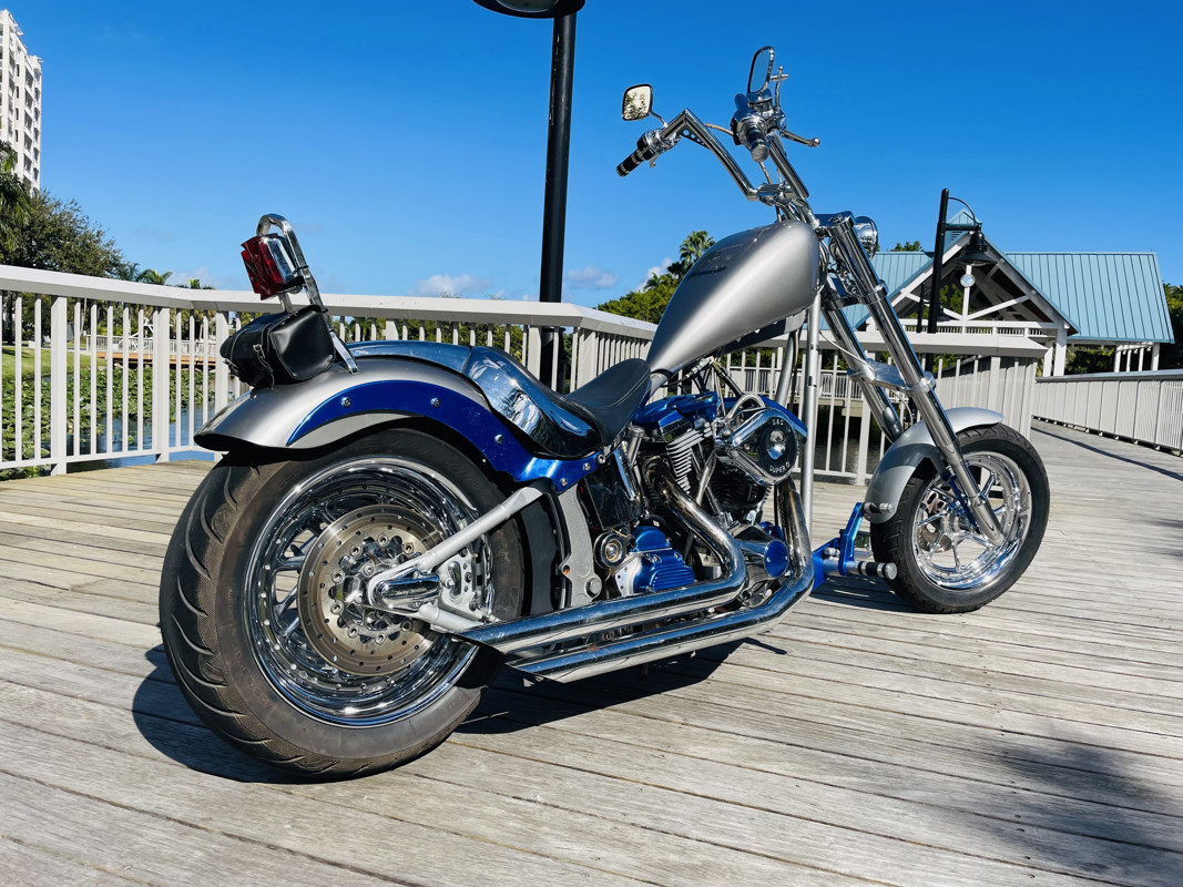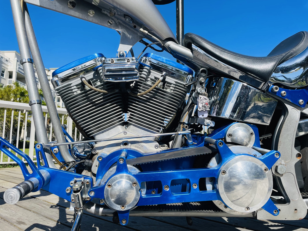 This bike is a true one-built chopper. The frame is a Southwest Customs frame with an unknown engine and lots of Harley parts were used. The wheels and seat are from a 2005 Fat Boy CVO, tons of other parts added from other sources. We got the bike running properly, installed a new belt, checked through the systems and here it is. The hand controls are mostly for show and not connected. No turn signals, horn etc. Tires have meat on them. The bike is now in good running condition with the carburetor rebuilt properly and tuned.