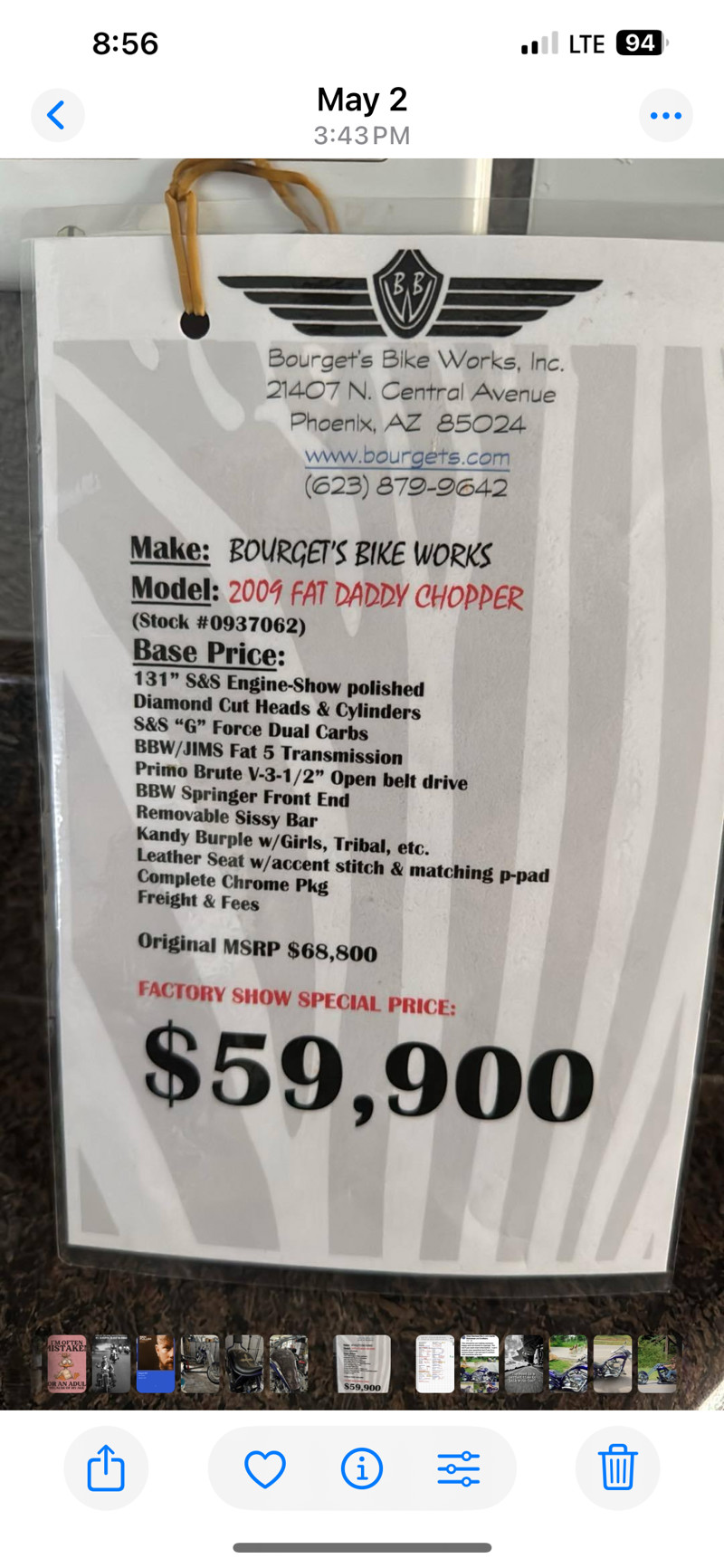 This is not my bike. It is a one owner bike. The owner passed away so I am helping the family sell it. Contact me with any questions and I will answer them the best that I can or I will get the answer for you. Bourget’s Bike Works values the bike in the 30’s but for quick sale due to moving asking $15,000