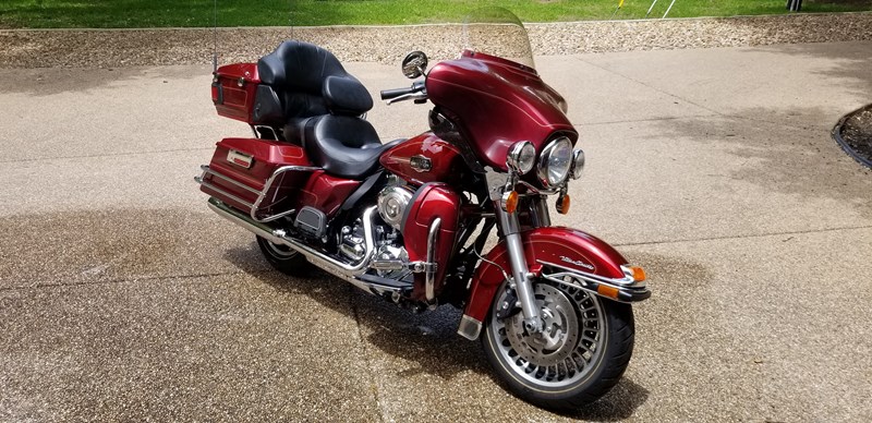 Ultra Classic Electra Glide (FLHTCU) with 3,433 miles. Yes, less than 3,500 miles!!! Red (Sunburst). Seller also including his and hers HD helmets, HD travel bags, HD tool kit, HD audio & intercom headset and cover. Driver and passenger foot rests. Some custom chrome parts. Owner saved and will provide original parts with sell. AM/FM Radio w/single-disk CD player.