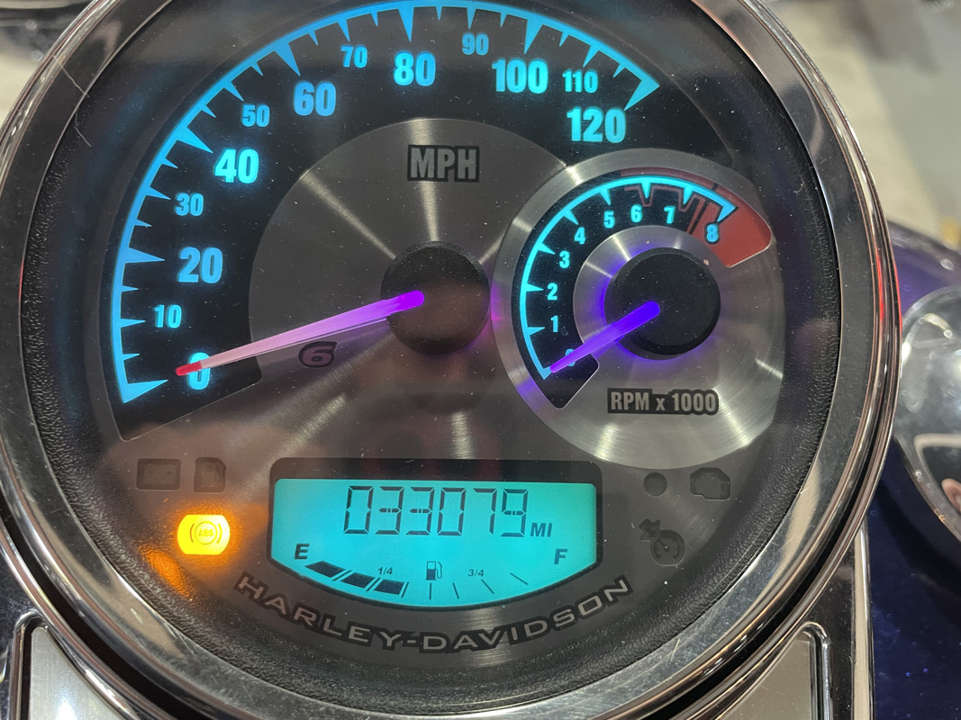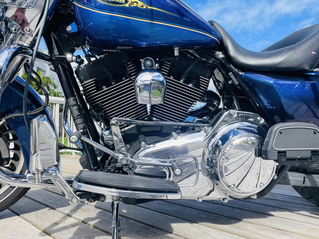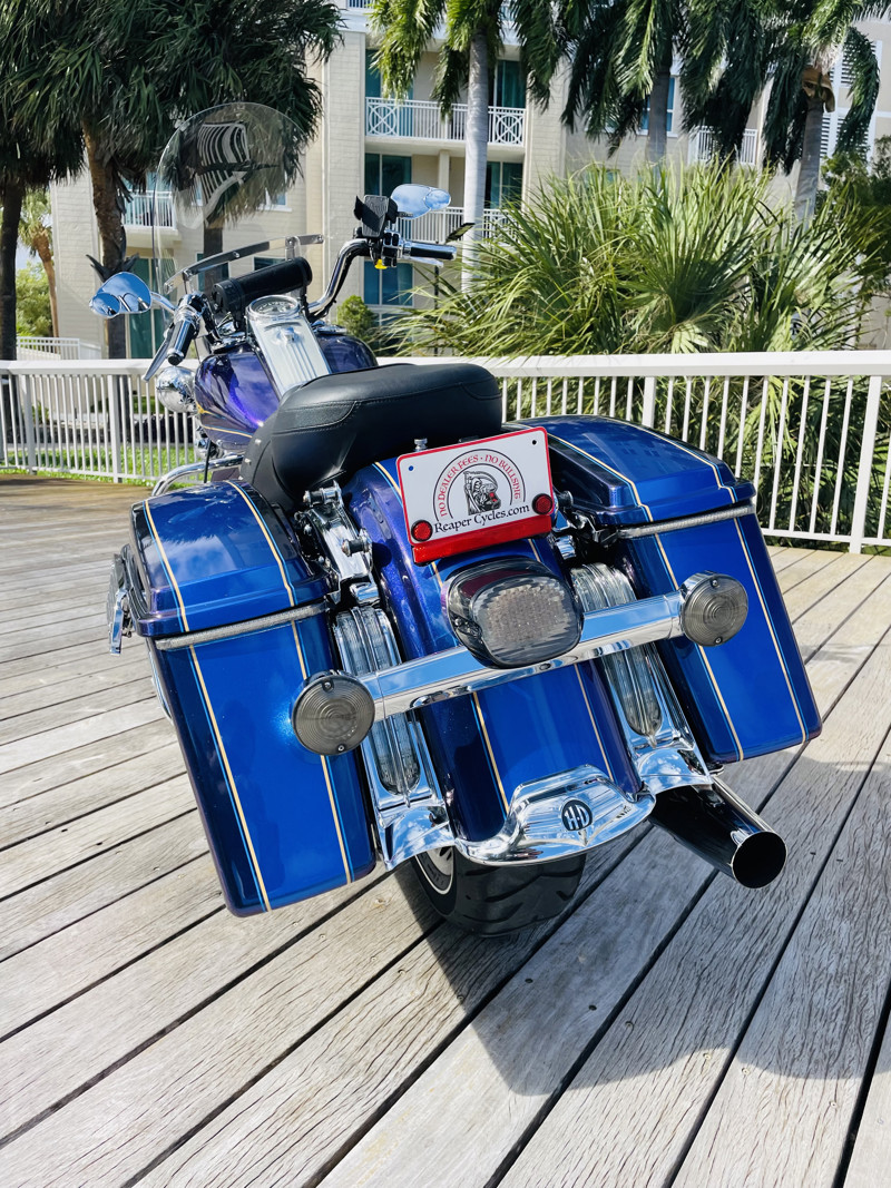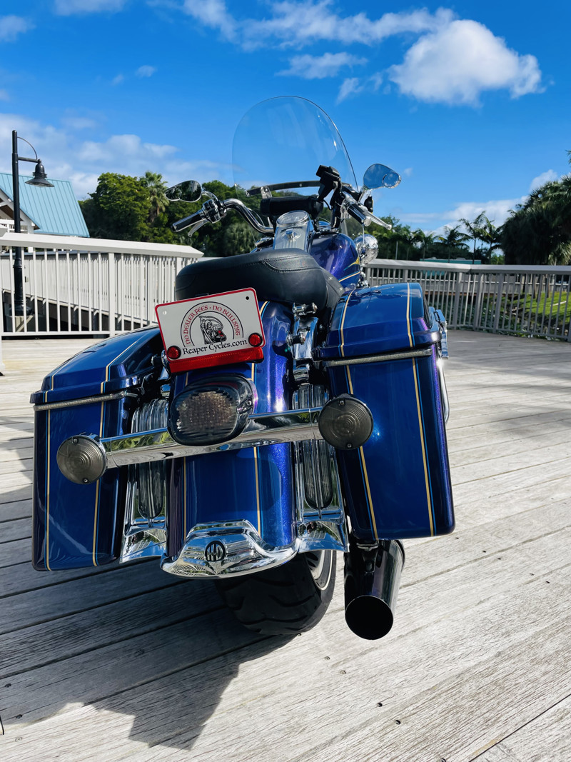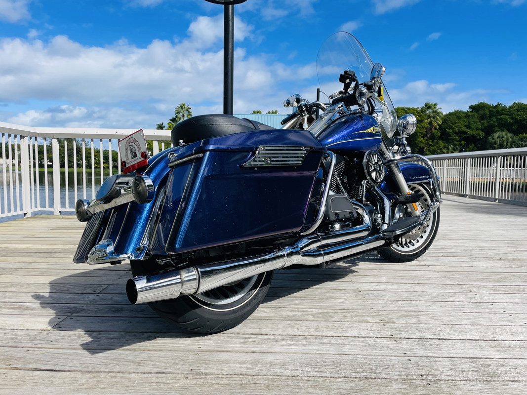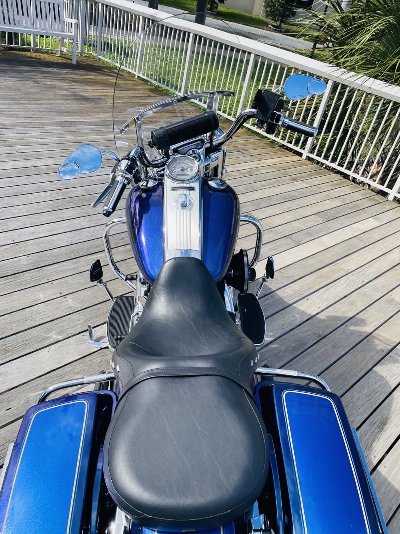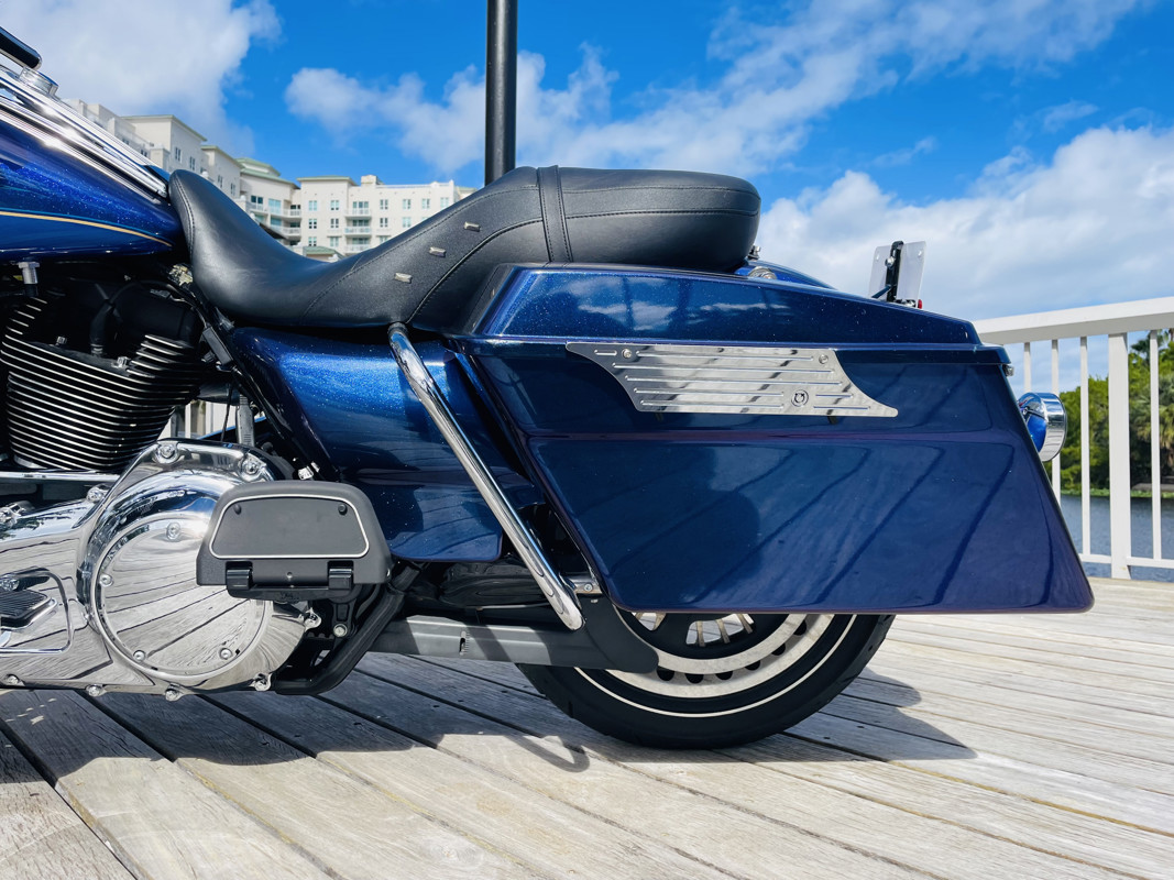 There are certain color combinations that are stunning. “Black Ice Blue Ice” is the combo for this one. This is a quarterly paint color so it was only offered for 3 months from HD as a custom color option. The bike is nearly flawless. With the typical lower front showing the pitting and a small tear on the seat, easily replaced the bike is otherwise perfect. Clearly loved through its life with several nice upgrades. LED lights all around, some chrome upgrades and a two in one exhaust system with air cleaner. You want perfect, here she is.