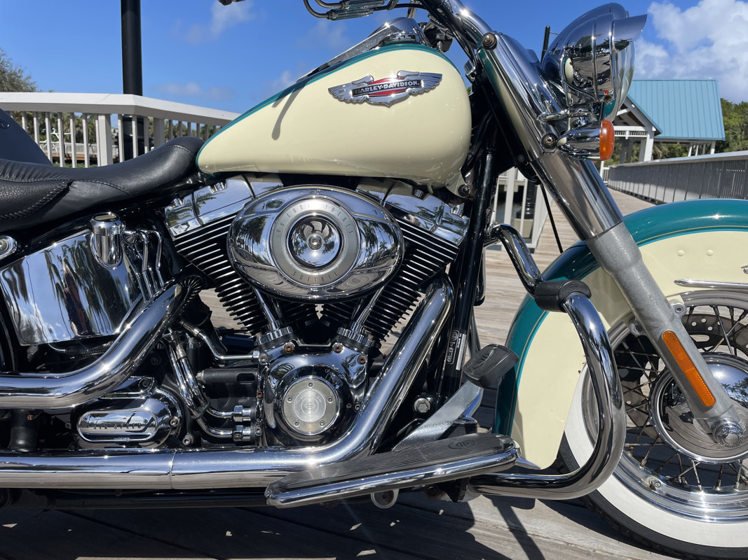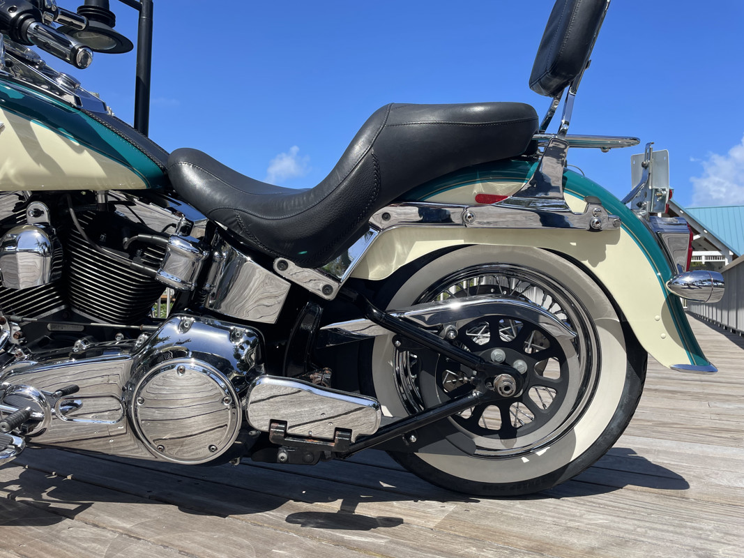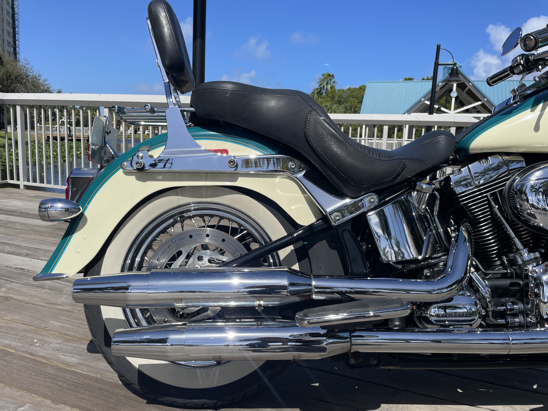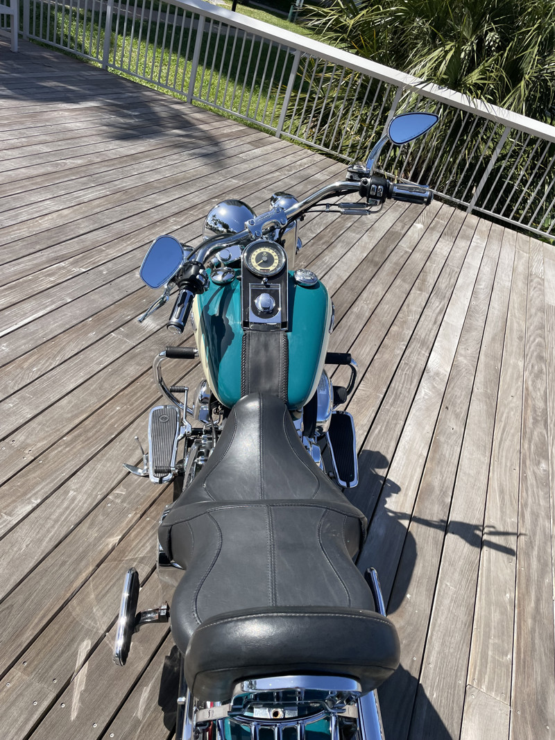 This color combo is not just amazing but stunning. The bike has been ridden extensively by someone or someone installed a second used speedometer/odometer with higher mileage. Between 2011 and 2019 someone added a stunning 82,000 miles to the clock. Clearly proof that Harley motors are durable without a doubt. Since the tires are from 2016 it makes me question if the replacement odometer is not really an option since those 82K would have been added between 2011 and 2016. There are the typical flaws you should expect on a 17 year old bike but the paint is still in amazing condition and the two tone “deep turquoise with antique white” brings back the 50s flair of the Deluxe like no other bike in the HD lineup can.