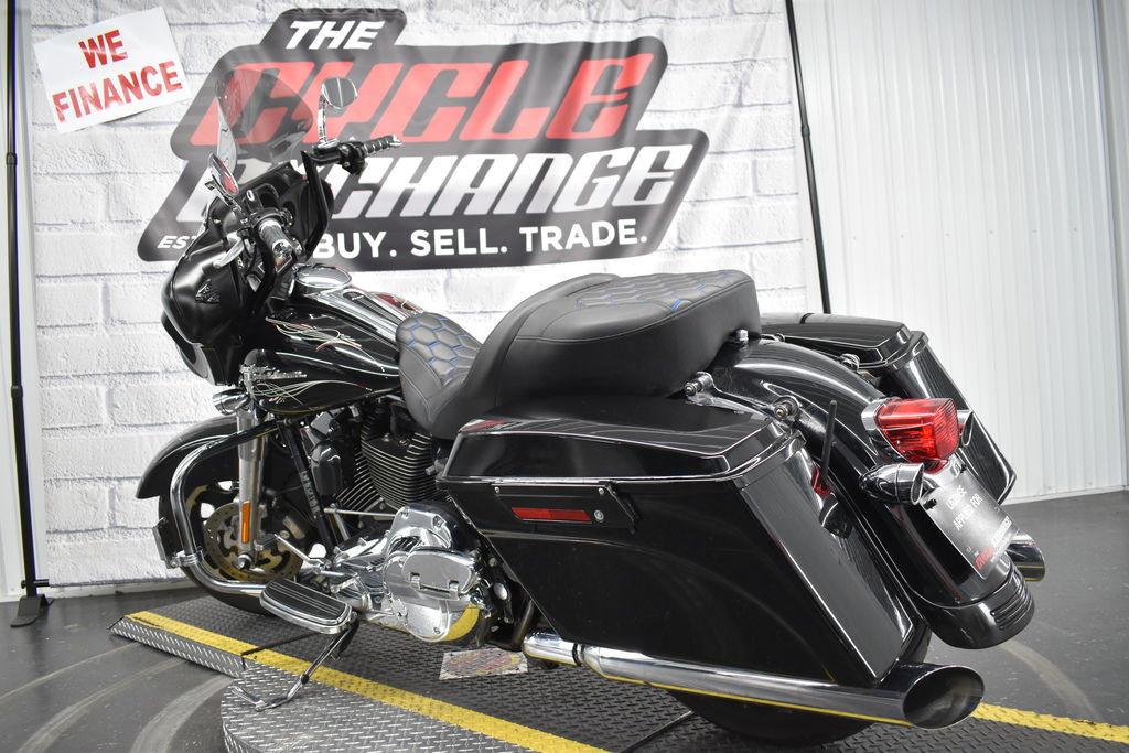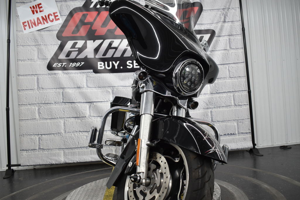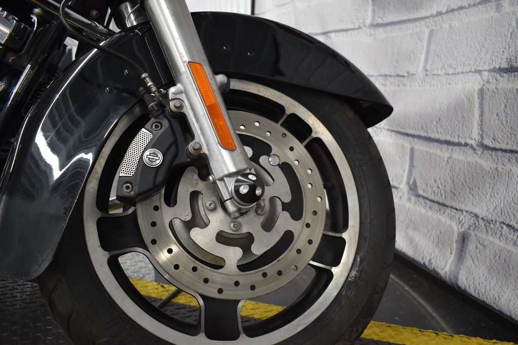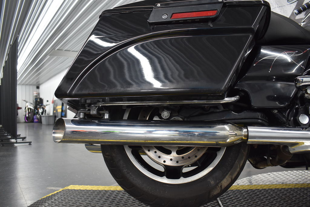 A stylishly stripped-down dresser, the Street Glide® features lowered rear suspension, a smoked mini-wind deflector, and Tri-line LED lighting at the bottom of the rear fender for a low, lean profile. A traditional “bat wing” fairing holds a 40-watt Advanced Audio System by Harman/Kardon®. A stretched, chrome fuel tank console and Streamliner footboards, brake pedal and passenger pegs finish the custom treatment. Newly restyled Black Slotted Disc cast aluminum wheels are exclusive to the Street Glide®. A new low-mount license bracket locates the plate below the tail lamp, with new LED illumination.