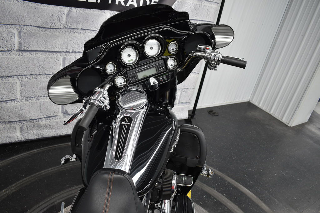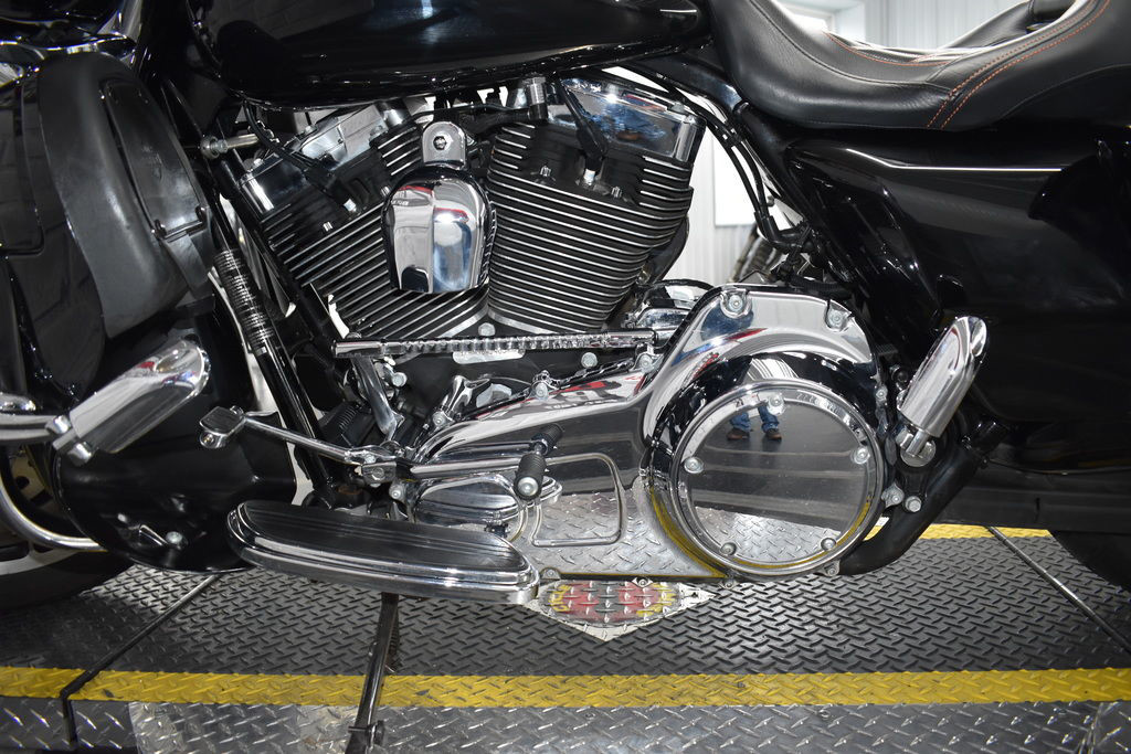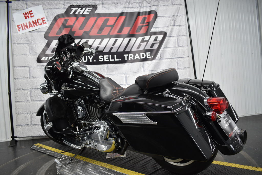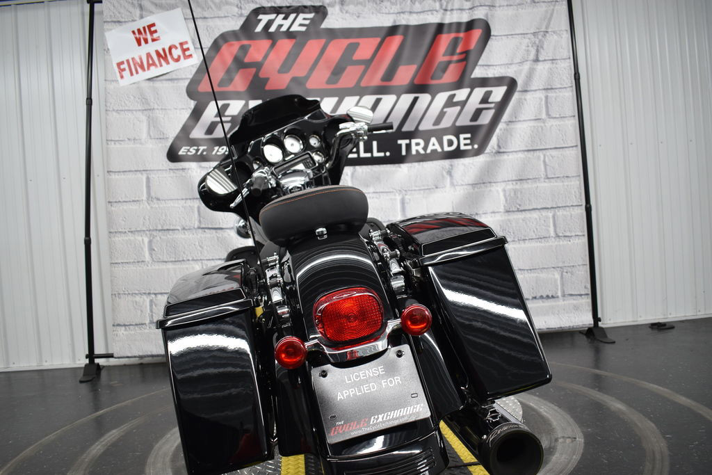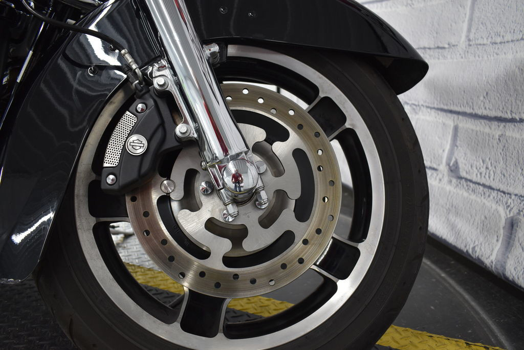 A stylishly stripped-down dresser, the Street Glide® features lowered rear suspension, a smoked mini-wind deflector, and Tri-line LED lighting at the bottom of the rear fender for a low, lean profile. A traditional “bat wing” fairing holds a 40-watt Advanced Audio System by Harman/Kardon®. A stretched, chrome fuel tank console and Streamliner footboards, brake pedal and passenger pegs finish the custom treatment. Newly restyled Black Slotted Disc cast aluminum wheels are exclusive to the Street Glide®. A new low-mount license bracket locates the plate below the tail lamp, with new LED illumination.