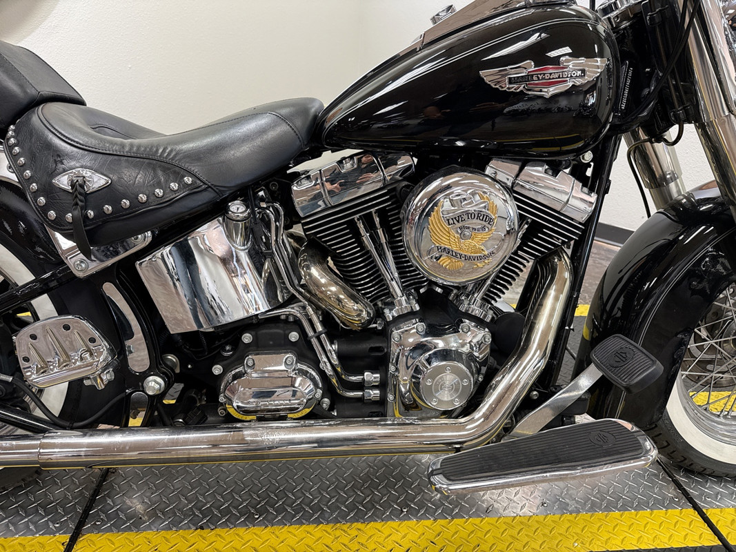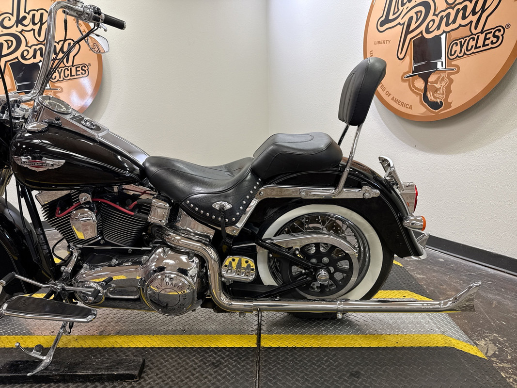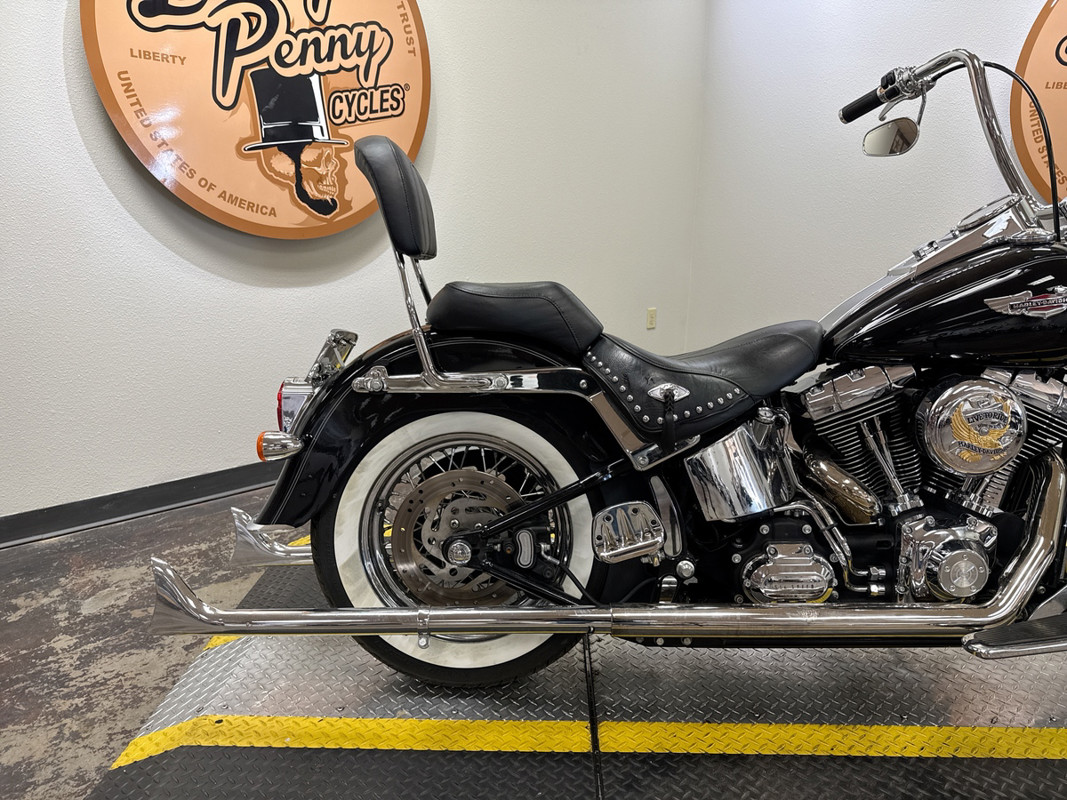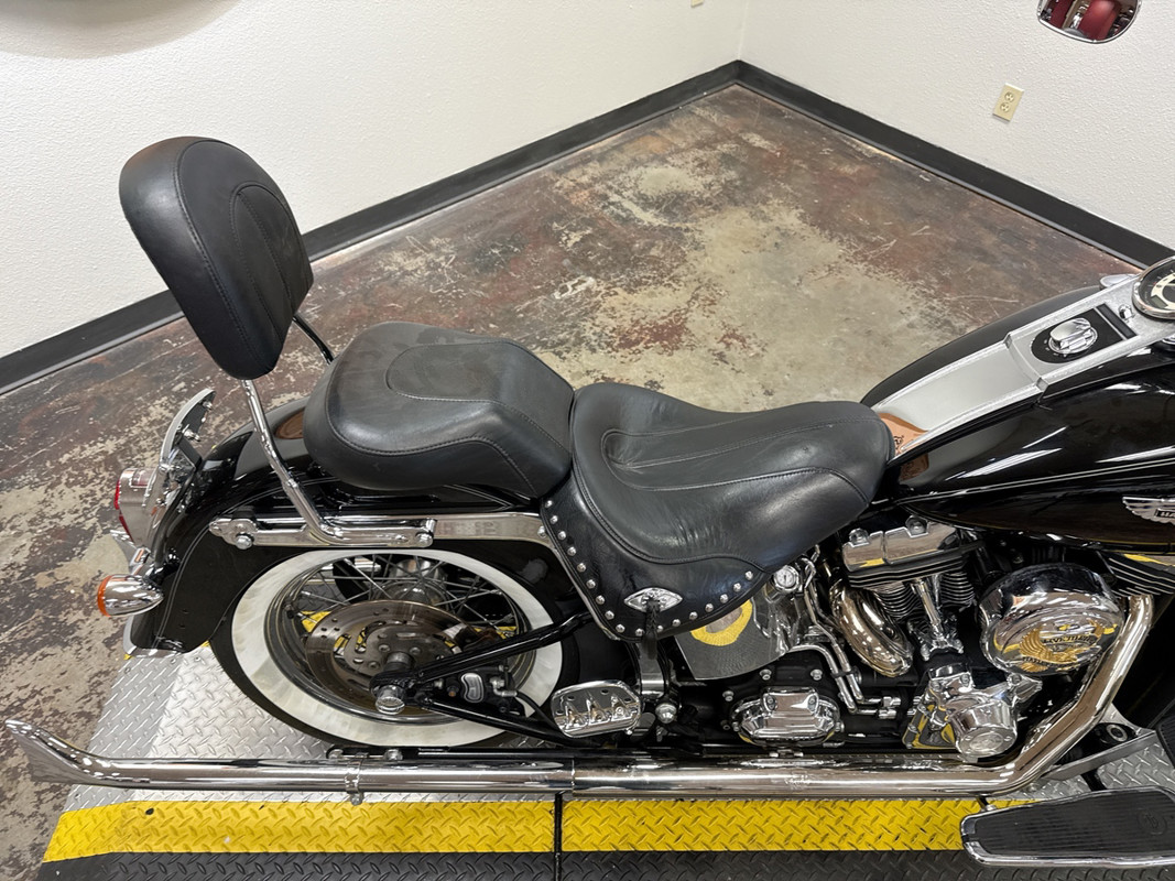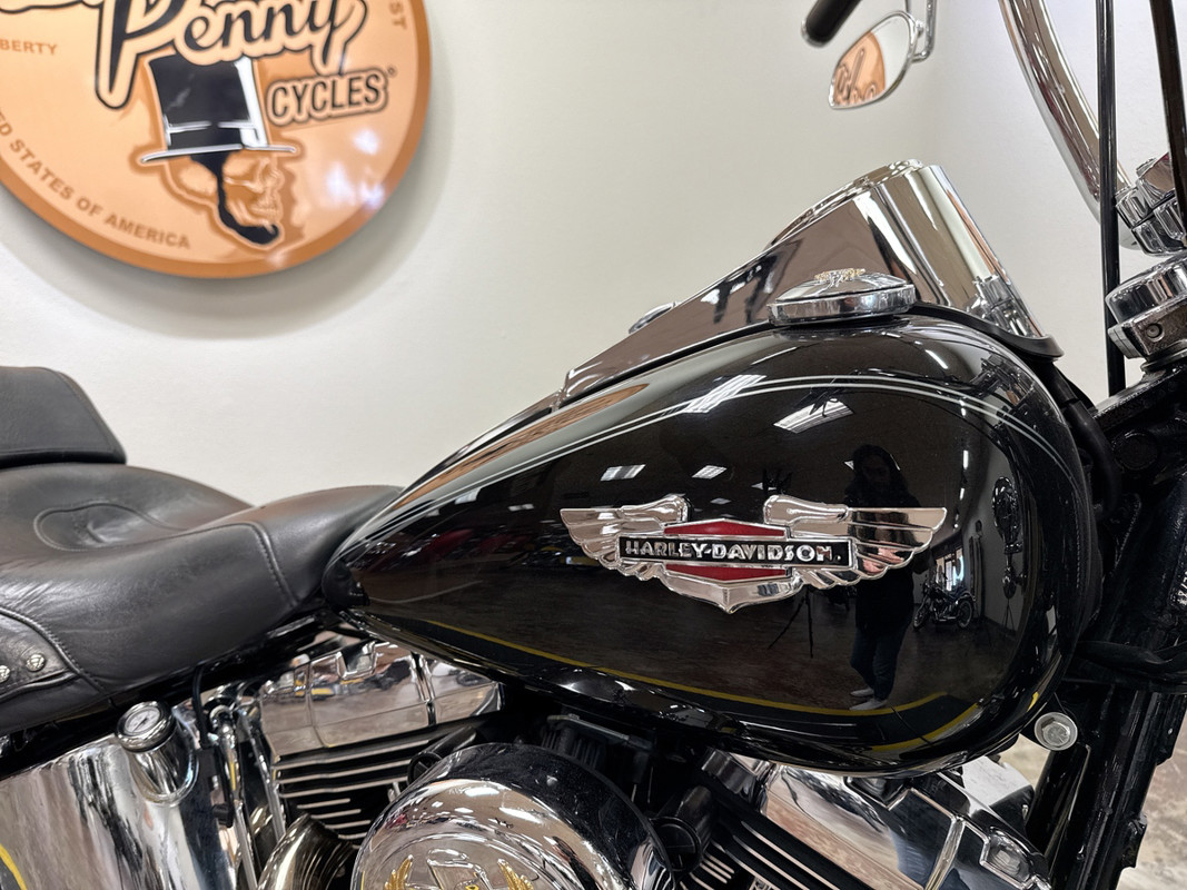 This 2010 Harley-Davidson FLSTN Softail Deluxe is finished in a sleek black with pinstripe, powered by the reliable Twin Cam 96 engine. The Deluxe is known for its vintage-inspired styling, and this one takes it to the next level with its custom touches.