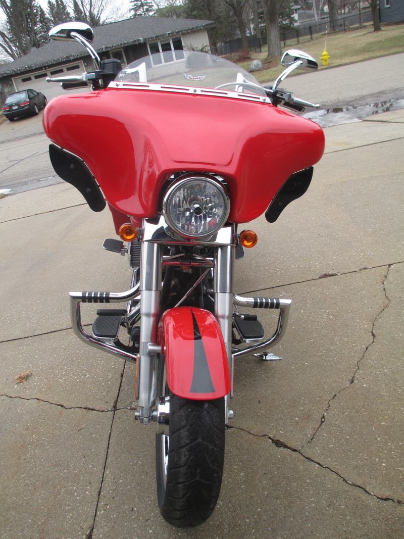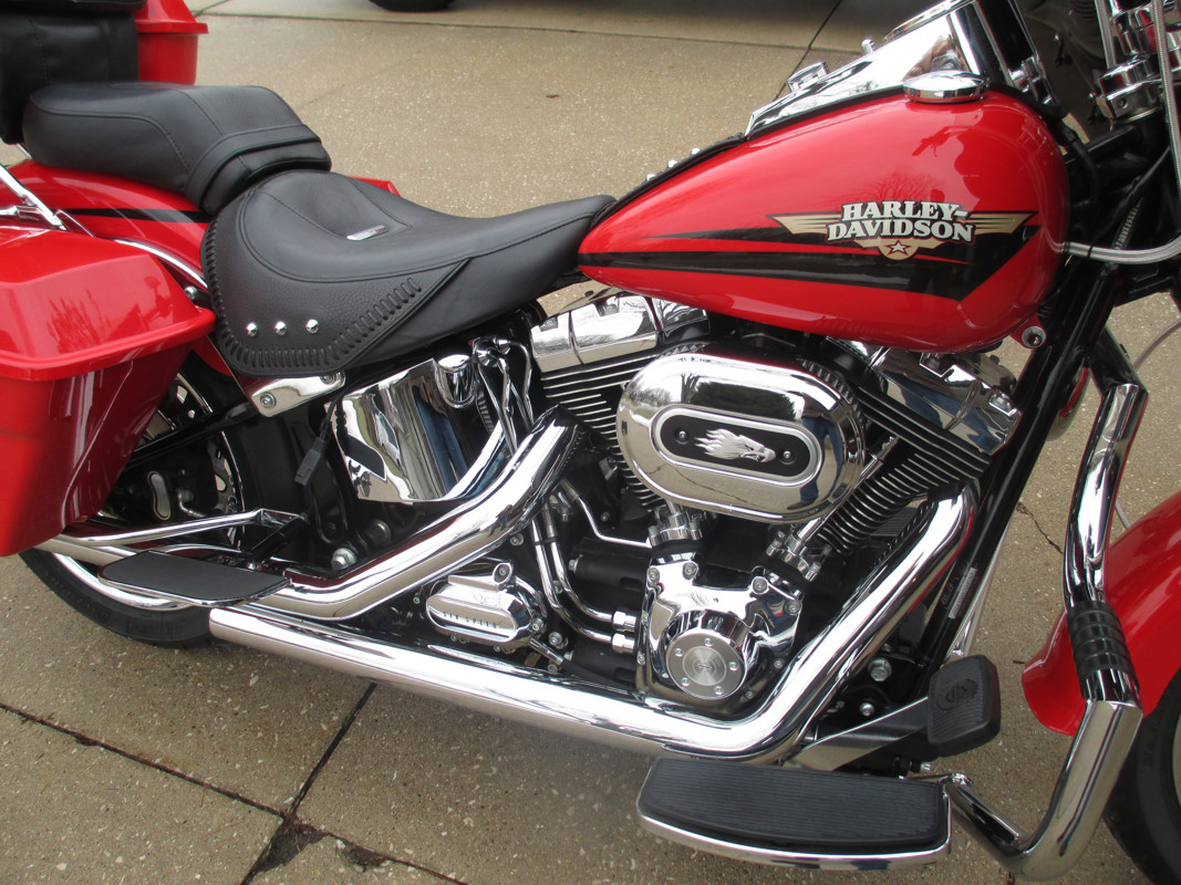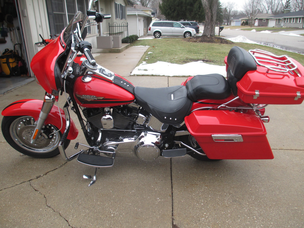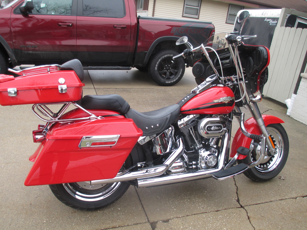 Beautiful 2010 Red Fat Boy Bagger with only 6310 Miles. Fairing, Radio, HD Teardrop mirrors, 12" Bars with heated grips, braided cables, Fat Lindby bar, rear floorboards, HD bags and cycle visions mounting hardware, HD Razor tour pack with luggage rack and back rest, lighted air wing, screaming eagle air cleaner, Vance and Hines pipes and tuner. Original exhaust available. Excellent value.