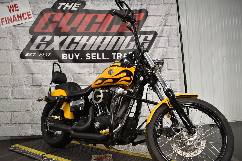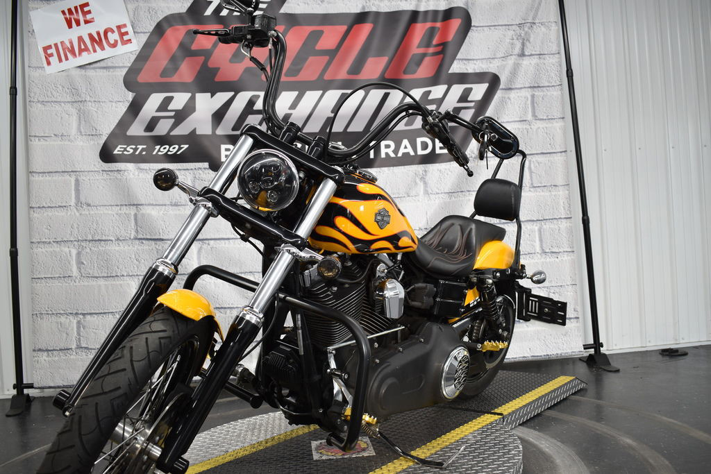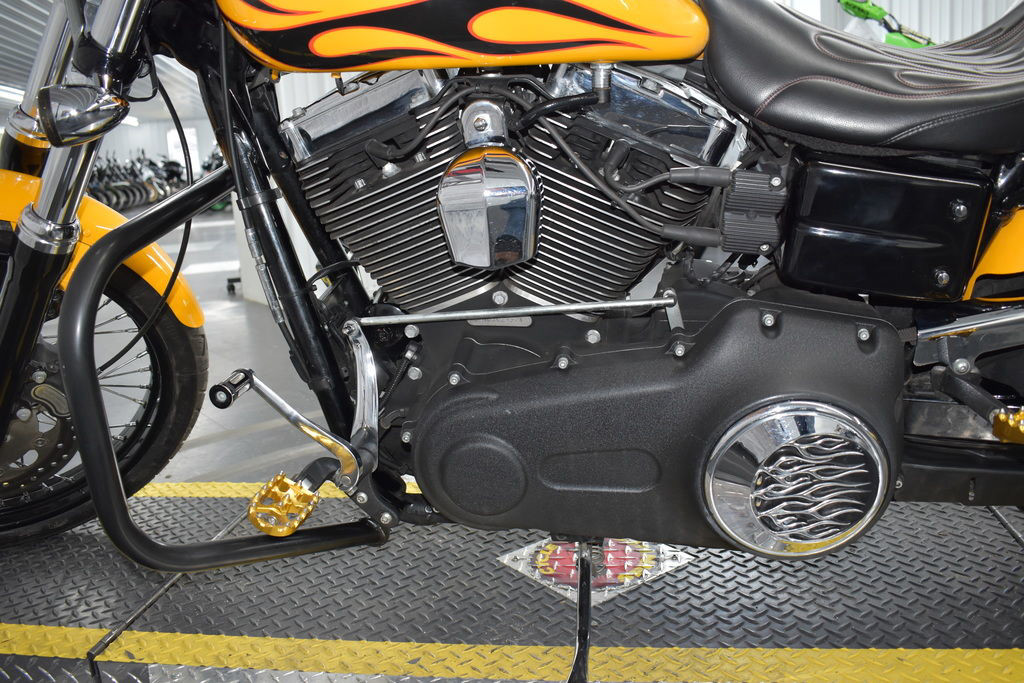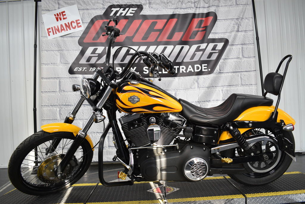 The 2011 Harley-Davidson® Dyna® Wide Glide® FXDWG is full of classic chopper motorcycle style. In front is a long and raked out fork with a 21 inch wheel, giving this model quintessential chopper motorcycle style. And in the back, the Harley® Wide Glide® features a side mounted license plate for added custom chopper motorcycle style. Want even more factory custom style on your chopper motorcycles? This bike also features an optional classic flame design on the fuel tank. Select the flames on the Harley-Davidson® Wide Glide® chopper motorcycle for a factory custom look at an affordable Harley® price.
