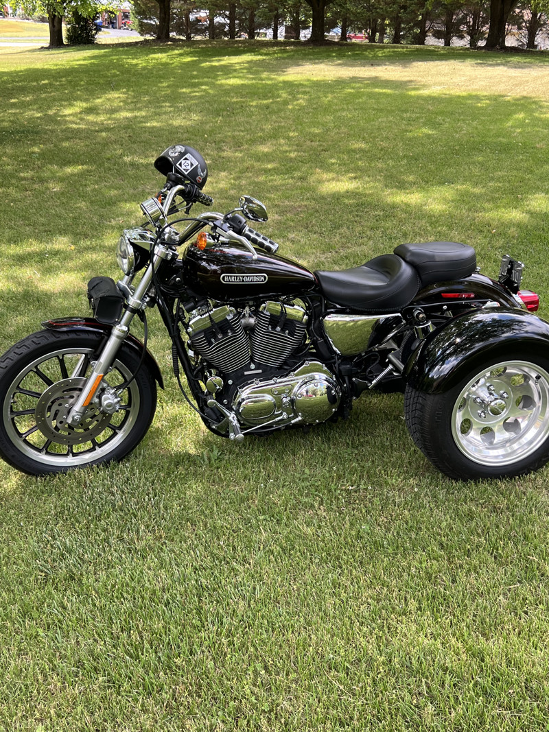 1200 Sportster with a Frankenstein Trike kit, Tuner, lots of Chrome, V&H Shorty exhaust . Mustang seat. It’s fast, fun to Ride