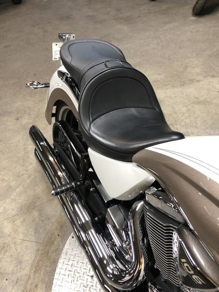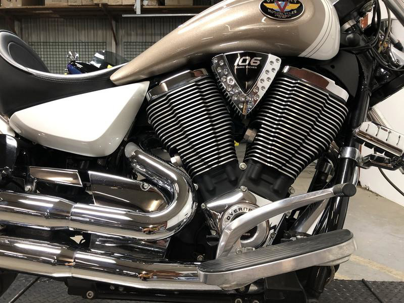 The Victory Kingpin adds more force to its flair. The classic cruiser not only powered up with our all new 106 cubic-inch Freedom V-Twin, it also added an all-new 100k transmission. It joins our other models in performance prowess while keeping its one-of-a-kind, flared fender style. Everything you want in a classic cruiser.