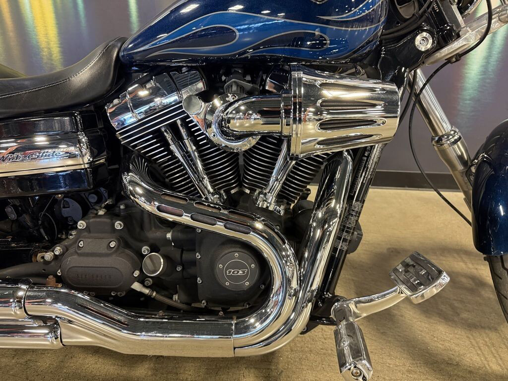 The 2012 Harley-Davidson Dyna Wide Glide FXDWG is full of classic chopper motorcycle style. New for 2012, the Harley Dyna Wide Glide features a new larger air-cooled Twin Cam 103 Harley engine with 6 speed cruise drive tranmission, providing more power for passing, hill-climbing, and riding with passenger and cargoIn front is a long and raked out fork with a 21 inch wheel, giving this model quintessential chopper motorcycle style. And in the back, the Harley Wide Glidefeatures a side mounted license plate for added custom chopper motorcycle style. Want even more factory custom style on your chopper motorcycles? This bike also features an optional classic flame design on the fuel tank. Select the flames on the Harley-Davidson Wide Glide chopper motorcycle for a factory custom look at an affordable Harley price.
