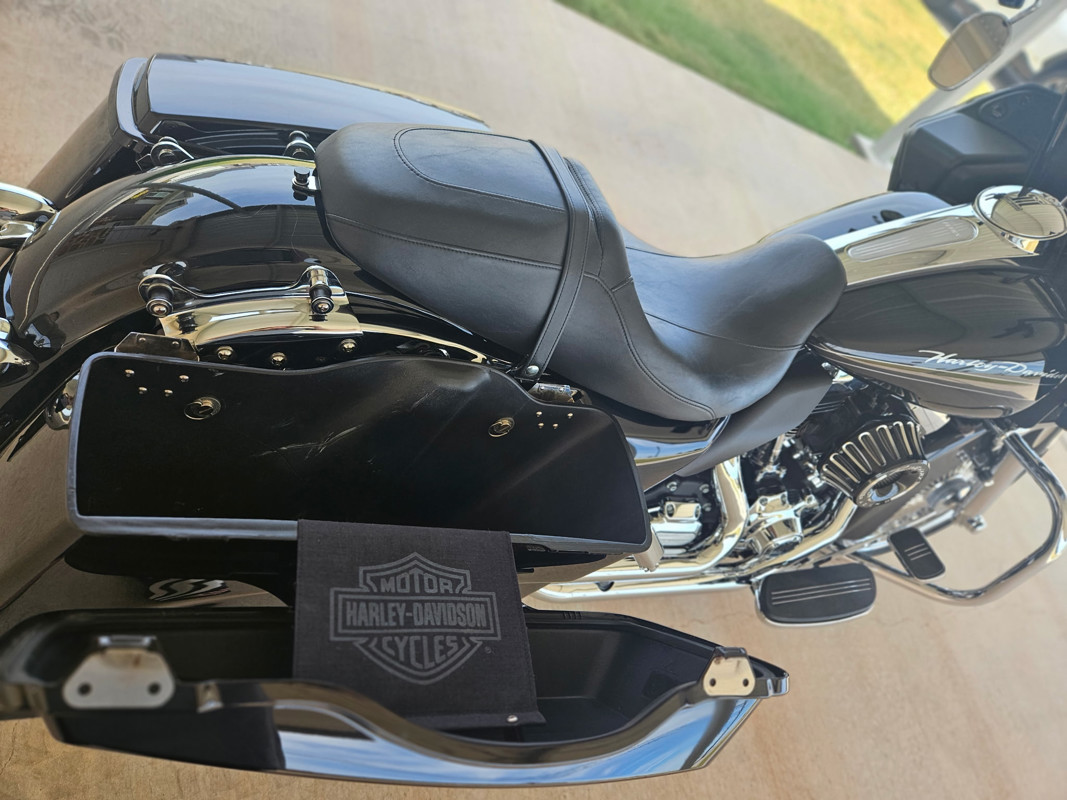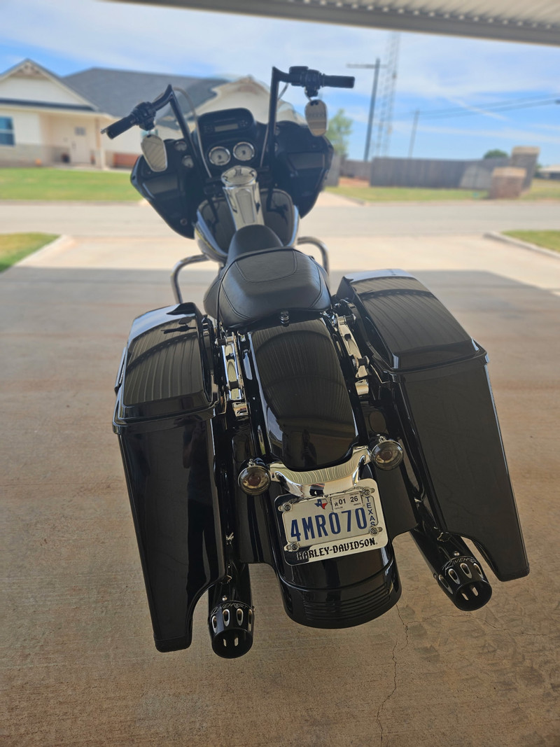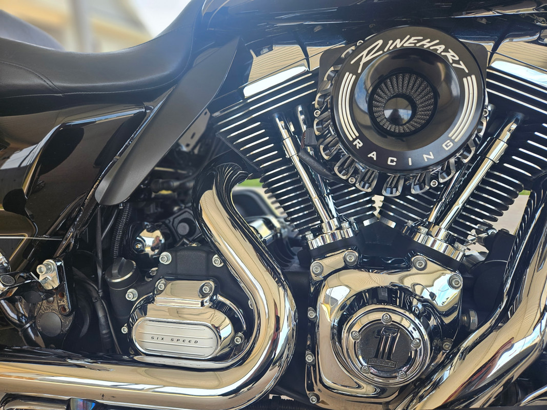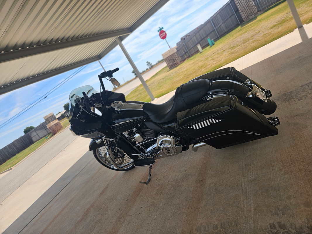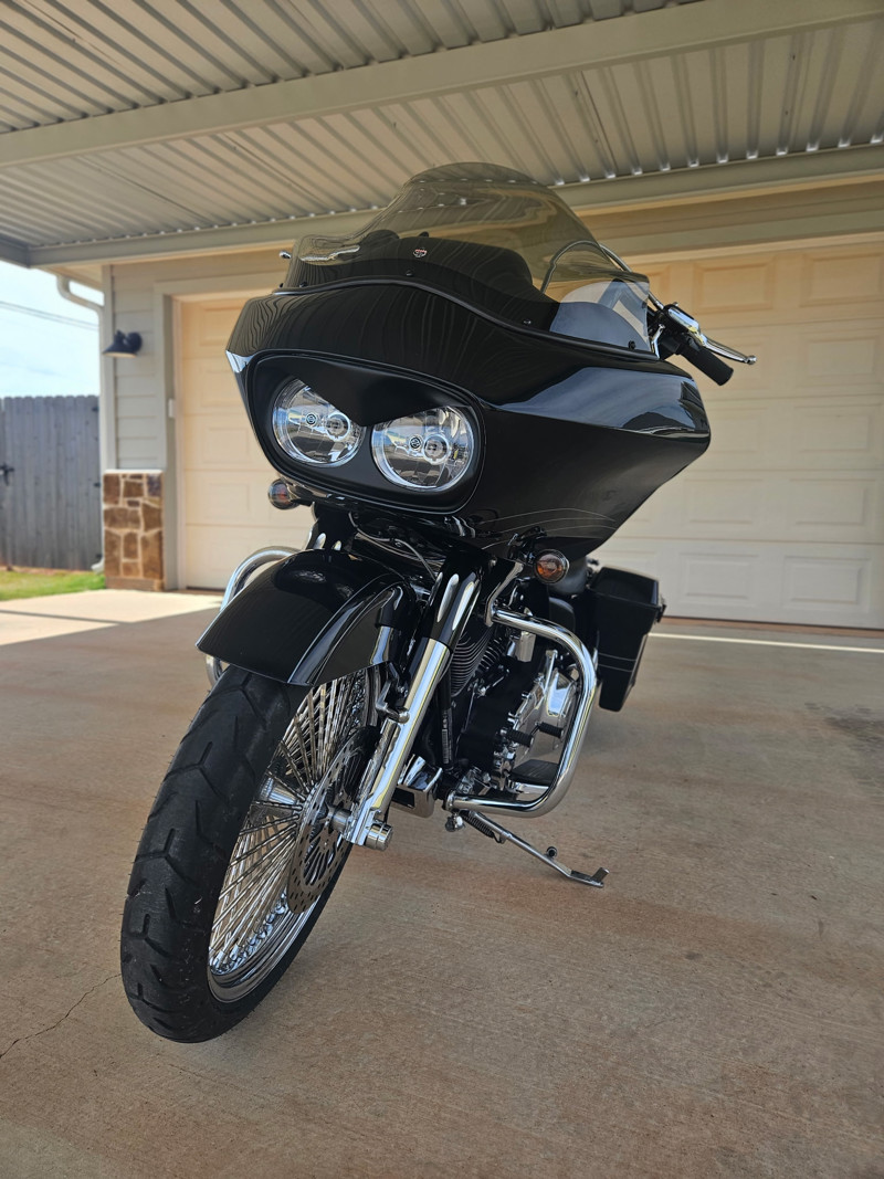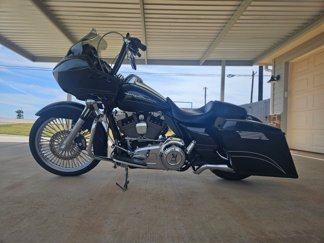 Garage kept and covered. Mammoth 21-inch front diamond spoke wheel with conversion to one brake caliper on front. 2 inches lowered in front with Progressive Fork Lowering Spring kit and 2 inches lowered on the rear with lowering brackets. Rinehart Racing Intake and Rinehart Racing True Dual Exhaust with slip-ons. All tuned with Dynojet PowerVision tuner. Paul Yaffe 14-inch gloss black handlebars with Arlen Ness grips. Stretched saddlebags painted to match with pin stripping and bottom portion sprayed with Rhino Lining for protection. LED bulb headlights. Klock Werks 12-inch Tint Flare windshield. Also, several different custom caps and coverings on bike. Front fender has a dent below the fairing, and the ignition has issues with locking with the key. Other than that, very solid and road worthy.