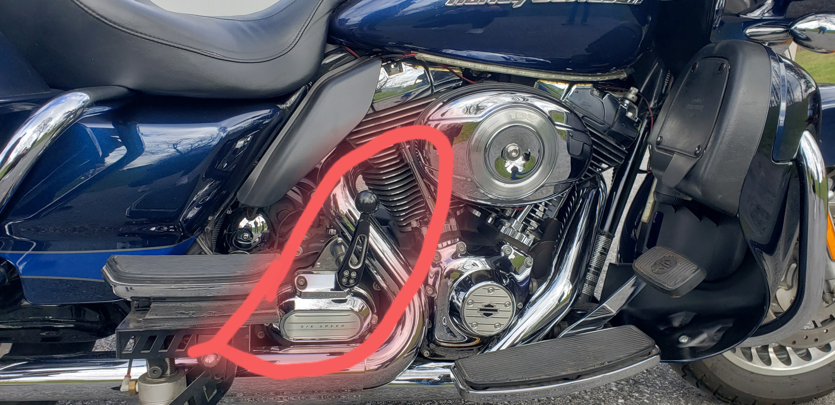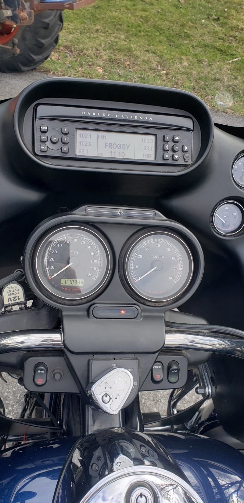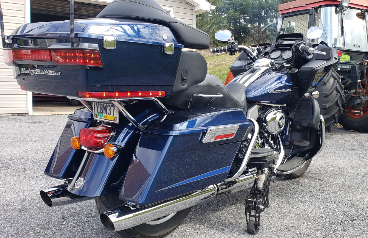 2012 Harley Road Glide Ultra. 103 engine, mechanical reverse circled in red , anti-lock brakes, cruise control, AM/FM/CB/ radio, intercom ready, Leg Up Landing Gear to assist with balance with stops and starts. Factory anti-theft. Keyless ignition. Cover included. Also has blue LED lighting. New oil and filter, and new brakes front and rear.