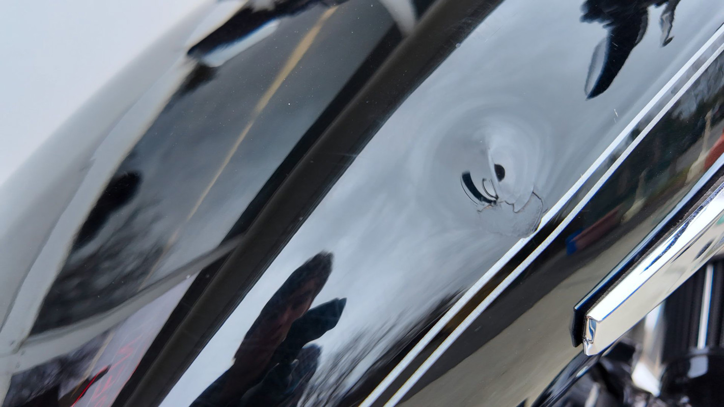 One small ding on the right side of the gas tank (purely cosmetic)