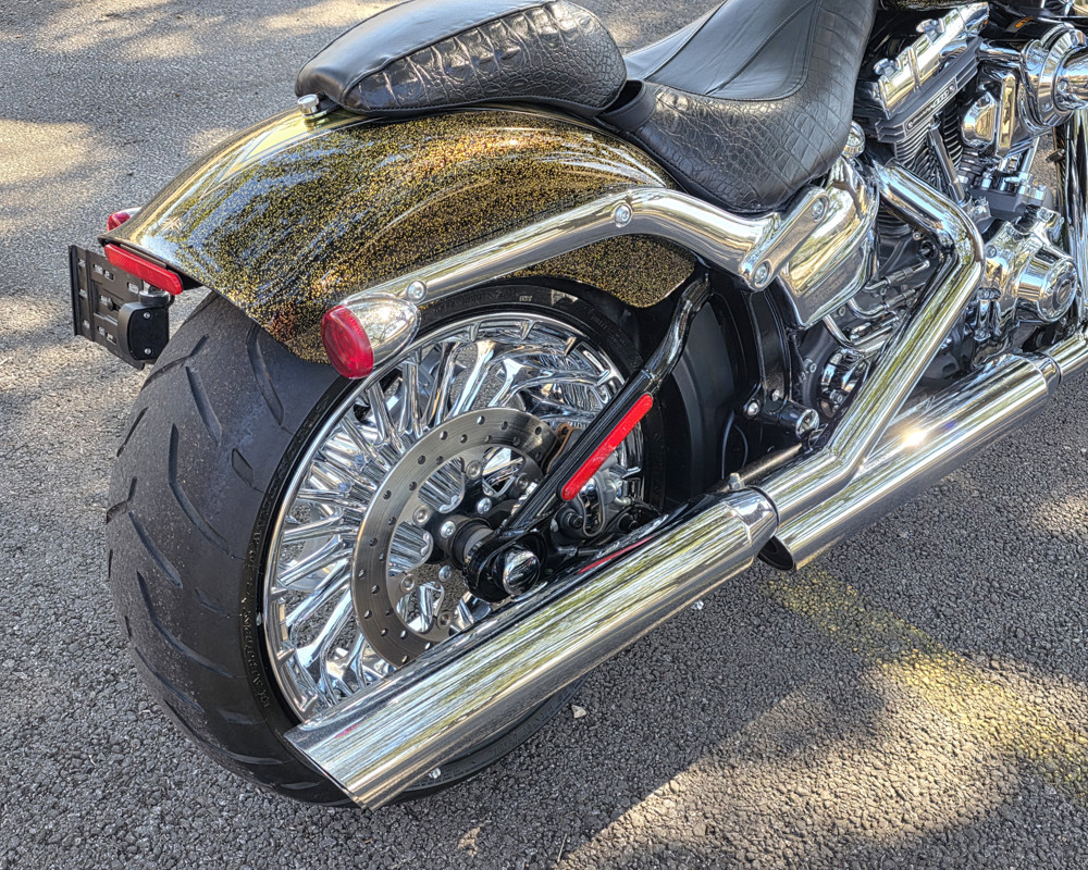 ” Front and rear fenders are each chopped to the legal limit of tire coverage. The front fender location and bracket are specific to the CVO Breakout model. The rear fender is shaped and positioned to fit as close as possible to the 240-mm tire.