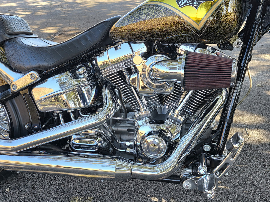 ” One-piece forged aluminum rear fender supports are highly polished. The fender supports and chopped rear fender are four pounds lighter than the forged steel supports and covers used on other Harley Davidson® Softail® models.