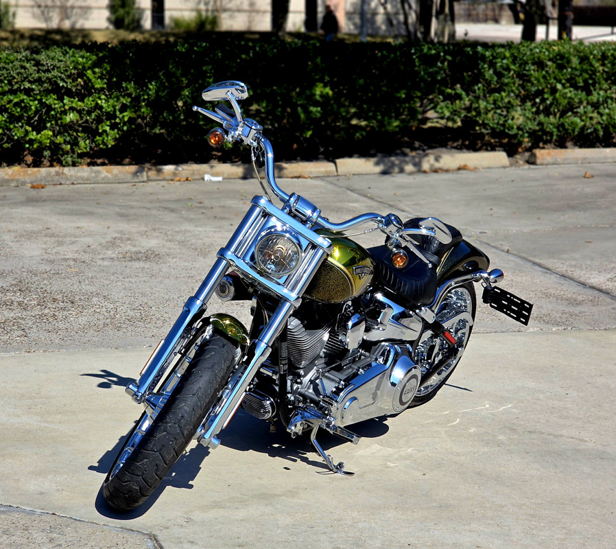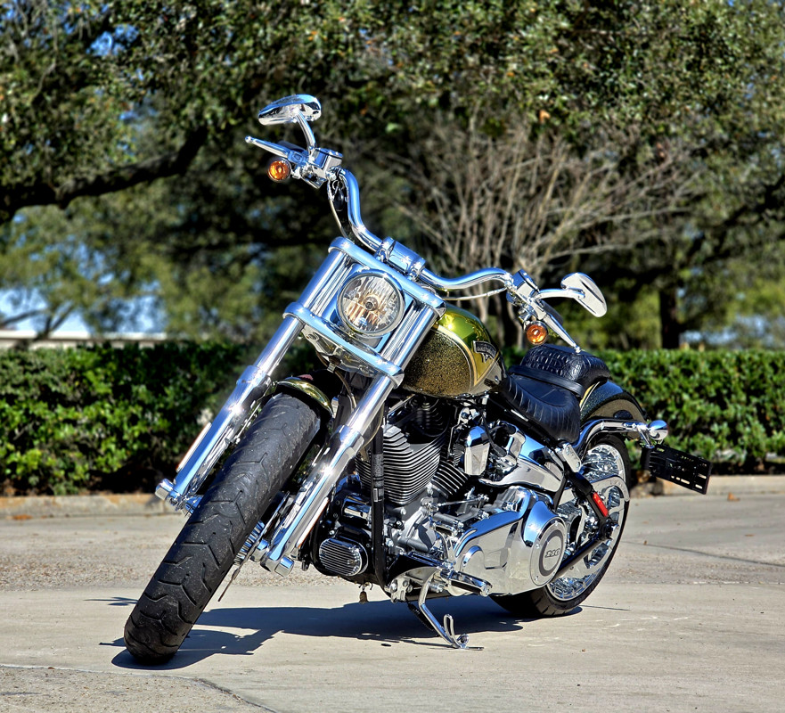 ” The wide front end spreads the forks approximately 1.75 inches wider than previous FX Softail® models to allow fi ent of a 130 mm front tire. The entire front end assembly is chrome plated, including the nacelle and headlamp bucket.