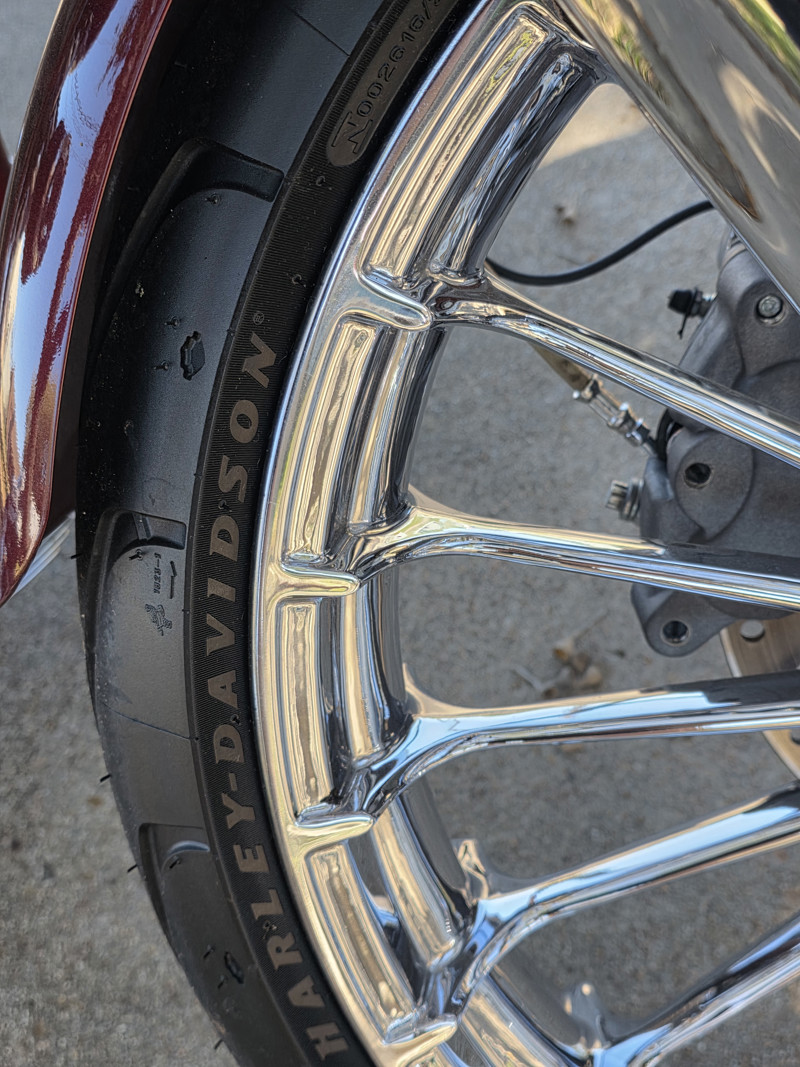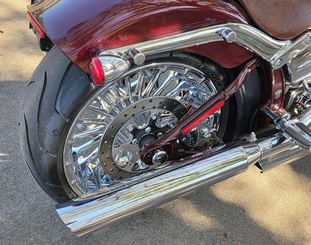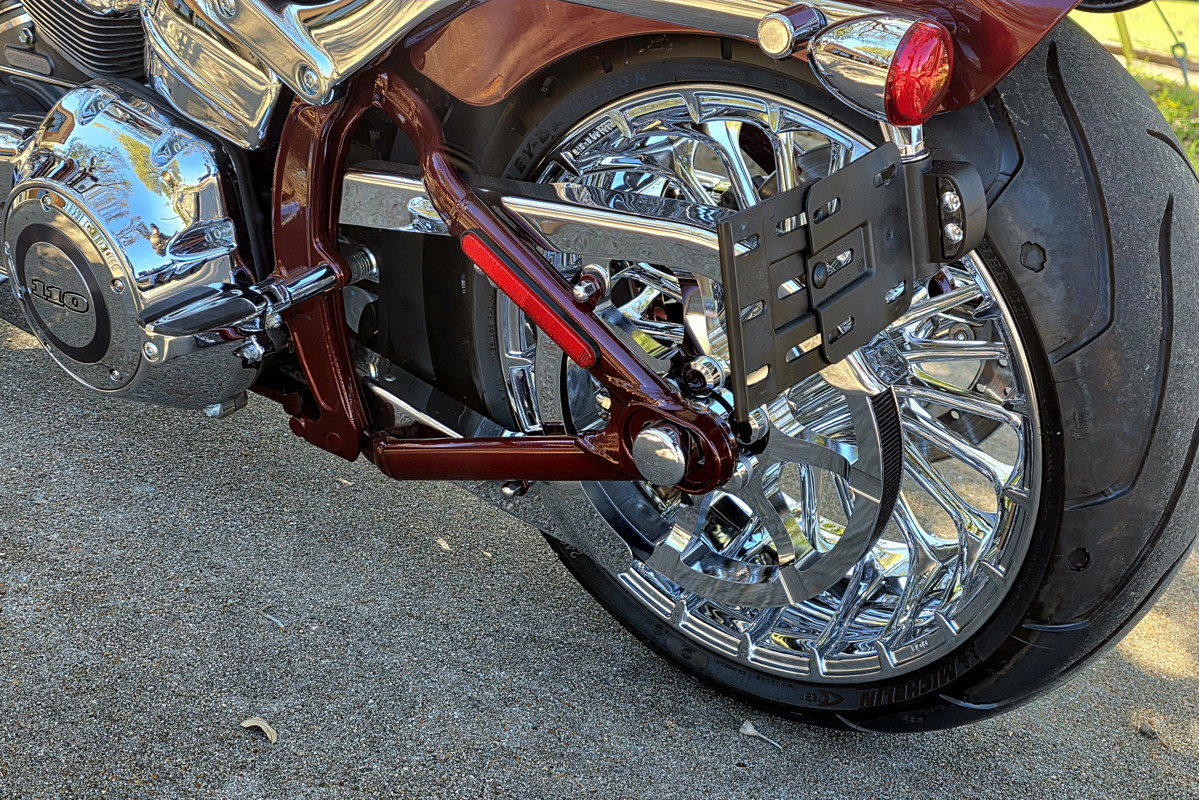 ” Front and rear fenders are each chopped to the legal limit of tire coverage. The front fender location and bracket are specific to the CVO Breakout model. The rear fender is shaped and positioned to fit as close as possible to the 240-mm tire.