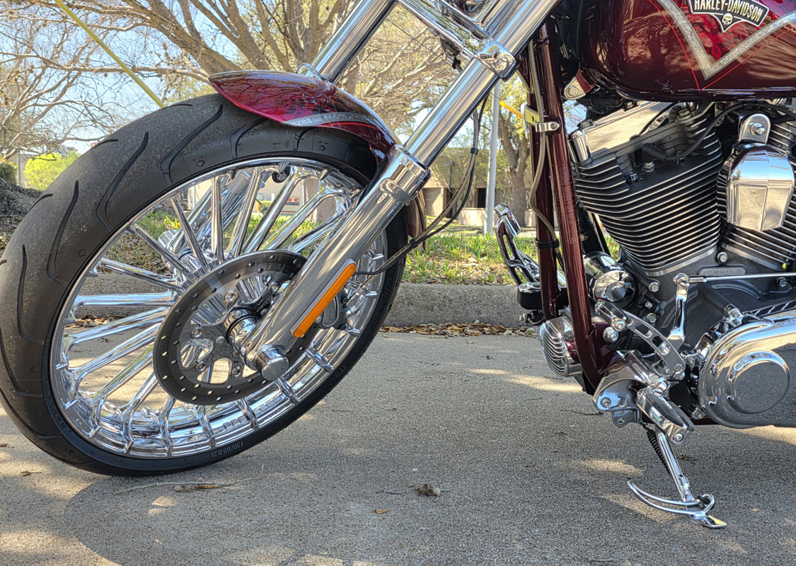 ” The wide front end spreads the forks approximately 1.75 inches wider than previous FX Softail® models to allow fi ent of a 130 mm front tire. The entire front end assembly is chrome plated, including the nacelle and headlamp bucket.