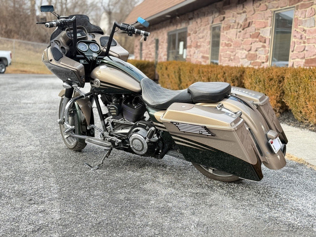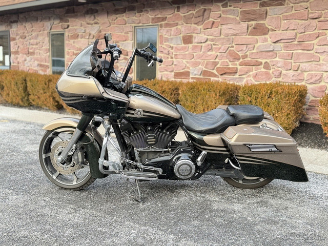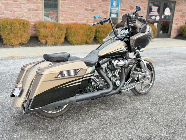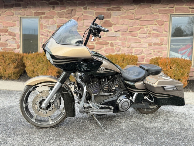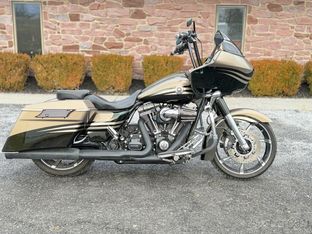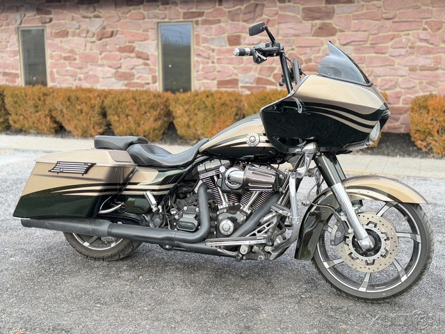 2013 Harley-Davidson Screamin' Eagle CVO Road Glide Custom FLTRXSE2 110" w/ Upgrades! 110"/1802cc Screamin' Eagle Twin-Cam Engine. 6-Speed Transmission. Roman Gold/Burnt Emerald with Edge Graphics. One owner. Clean Carfax. Only 33,610 Miles.Feautures/Upgrades:Screamin' Eagle Heavy breather with contrast cut black coverCobra slip-on mufflersBlack custom ape hanger handlebarsContrast cut saddlebag latchesCVO Features and Benefits:Production will be limited to approximately 3,150 units assembled at the Harley-Davidson Vehicle Operations facility in York, Pa.Exclusive multi-color paint schemeHigh-output sound systemAerodynamic fork-mounted fairing with dual LED headlamps.Anti-Lock BrakesElectronic Cruise ControlChrome Accessories throughoutBraided black stainless steel brake and clutch linesSmart Security System with siren.Assist & Slip Clutch Pack provides a slip feature on downshifts to reduce loading of the driveline; hydraulic actuation with reduced effort and reshaped leverHarman/Kardon High-output amplified advanced audio system with two 200-watt amplifier/CD/AM/FM/WB.Sensitive AM/FM antenna located within the fairingDaymaker LED Headlamp with Contrast Chrome/Black reflectorChrome billet-style extended reach heel shifterBlack 1.25-inch-diameter, internally-wired handlebarSlipstream Collection hand grips, rider floorboard inserts, shifter pegs, brake pedal pad, passenger footpegsContrast Chrome Agitator Custom wheels and Agitator front brake rotorsExtended hard saddlebags; color-matched rear fascia with LED brake/turn lightsColor-matched inner fairing and speedometer/tachometer housing, color-matched upper fork sliders, license plate light cover, and rear fender strut coversVIN# 1HD1TC81XDB957772WE FINANCE, TAKE TRADES & SHIP NATIONWIDE!American Classic Motors315 Big Road Zieglerville PA 19492(610)-754-8500Sales@AmericanClassicMotors.comwww.AmericanClassicMotors.com