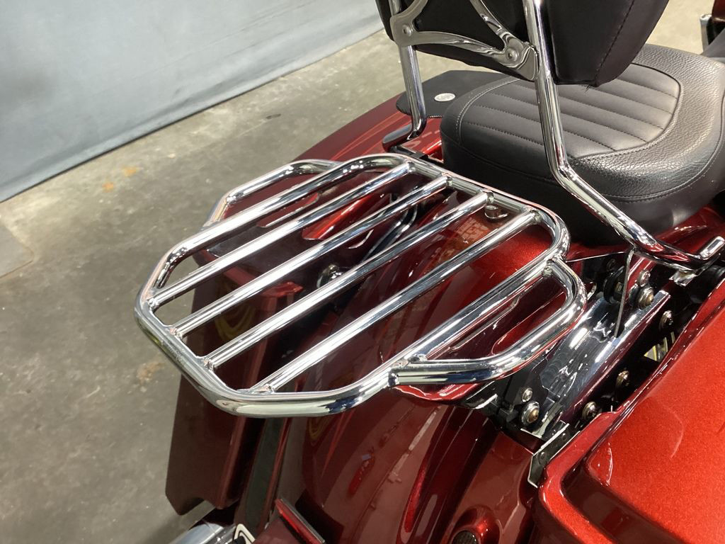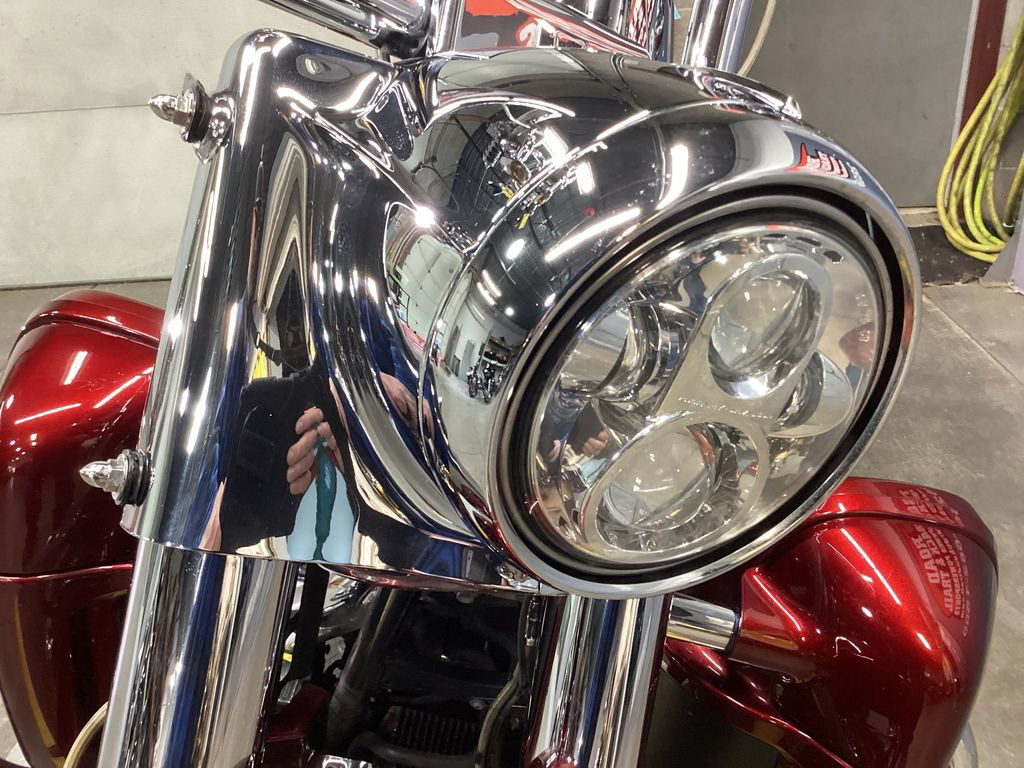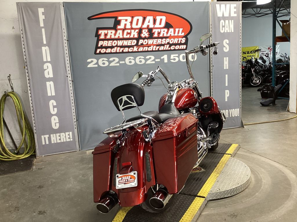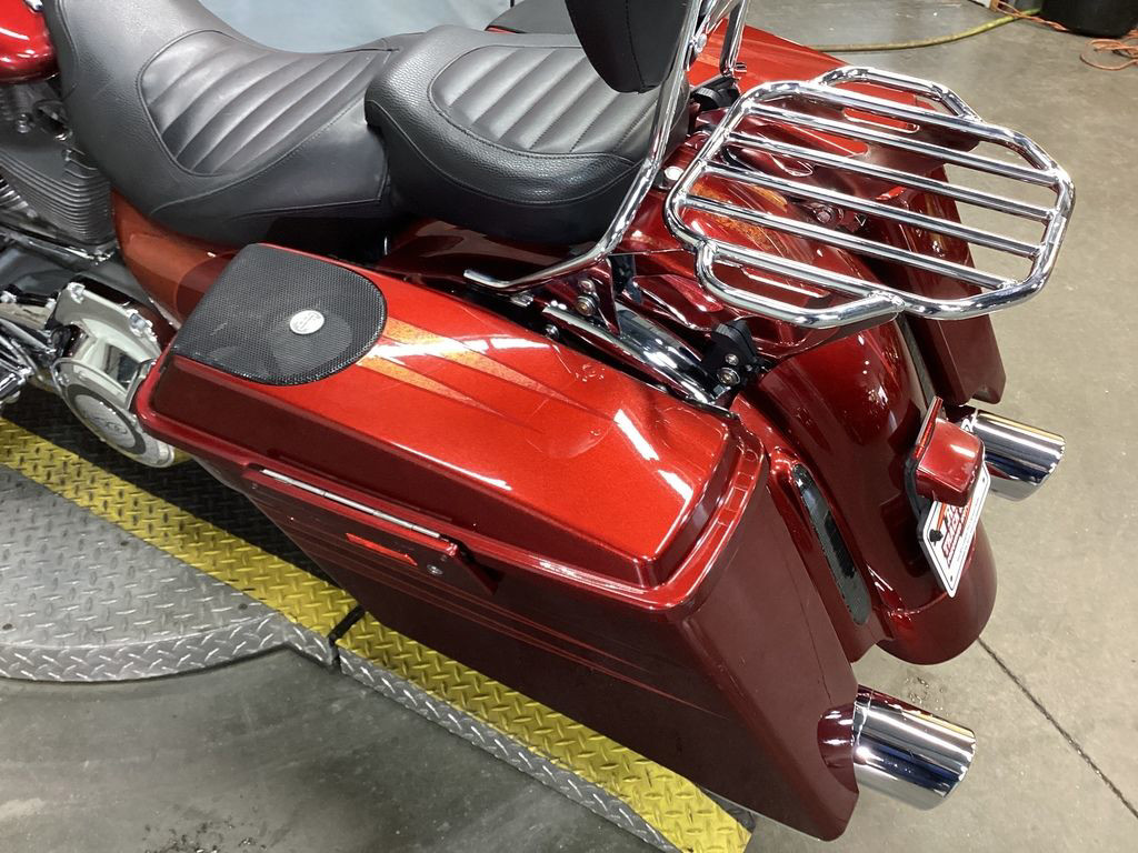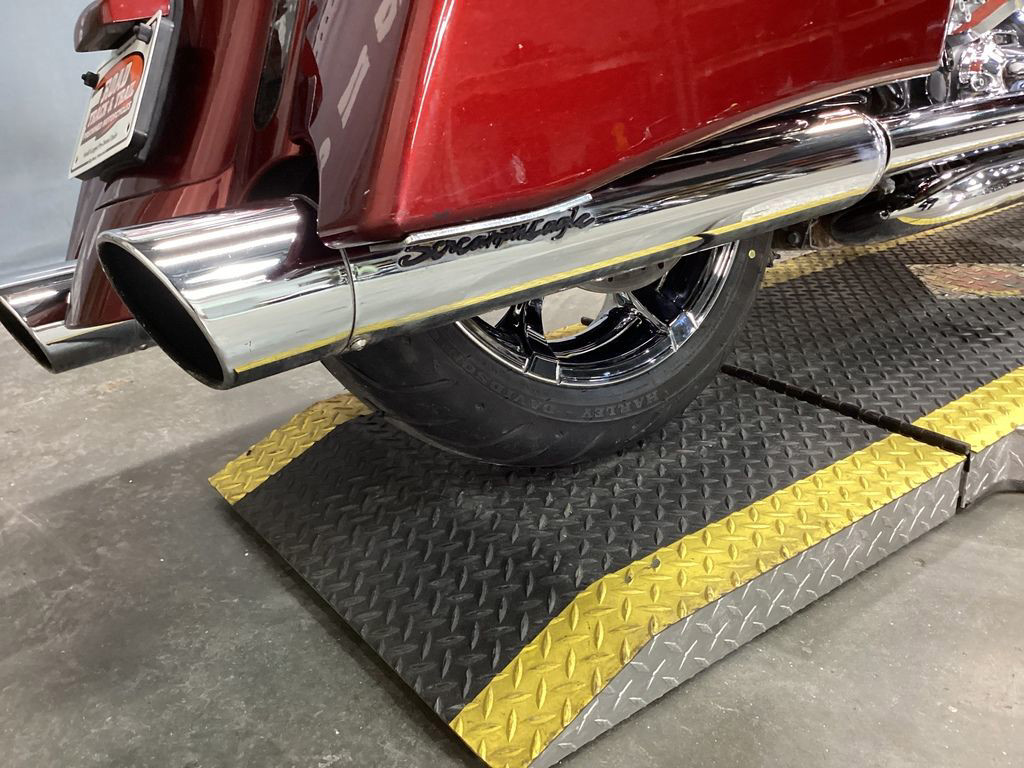 The 2013 Harley-Davidson® CVO™ Road King® FLHRSE5 model is the ultimate hot rod boom bagger. It packs a premium audio system that plays through speakers in the fairing lowers and saddlebag lids. For 2013, the CVO™ Road King® model comes in an even more limited availability, serialized 110th Anniversary Special Edition, featuring exclusive commemorative anniversary styling elements, premium features and finely forged finishes that make it a top-of-the-line model and a true work of motorcycle art. The FLHRSE5 Road King® model CVO™ has a detachable short custom wind deflector that cuts the wind for more comfortable riding. The H-D® CVO™ Road King® model offers custom extended saddlebags that add to the bike's premium touring capabilities, and custom-style Agitator wheels that add to its bold boulevard style. The Twin Cam 110™ engine with Screamin' Eagle badges provides 110 cubic inches of power, a low cruising rpm, and lots of low end torque, along with silky smooth shifting of its 6-speed cruise drive transmission. Chrome touring mufflers are a beautiful set of pipes that look great, sound impressive and keep rider and passenger safe from exhaust heat. The two-piece low profile saddle is available in solo or two-rider configurations, in leather styling the makes a unique custom statement.