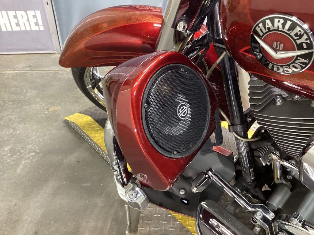 This is the boom in your bagger and an innovative new dimension in customization—premium sound on a non-fairing bike. A high output, 200 watt amplifier delivers high quality, high output audio from speakers in the fairing lowers in front and the saddlebag lids behind. The controller puts music command at your glove-tips, making it easy to match your tunes to your cruise. And with the iPod® connector and included, Harley-Davidson®-branded 8GB iPod Nano you'll always have plenty of boom to move.