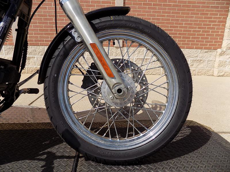 The exterior of the motorcycle is a sleek and commanding black color, accentuated with a subtle pinstripe that runs along the lines of the bike, adding an extra touch of sophistication and flair. This Harley-Davidson model stands out in a crowd, capturing attention with its precise design and classic aesthetics.