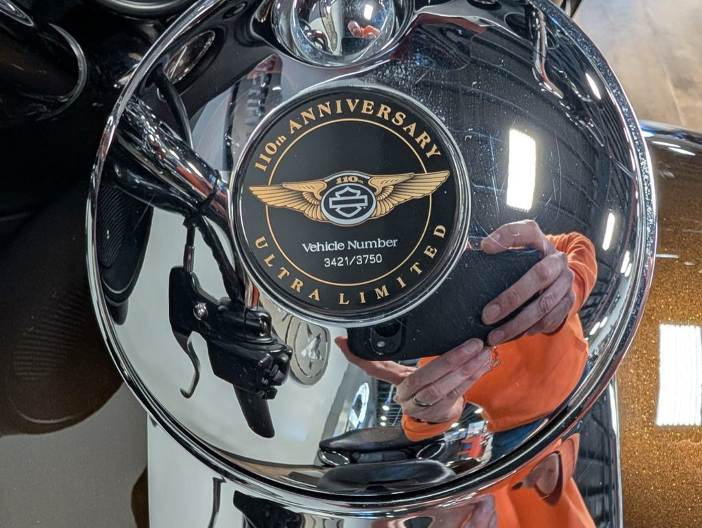 Each Anniversary Edition Harley-Davidson® is a unique masterpiece, with its very own work of art marking it as part of this historic celebration. Forged of solid bronze and plated with black nickel, each Anniversary medallion is then distressed to highlight the bronze. And since no two can ever distress the same, each becomes a completely unique commemorative "sculpture." The finishing touch is a bold gold Cloisonné showing the Harley-Davidson® Bar and Shield. (Available only on 110th Anniversary Edition models)