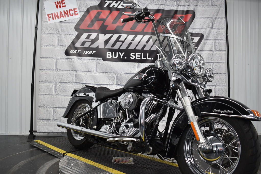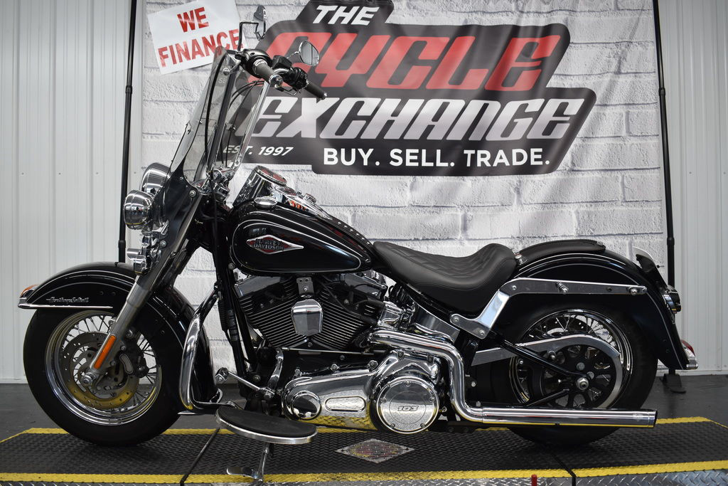 The 2013 Harley-Davidson® Heritage Softail® Classic motorcycle FLSTC is fully equipped with modern touring capabilities and even has a removable motorcycle windshield. For 2013, the FLSTC Heritage Softail® Classic comes in a limited, serialized 110th Anniversary Special Edition, featuring exclusive commemorative anniversary styling elements and premium features that make it a top-of-the-line model and a true work of living art, with finely forged finishes that age and transform in a manner unique to each vehicle. The Harley® Heritage Softail® Classic model features a powerful air-cooled Twin Cam 103™ Harley® engine with 6 speed cruise drive transmission, providing more performance power for passing, hill-climbing, and riding with passenger and luggage. Enjoy mile after mile with a large capacity 5 gallon Softail fuel tank. The H-D® Softail model’s tank is also dripping with authentic Harley-Davidson® style. The Harley® FLSTC model has full length rider footboards with rubber vibration isolation for added comfort. Another of the many great features of this classic motorcycle is the detachable motorcycle windshield. You can remove the Harley® Heritage Softail® windshield for a new look. Learn more about the style and functional components found on this bike. If you're looking for a pure classic cruiser motorcycle, check out the Fat Boy model. The Harley® Touring motorcycles are also well worth a look including the Electra Glide Ultra Limited touring bike.