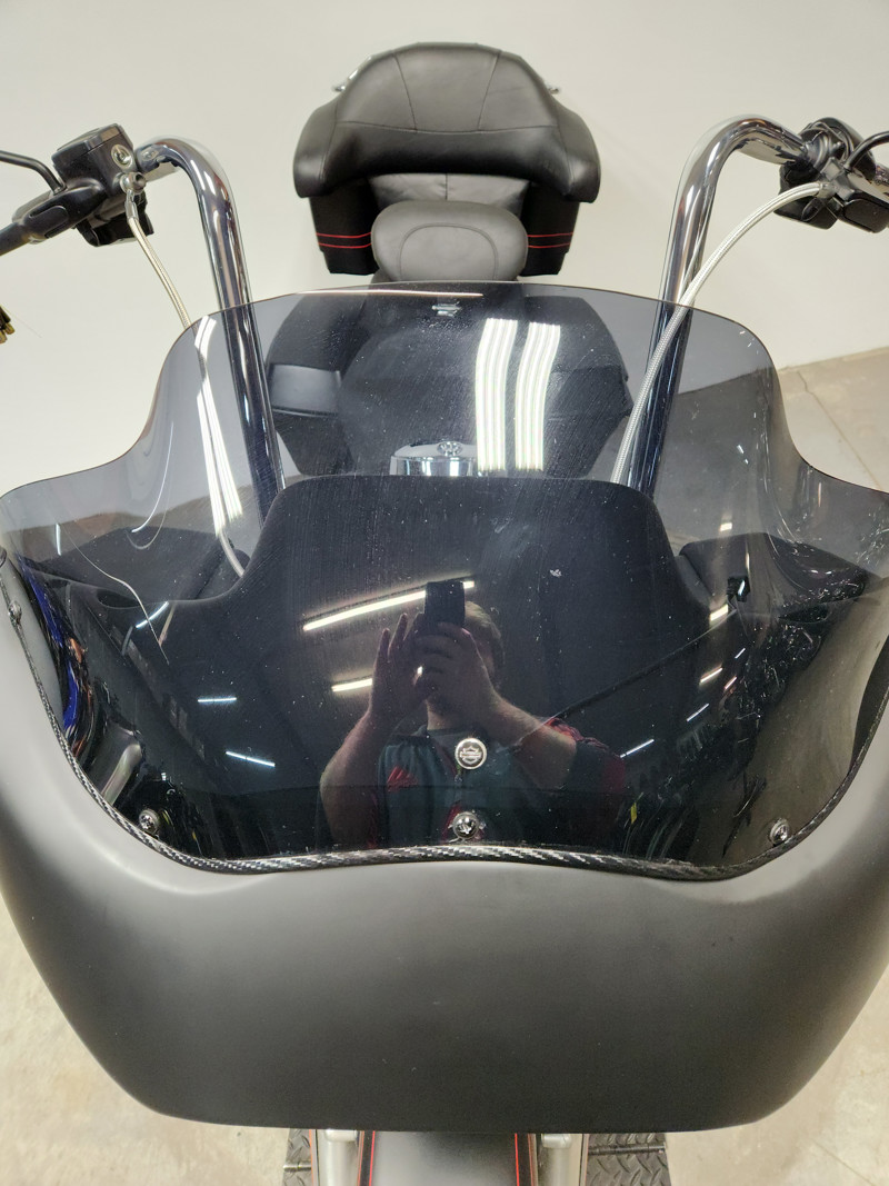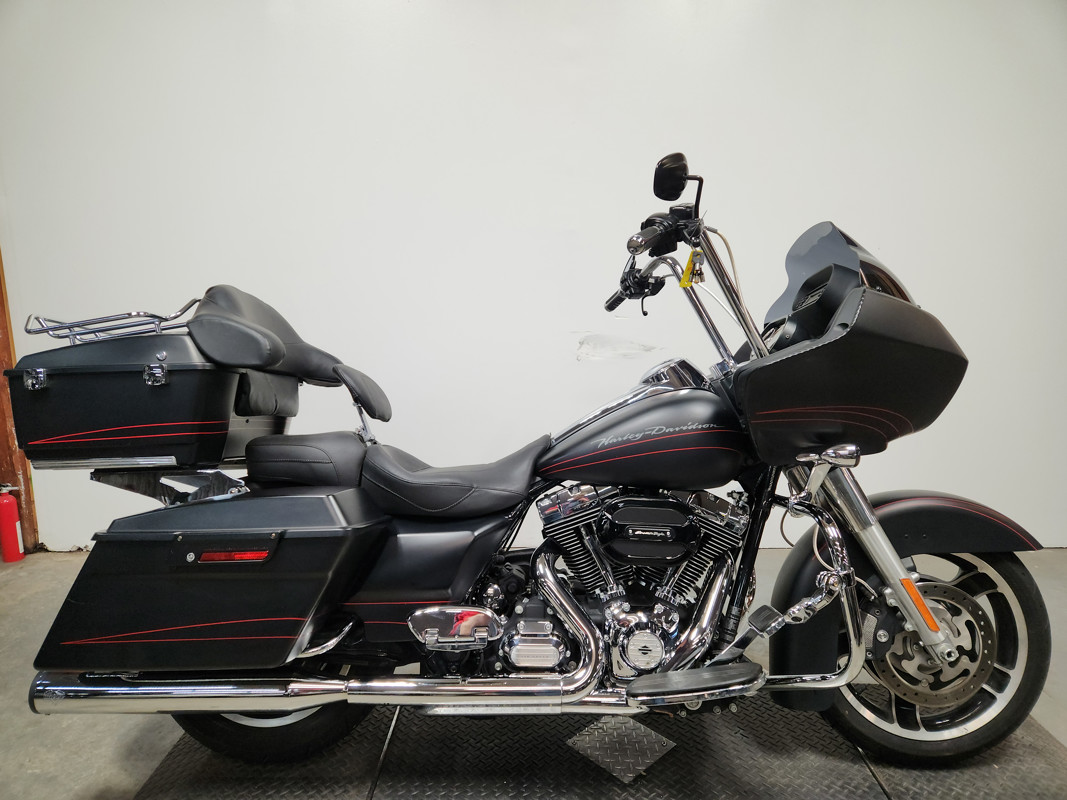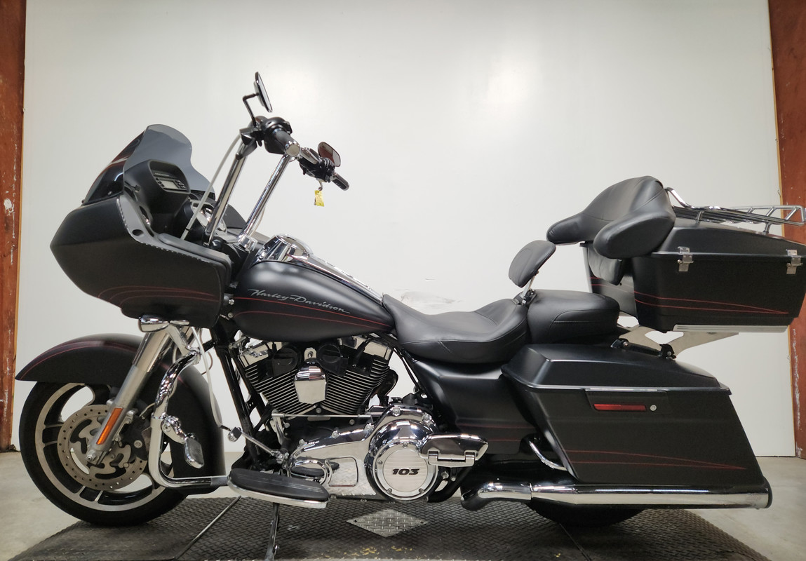 USED HARLEY ROAD GLIDE CUSTOM FOR SALE WITH ONLY 11,840 MILES AND OVER $3,000 IN EXTRAS! CLEAN, CLEAN, CLEAN! THIS ONE IS A PERFECT 10 OUT OF 10! NO DENTS, NO DINGS, NO SCRATCHES! TAKE A GOOD LOOK AT THIS ONE! BLACK DENIM PAINT, DAYMAKER HEADLIGHT, HIGHWAY PEGS, DRIVER BACKREST, PAINT MATCHED QUICK DETACHABLE TRUNK, STAGE 1 KIT, SCREAMING EAGLE INTAKE, AND THE VANCE & HINES DUAL EXHAUST SOUNDS GREAT! JUST SERVICED AT DEALERSHIP, INSPECTED, ALL FLUIDS CHANGED, RUNS STRONG, EVERYTHING WORKS, NEEDS NOTHING! GREAT, LOW MILEAGE, CLEAN ROAD GLIDE WITH EXTRAS!