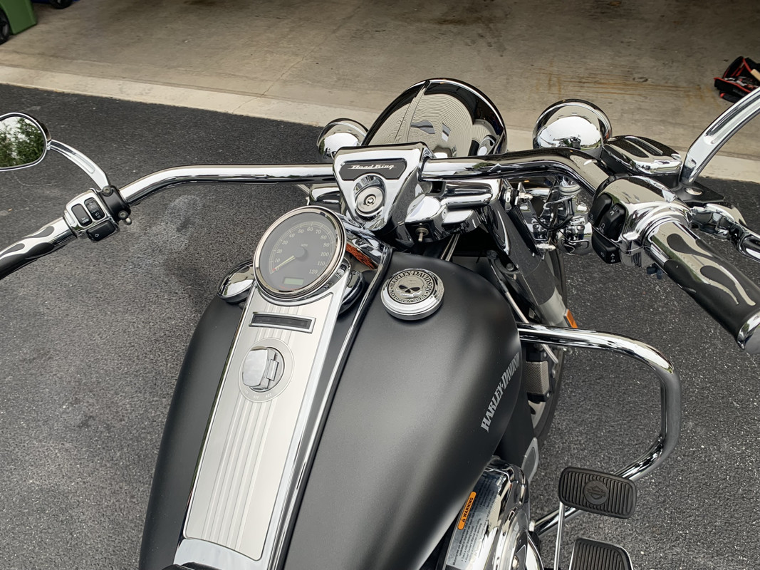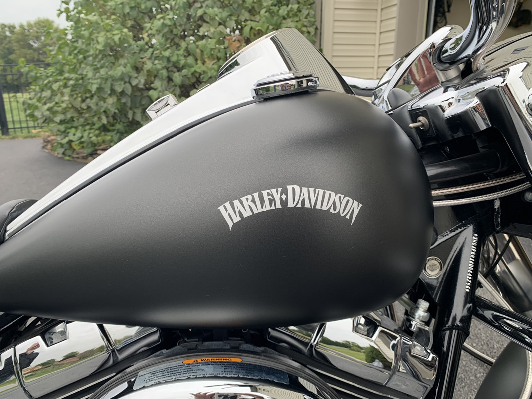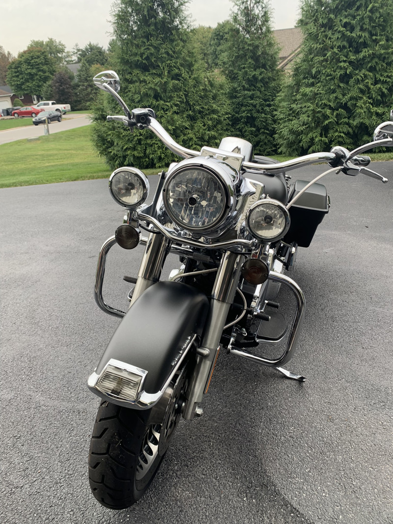 2013 Road King, garage kept, current inspection, loads of extras including but not limited to: one year old denim gray custom paint job with hand painted HD logo, chrome beach bars with braided cable, detachable back rest, Full Boar exhaust pipes, forward chrome controls. MAKE A REASONABLE OFFER