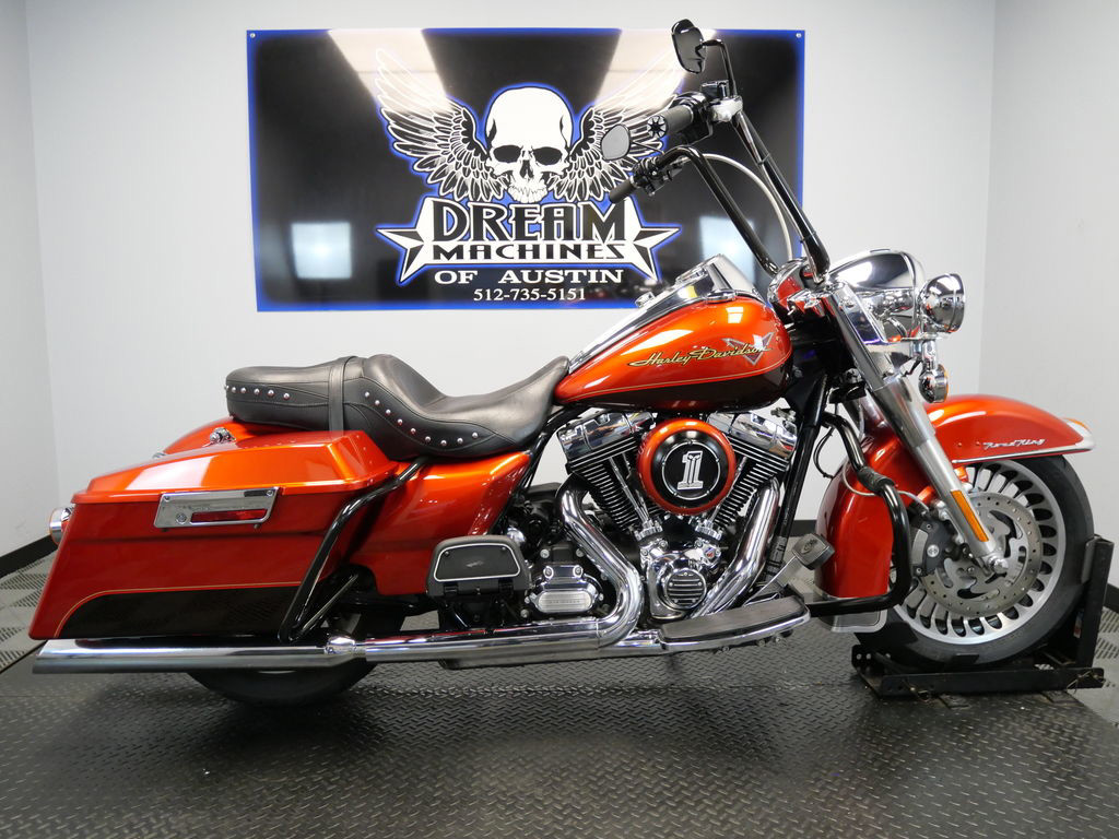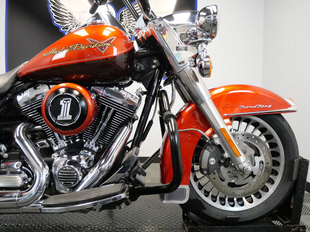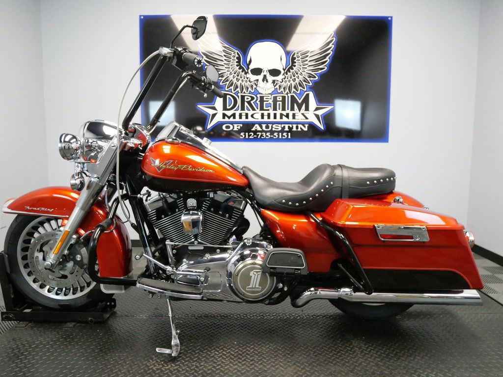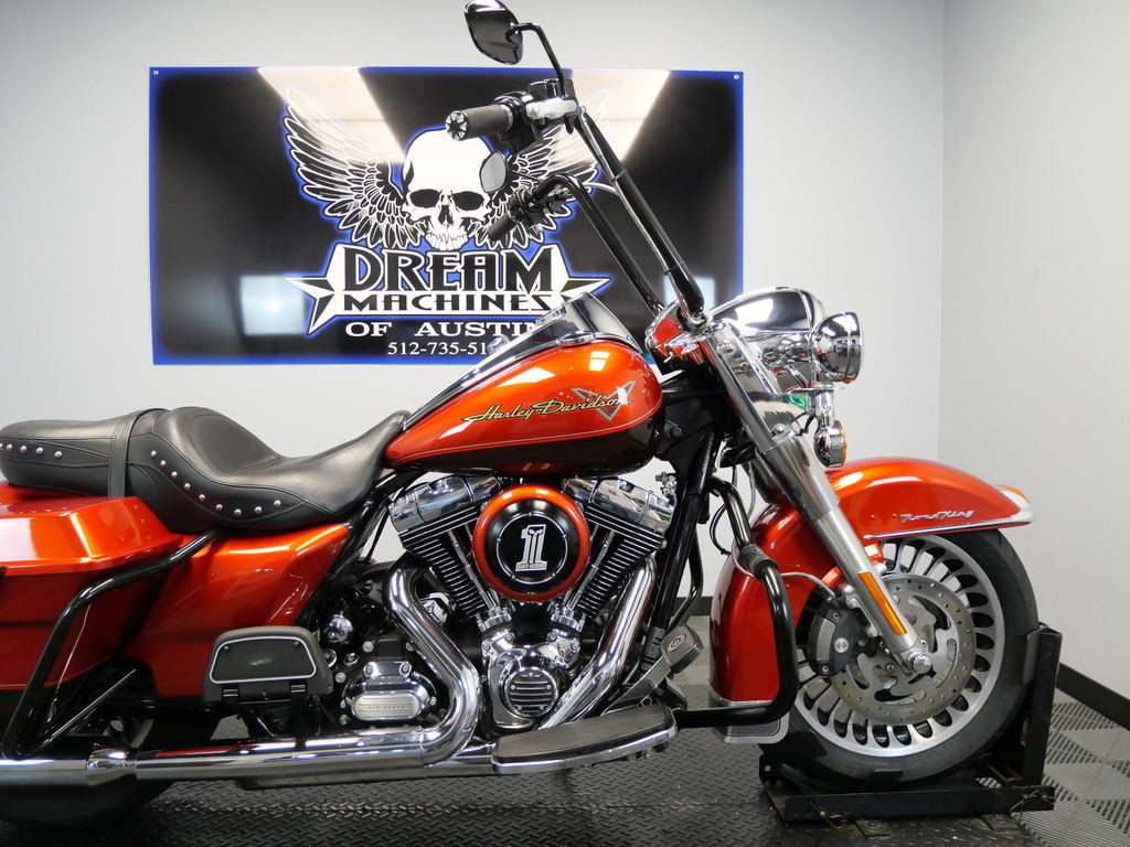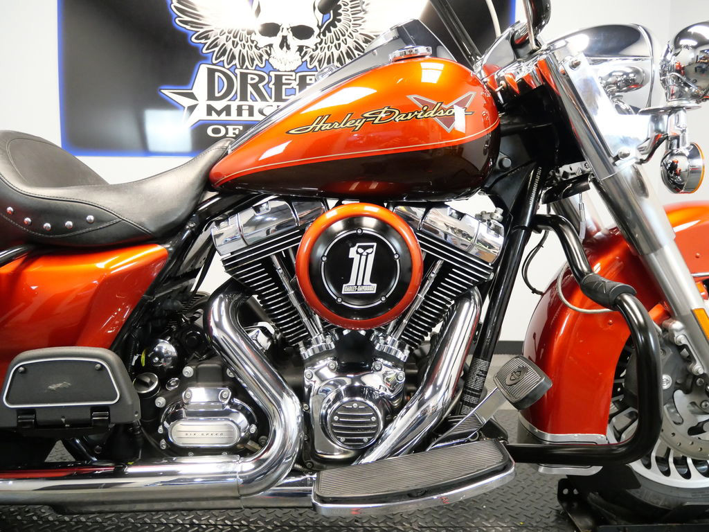 YOU ARE LOOKING AT A 2013 HARLEY DAVIDSON ROAD KING (FLHR) WITH 41,145 MILES ON IT. IT IS CANDY ORANGE AND BEER BOTTLE IN COLOR AND POWERED BY A 1690CC (103") FUEL INJECTED ENGINE AND 6 SPEED TRANSMISSION. THE BIKE COMES WITH CRUISE CONTROL AND 1 KEY. THERE ARE SOME EXTRAS ON THE BIKE WHICH INCLUDE SLASH CUT SLIP-ON MUFFLERS ($399.95), STAGE 1 AIR INTAKE ($139.95), BLACK ENGINE GUARD ($214.95), SADDLEBAG GUARD RAILS ($289.95), AIR CLEANER BADGE ($43.95), TIMER COVER ($28.95), APE HANGER BARS ($299.95), GRIPS ($99.95), DERBY COVER ($58.95), LED HEADLIGHT ($399.95), AND COMBINATION ANALOG SPEEDOMETER/TACHOMETER ($399.95). THERE ARE NO SCRATCHES, DENTS, OR DINGS THAT I CAN FIND WITH THE EXCEPTION OF TOUCH UPS ON THE FRONT AND REAR FENDER. THE CHROME AND ALUMINUM ARE IN GOOD CONDITION. THE TIRES HAVE GOOD TREAD LEFT ON THEM.