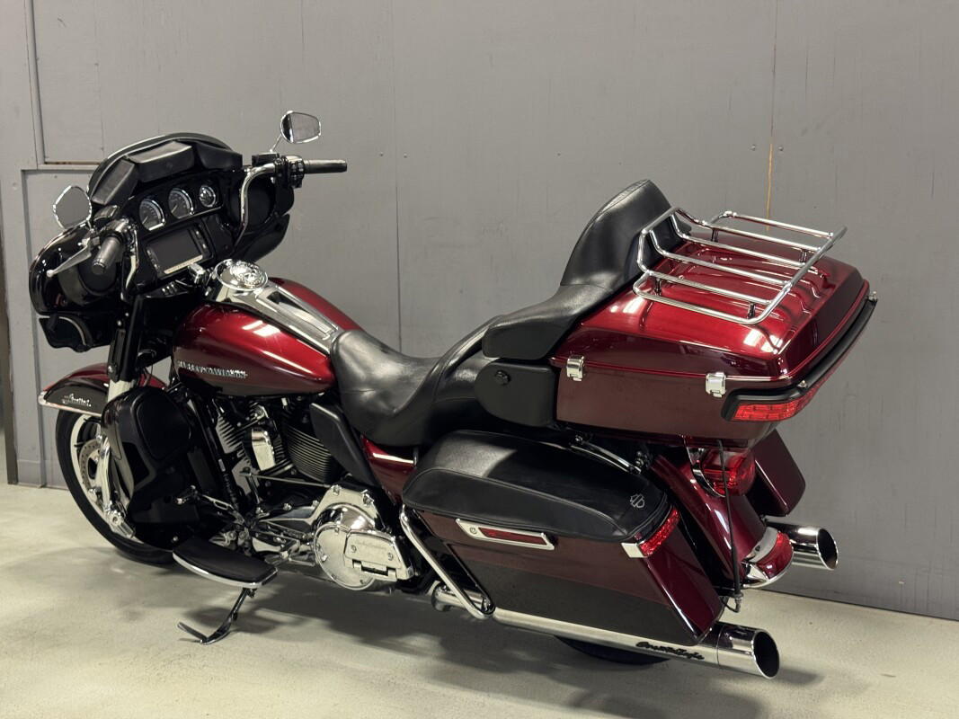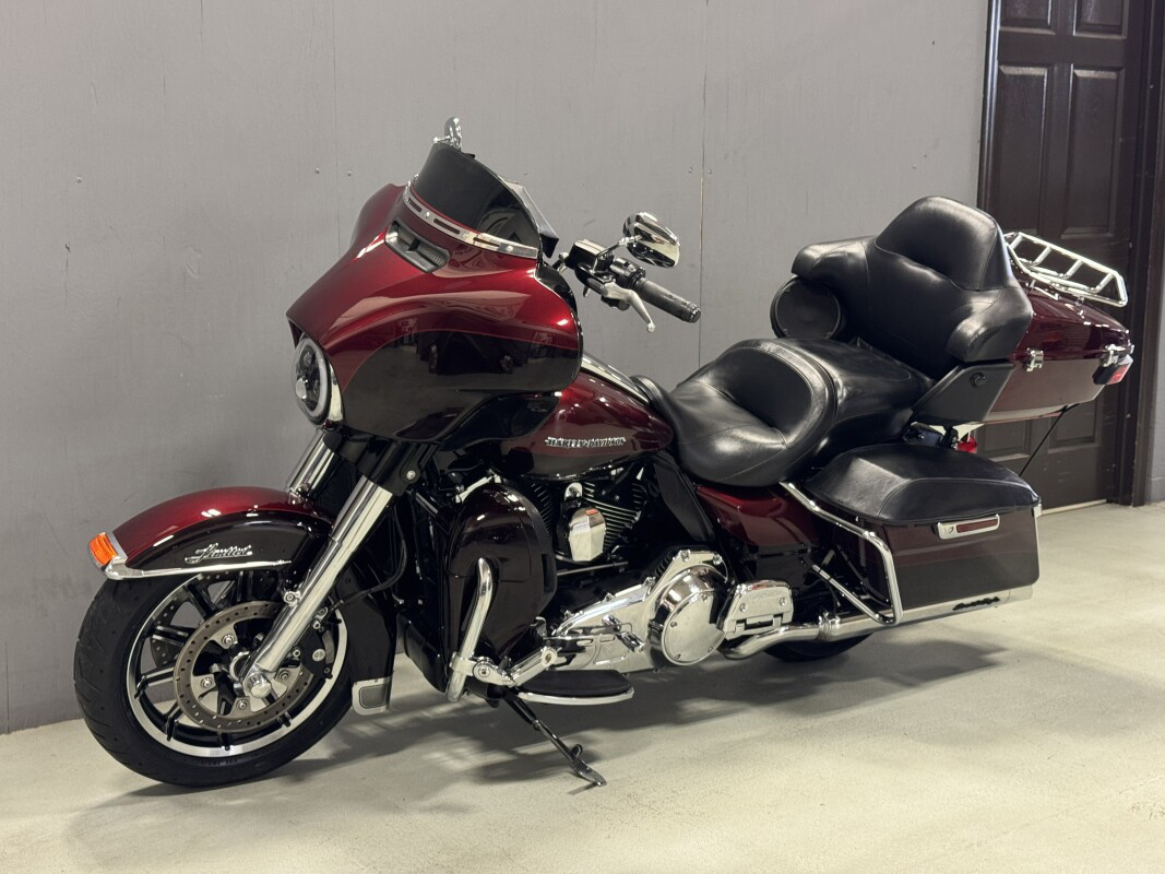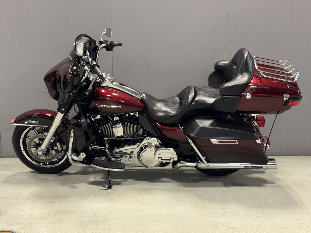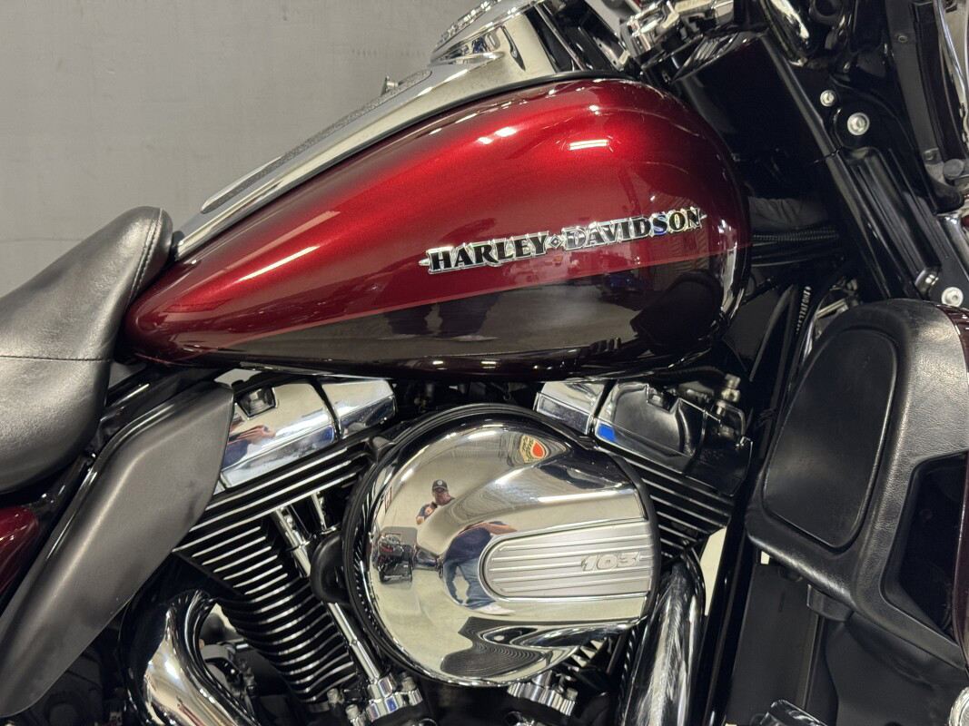 The 2014 Ultra Limited is a premium touring bike full of authentic Harley-Davidson grand American touring style. As part of Project RUSHMORE, it has been redesigned for 2014 and features a new twin-cooled high output Twin Cam 103 engine with more low-end torque and passing power and is combined with a smooth-shifting Six-Speed Cruise Drive transmission for low rpm at highway speeds. There is more room and improved touring comfort for the passenger and the redesigned iconic batwing fairing reduces head buffeting. It features anti-lock brakes (ABS) with linked brakes for optimum braking regardless of road conditions and the new Boom Box Infotainment system provides the loudest, clearest sound and most intuitive operation ever on a Harley-Davidson motorcycle. Another feature of the bike is the motorcycle luggage capacity - the sleek new touring saddlebags and Tour Pak provide more room for your gear and the new latches that can be operated with one hand for added convenience.