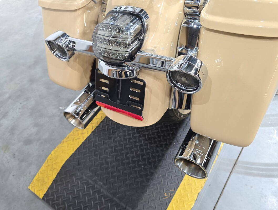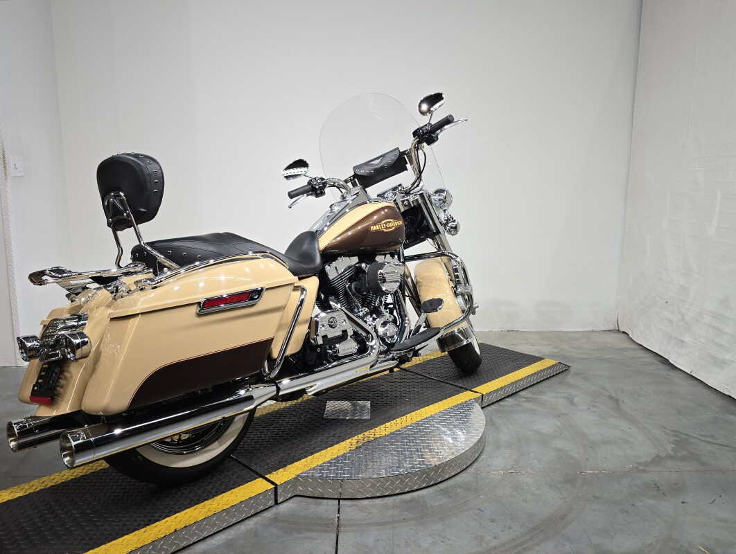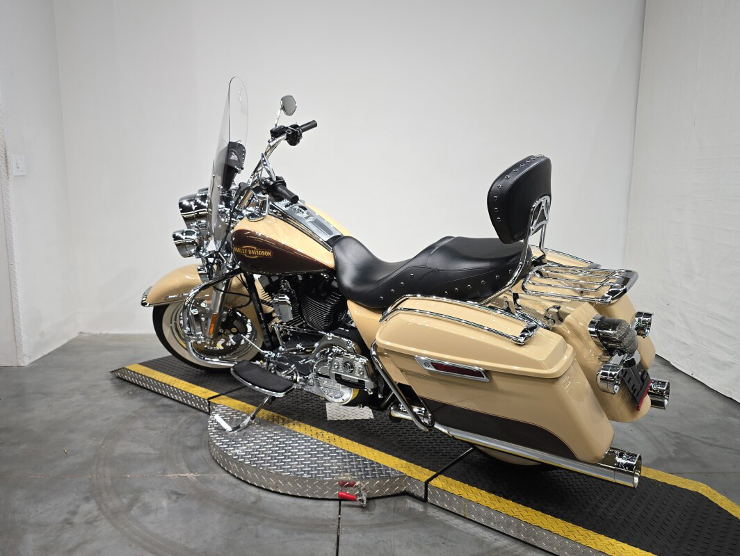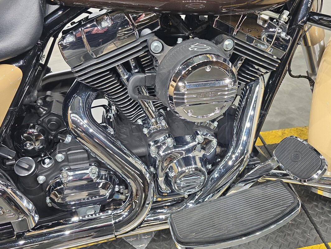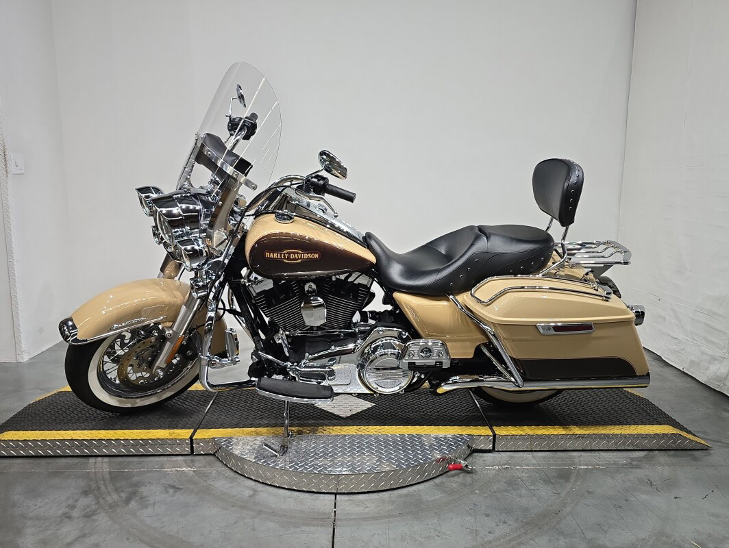 The 2014 Road King Classic takes the idea of Classic to the most modern place it's ever been. As part of Project RUSHMORE, it has been redesigned for 2014 to make the ride better than it's ever been. The bike is powered with a new rubber-mounted high output Twin Cam 103 engine that gives you more power for passing, hill-climbing and performance when carrying luggage or a passenger. It also has a new anti-lock braking system (ABS) with linked brakes for optimum braking in all conditions. New Dual Halogen headlamps and fog lamps improve visibility. There are new gauges that are easier to read. The leather-wrapped injection molded hard saddle bags maintain their shape over time and the latches have been redesigned for easy one-hand operation. A detachable windshield and air adjustable touring rear suspension, give the choice for a variety of riding feels.