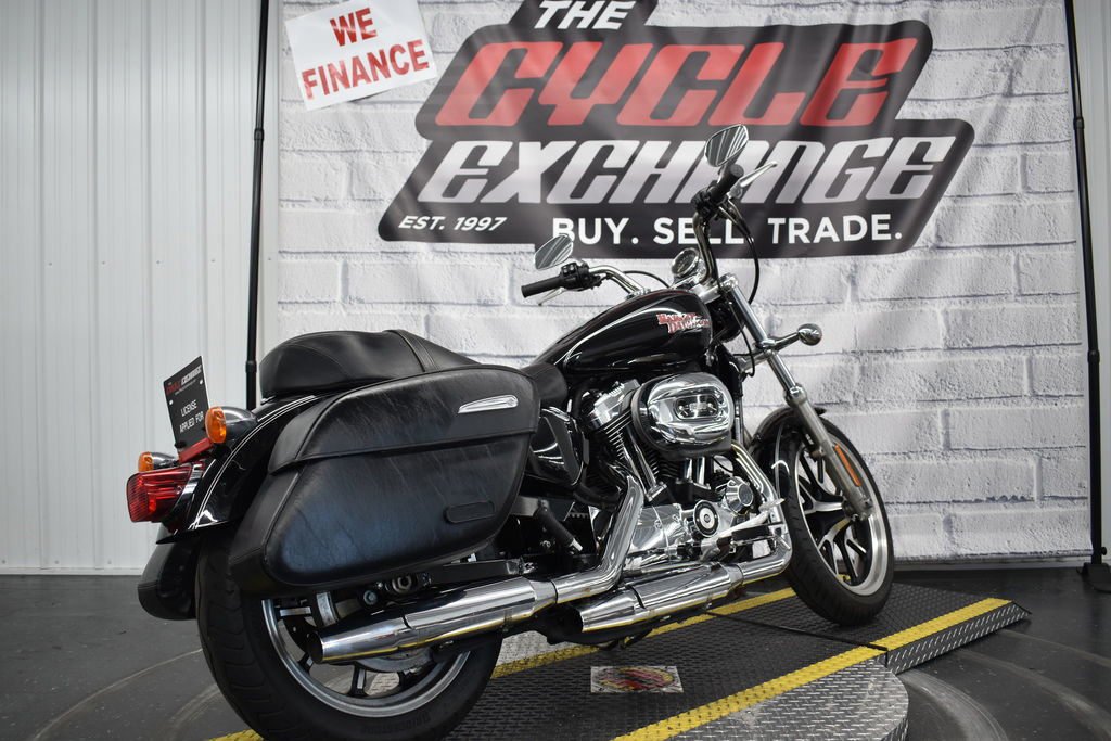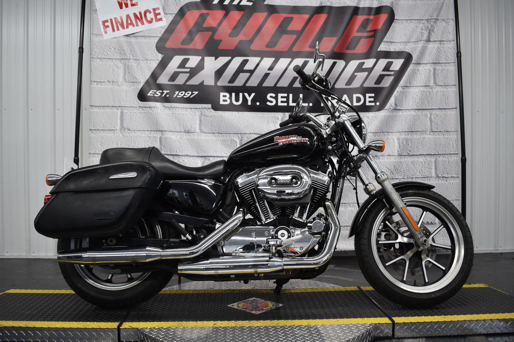 The 2014 Harley-Davidson® Sportster® SuperLow 1200T motorcycle is a new Sportster® motorcycle that packs full-on touring capability into a low riding, easy handling Sportster® frame. The seat is low and there are mid-mount foot controls for a riding positing that's easy to handle through twisting mountain roads and easy to handle at stoplights. Light, nimble and maneuverable with premium custom details front to back, big touring features are the SuperLow 1200T motorcycle's calling cards. You get lockable saddlebags and a quick release 14" windshield. The windshield and mini footboards keep you comfortable on long rides. The SuperLow is powered by a muscular 1200cc Evolution V-twin motor, which means plenty of power for long rides at freeway speeds. A narrow nose two-up seat puts the ground in easy reach of your feet. New brake system technology includes optional ABS.