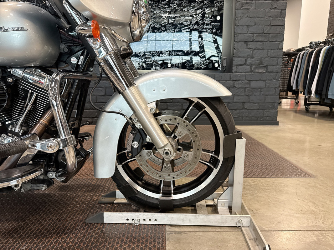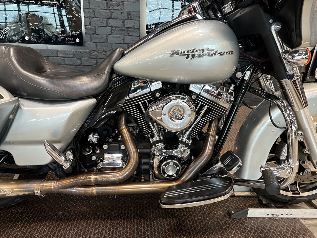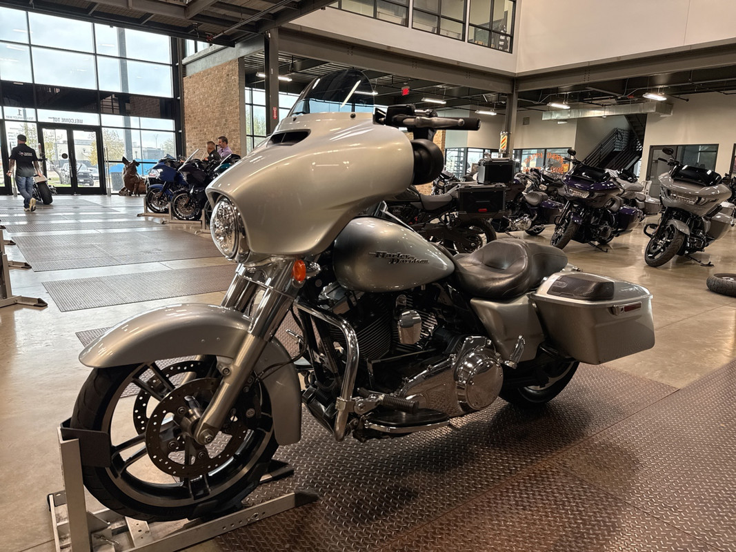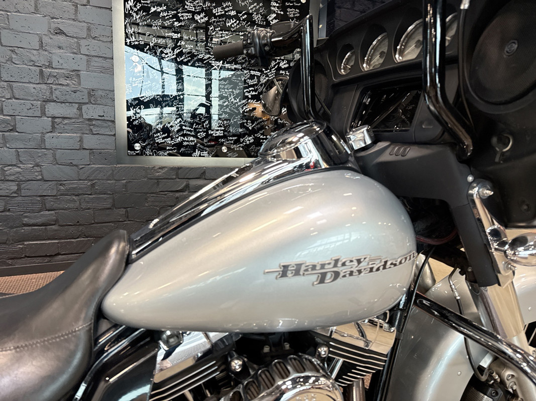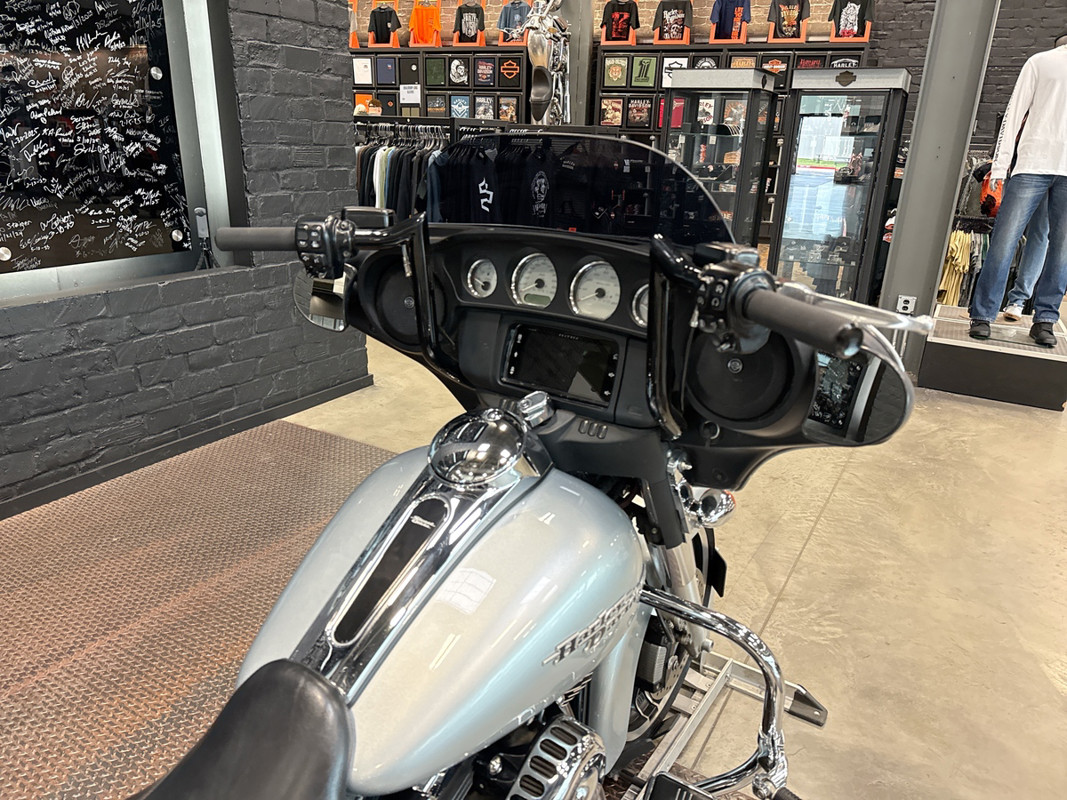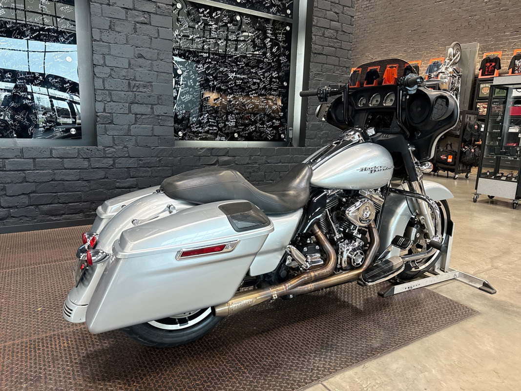 The 2014 HD Street Glide Touring is a striking motorcycle that combines classic design with modern features, making it a standout choice for riders who appreciate both style and performance. This particular model comes in a brilliant silver exterior color, which adds a touch of elegance and sophistication to its robust appearance. The Street Glide is known for its iconic look, characterized by a sleek, aerodynamic fairing and a low-slung profile that exudes confidence and power.