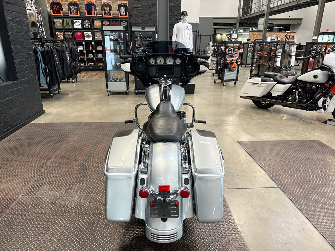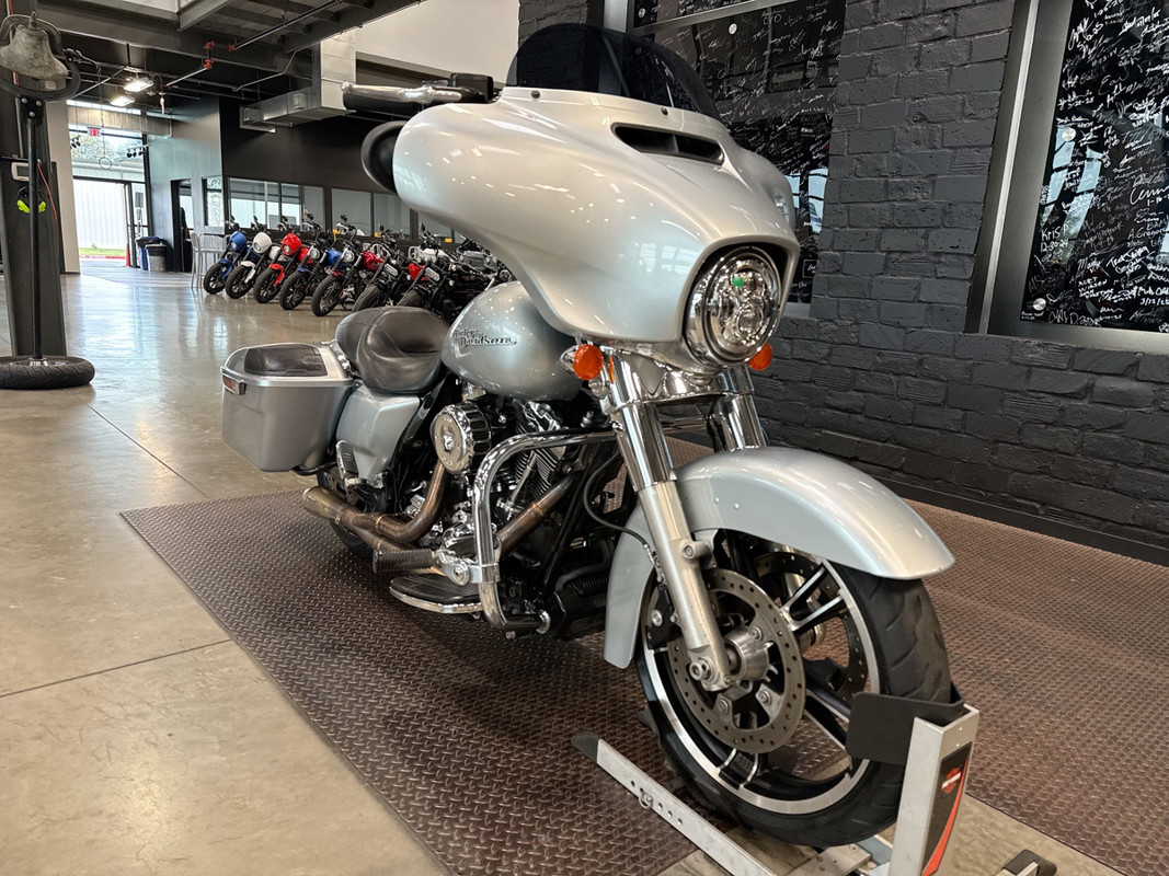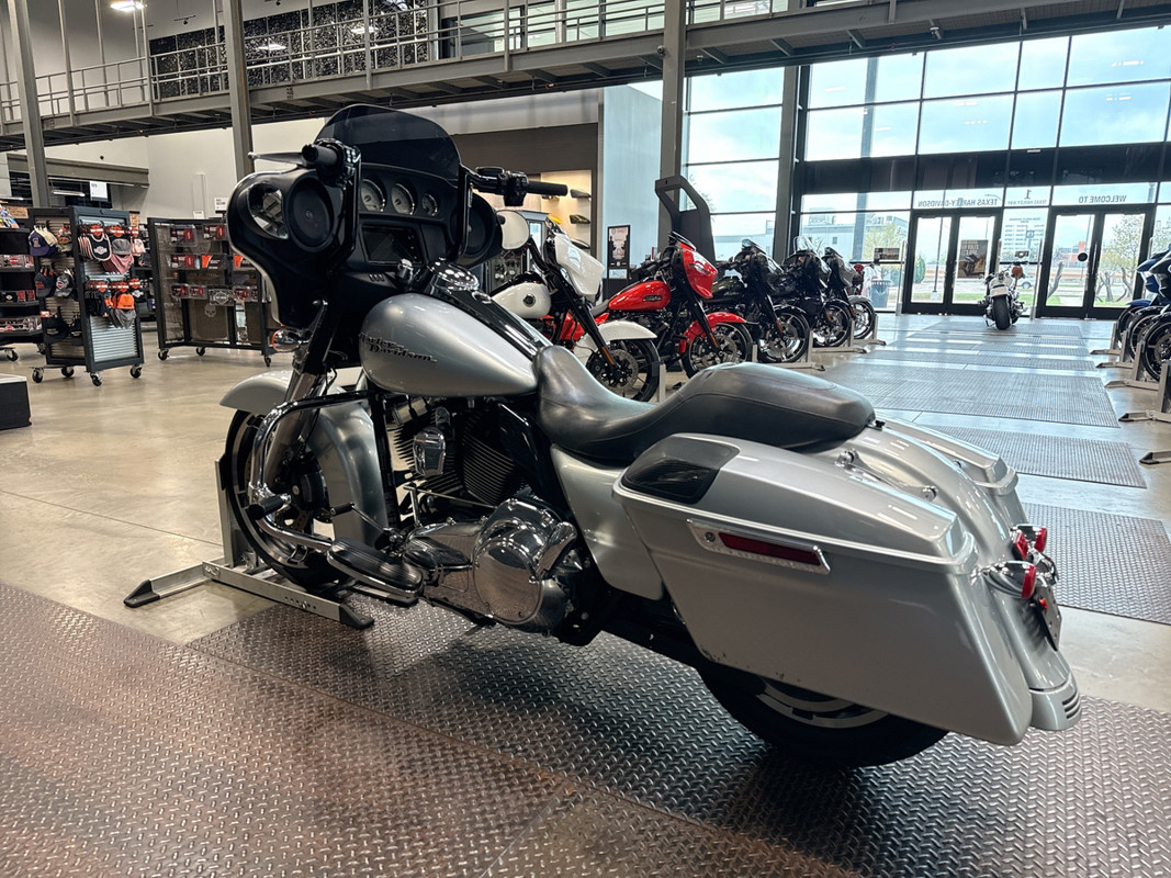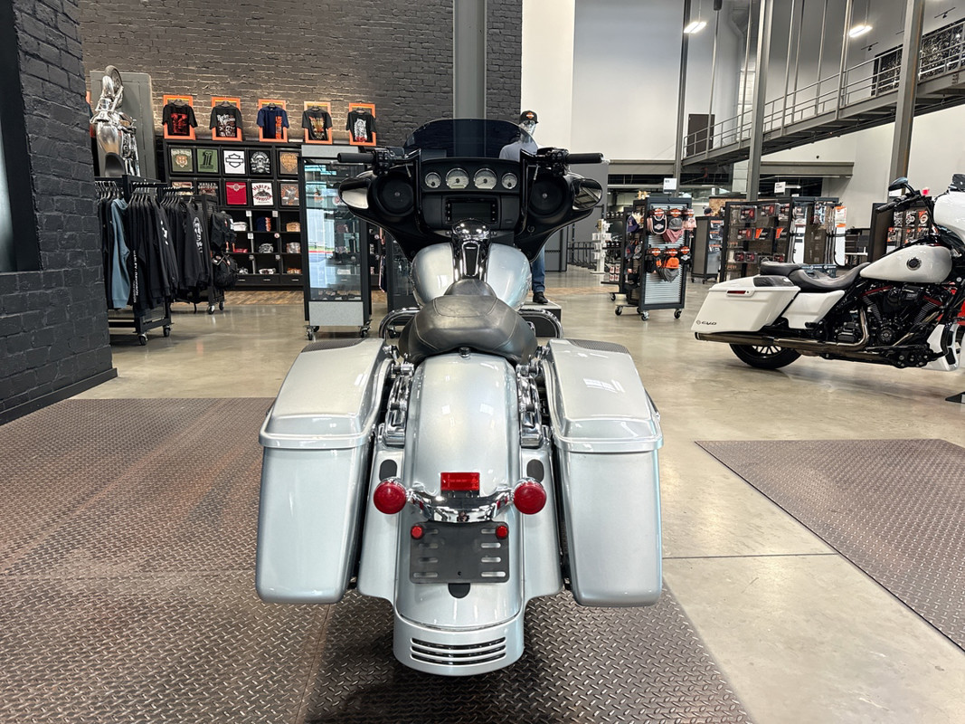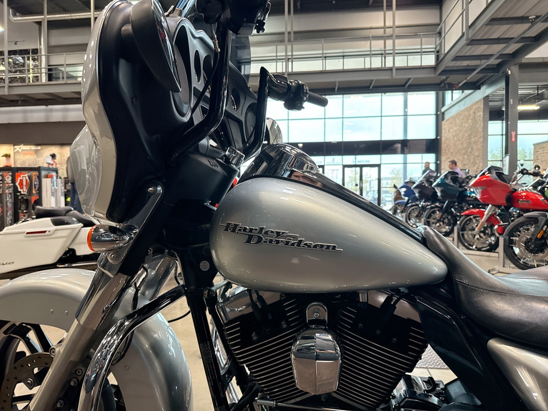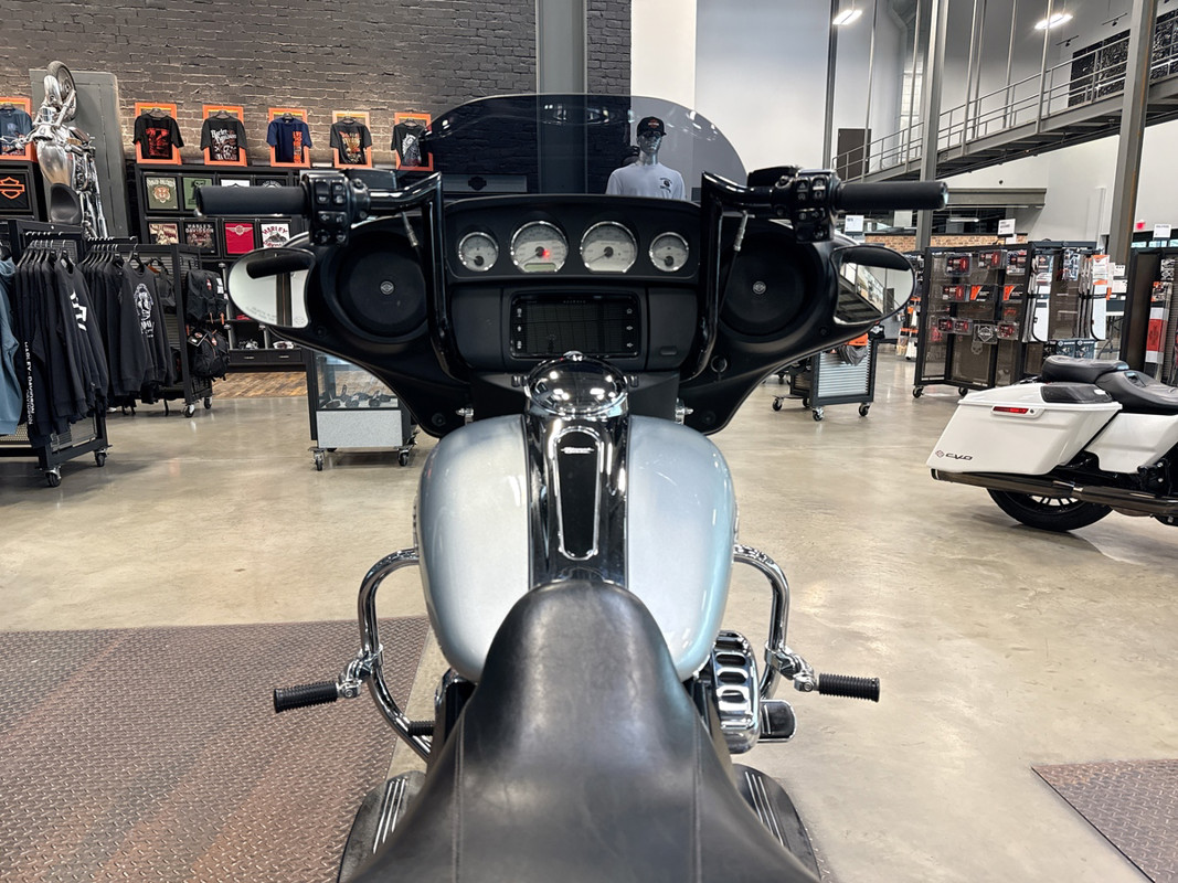 The 2014 HD Street Glide Touring is a striking motorcycle that combines classic design with modern features, making it a standout choice for riders who appreciate both style and performance. This particular model comes in a brilliant silver exterior color, which adds a touch of elegance and sophistication to its robust appearance. The Street Glide is known for its iconic look, characterized by a sleek, aerodynamic fairing and a low-slung profile that exudes confidence and power.