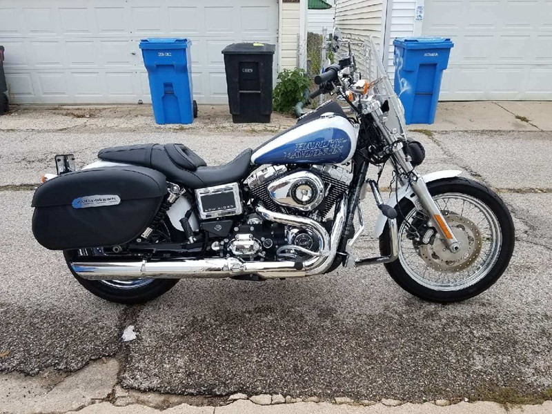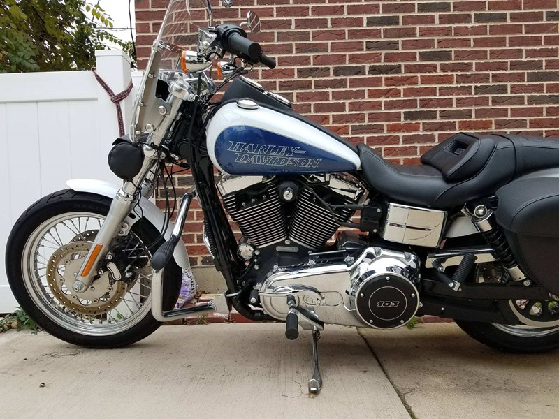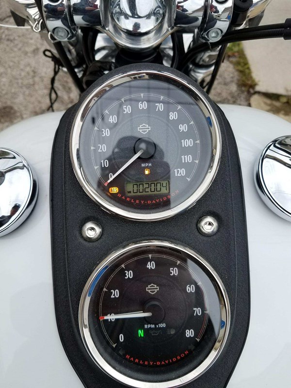 LIKE NEW 2015 FXDL Dyna Low Rider with ONLY 2000 miles! Air-cooled 103ci V-Twin 1690cc with 6 speed transmission. Upgrades include Vance and Hines slip on, Chrome Spoked Wheels, Two Tone Paint (White Hot Pearl/Blue Hot Pearl), Harley Davidson Hard Leather Saddle Bags with Quick Release Hardware, Detachable Windshield, Chrome Mustache Engine Guard, Factory Installed Security System and ABS Brakes! Bike also has Adjustable Seat and Handlebars. One owner and garage kept.