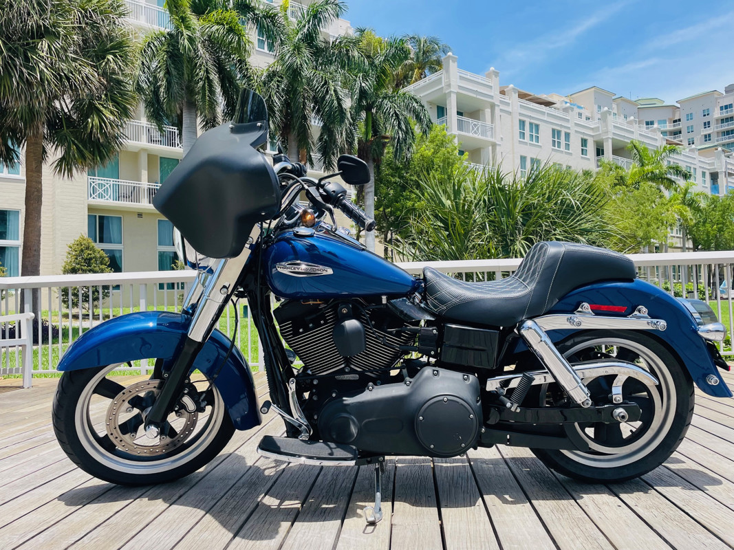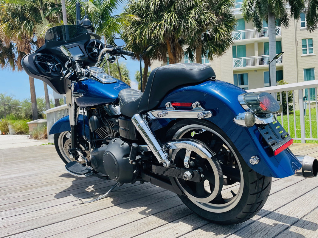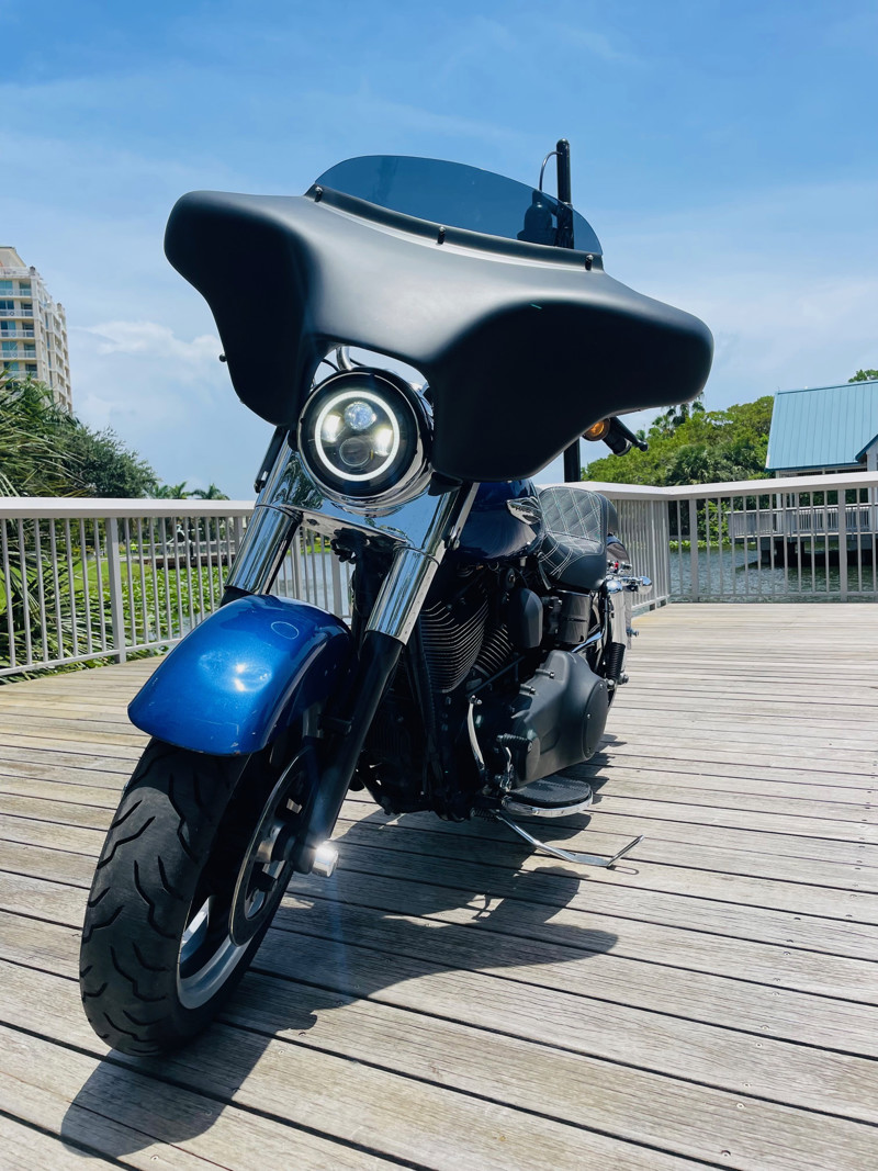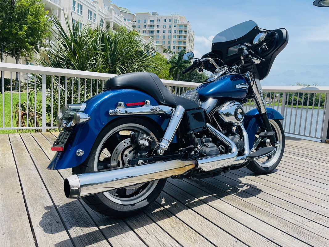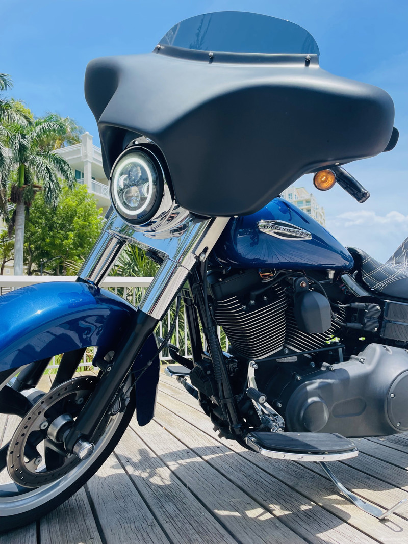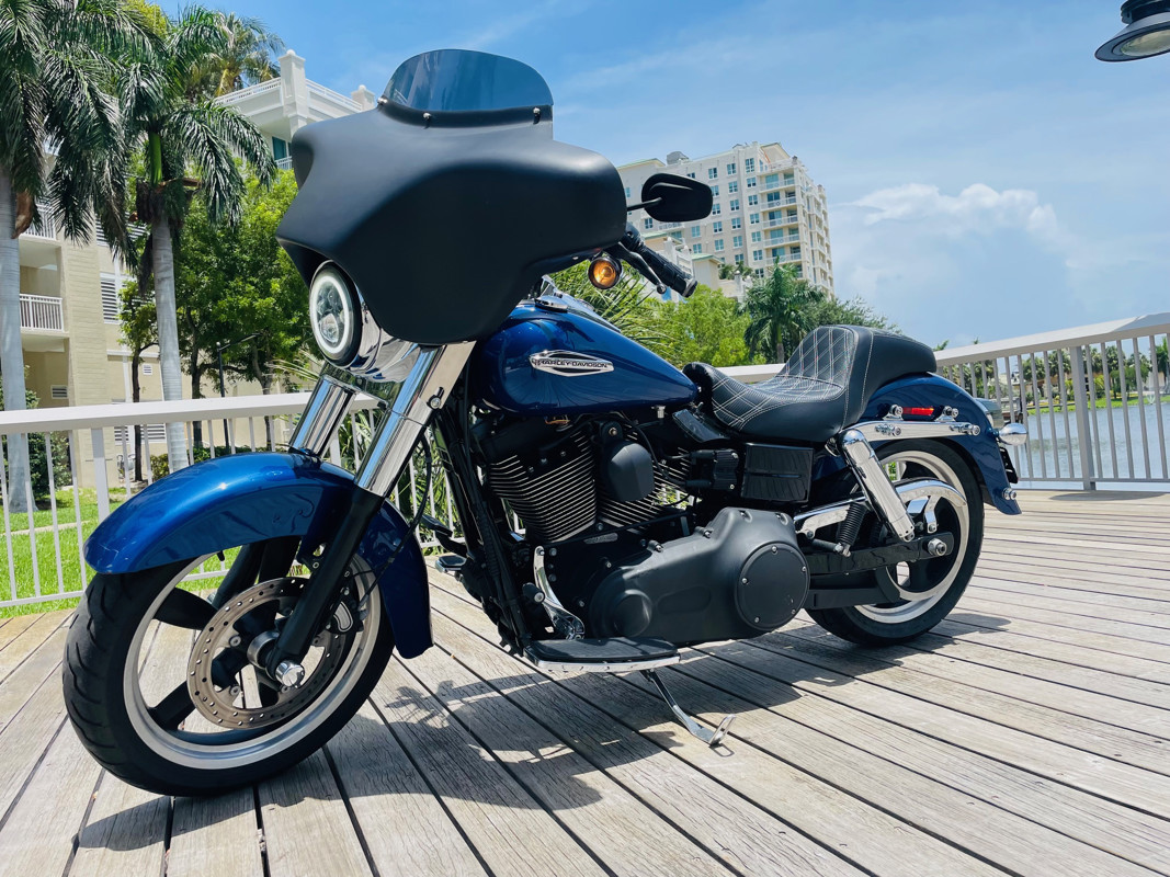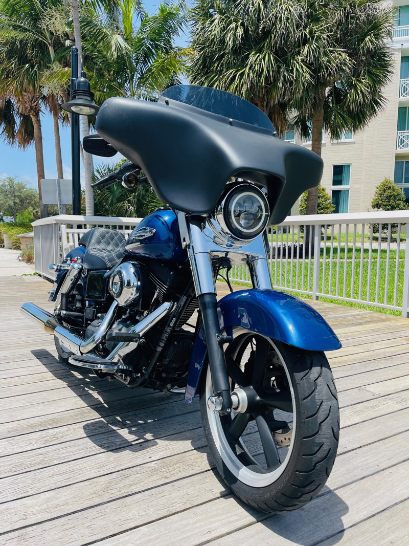 Beautiful Dyna Switchback finished in the absolute stunning Superior Blue. The bike has some minor scratches here and there but overall, a good looking bike. There is a dent on the front fender, dented without paint cracking. The bike runs great and has brand new tires installed. The batwing fairing was added along with a radio/Bluetooth and JVC speakers. The fairing can easily be removed to bring the bike back to its original condition.