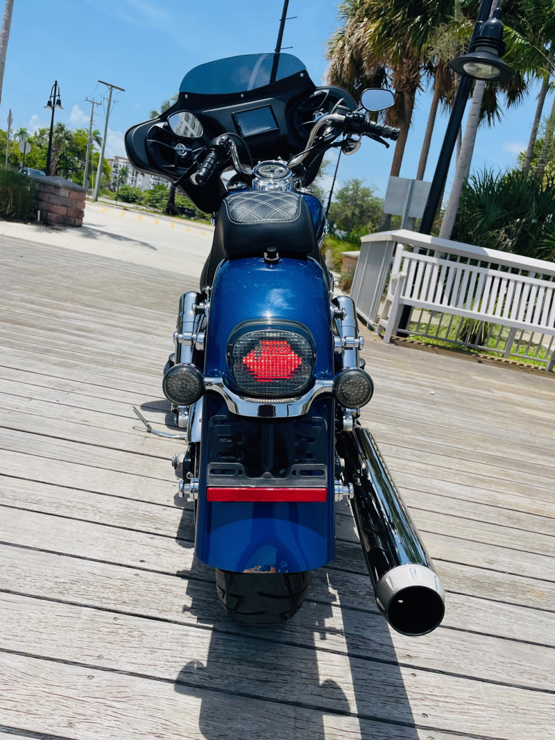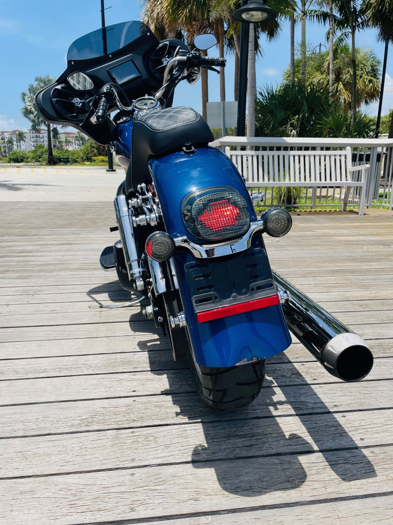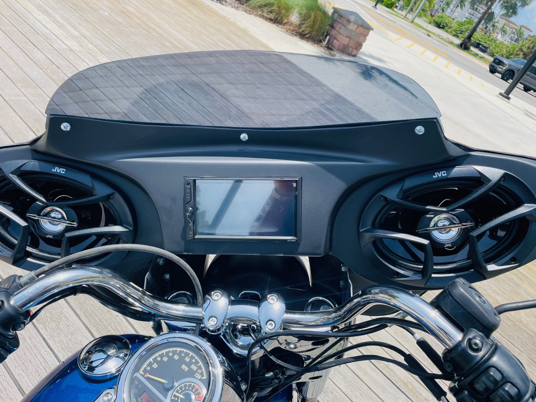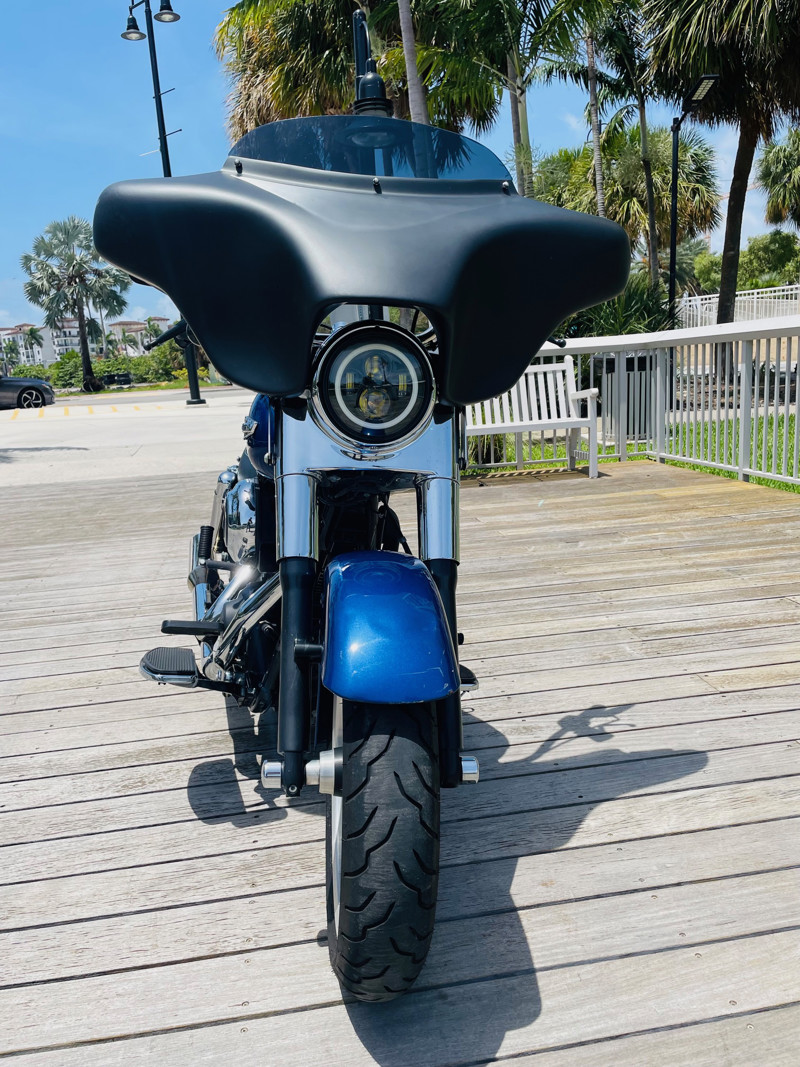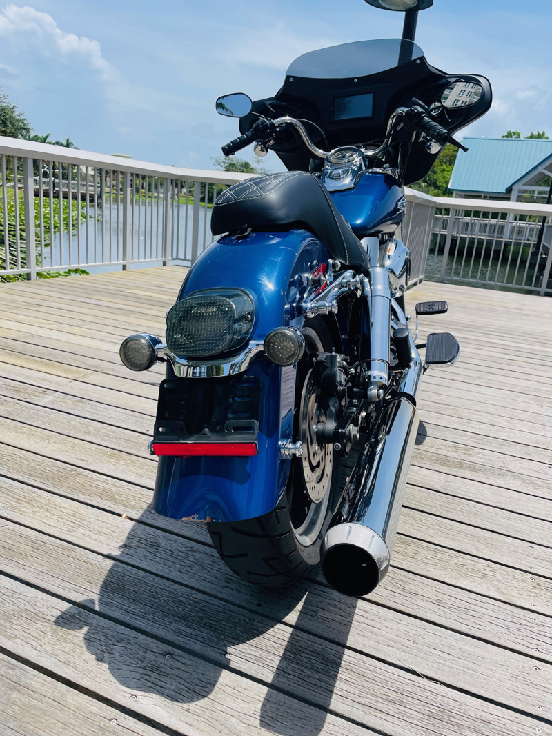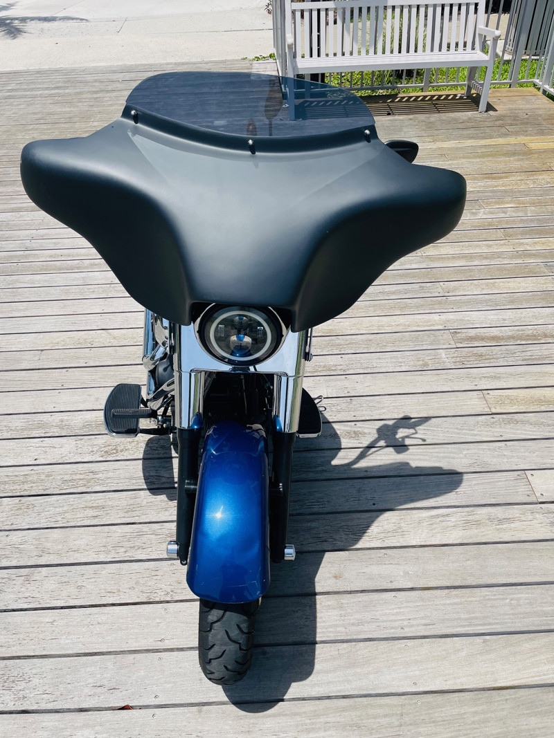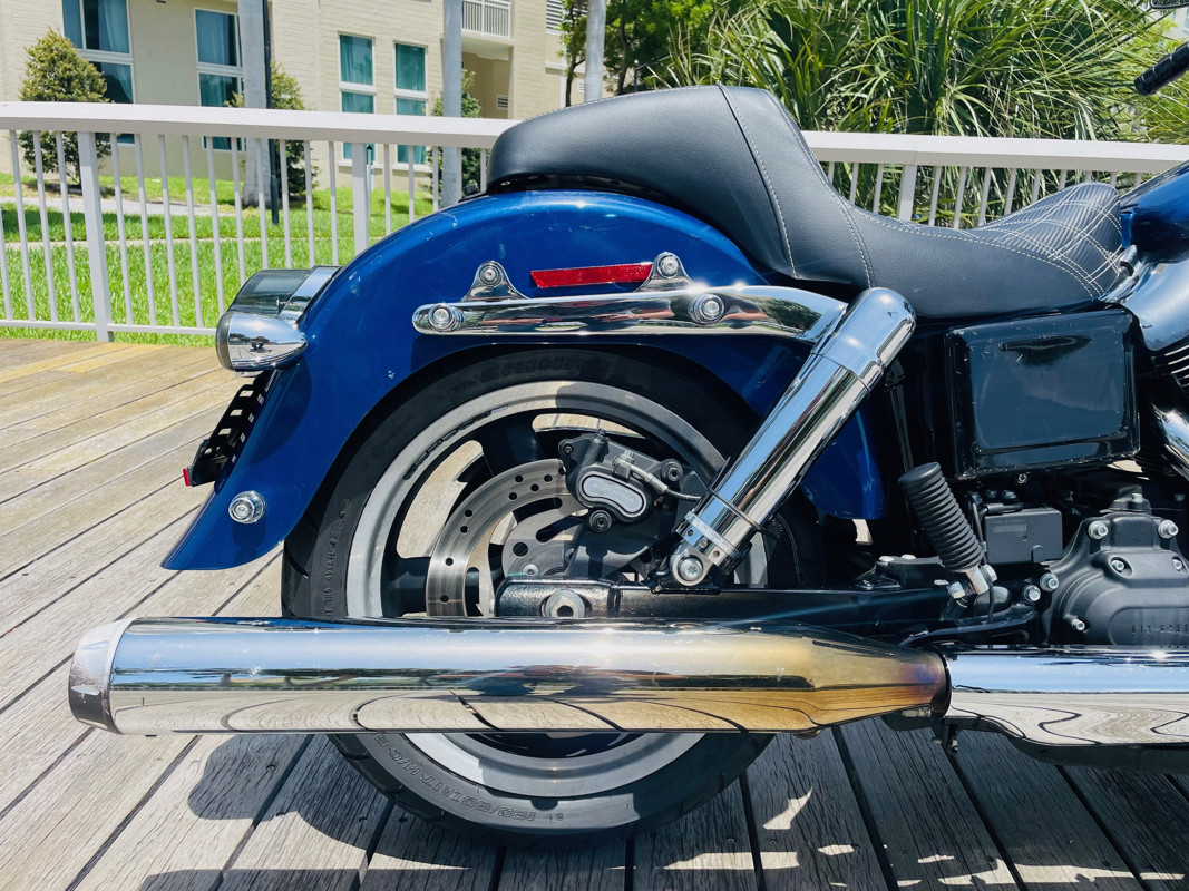 Beautiful Dyna Switchback finished in the absolute stunning Superior Blue. The bike has some minor scratches here and there but overall, a good looking bike. There is a dent on the front fender, dented without paint cracking. The bike runs great and has brand new tires installed. The batwing fairing was added along with a radio/Bluetooth and JVC speakers. The fairing can easily be removed to bring the bike back to its original condition.