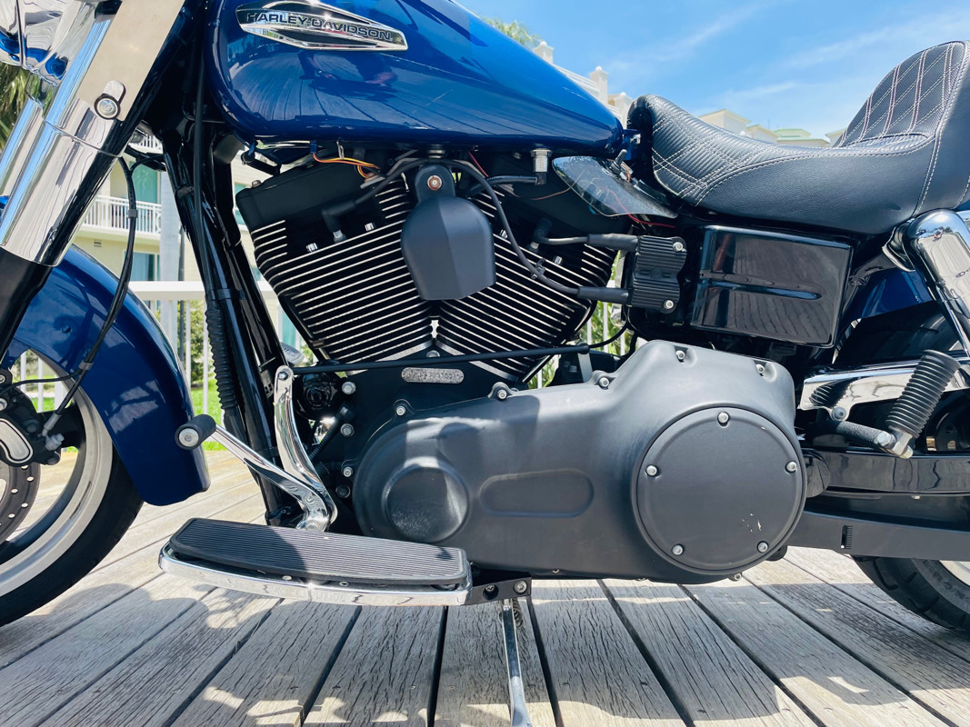 Bags were removed. The seat appears to be a Sportster seat which does not fit perfectly on the bike. We recommend adding a proper Dyna seat of your choice. The 103ci motor comes to live with the two in one exhaust. This bike is an amazing deal on a low mileage 103 powered motor. Plenty of power to take this mini-Road King places.