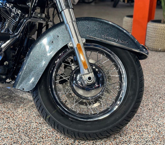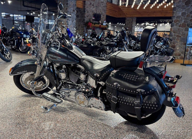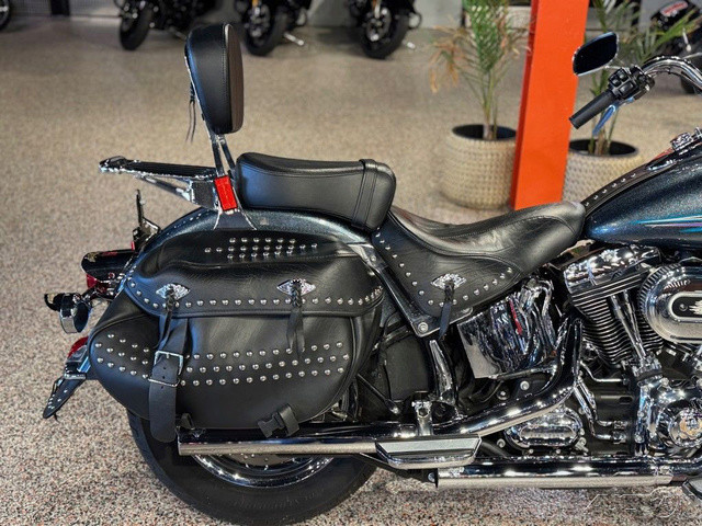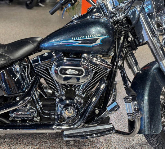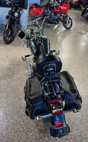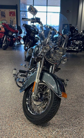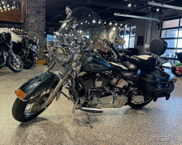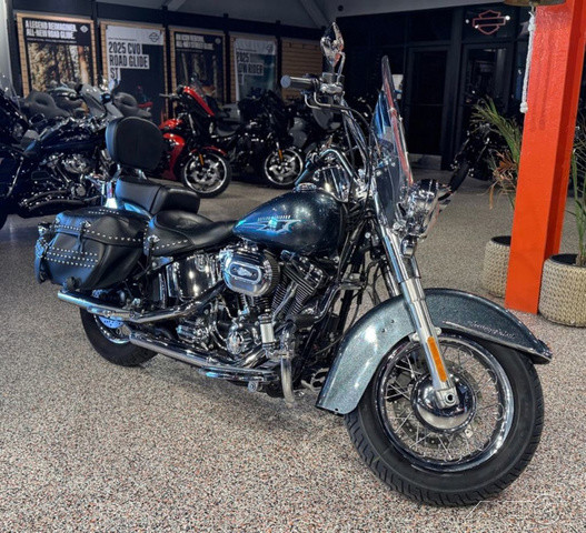 2015 Harley-Davidson® Heritage Softail® ClassicBlazing from the past with original dresser spirit and modern touring capabilities.Features May Include:Hidden Rear ShocksIf you want a comfortable bike but love that rigid-suspension look, you've come to the right bike. We've kept all the modern comforts where they belong—below the surface of a rad, vintage-looking bike. You get the classic lines of a vintage "hardtail" frame with the horizontal rear shocks hidden in the guts. It's a signature rigid look, and you'll only find it on a Softail® model.Nostalgic Custom StyleDo laced wheels, whitewalls and studded leather add to the way a bike feels on the road? Of course they do. It's these extras that make the Heritage Softail® Classic model the quintessential boulevard cruiser. As rallies were gaining grassroots traction in the '40s, you'd roll into Daytona Bike Week expecting new stories and new styles. There was really something going on, and it's still alive and well in this bike. Take the saddlebags, studded with style straight from that golden era, with hidden quick-detach buckles. Or the fenders—full and fluid, with chrome highlights and matching paint. Or that big, commanding 7-inch ball headlamp, chromed and classy. And let's talk wheels. You can go with the standard steel-laced wheels on blackwalls with a chrome hub. Or turn the clock all the way back with the optional chrome laces and wide whitewalls.Old-School Tank and 3-D MedallionThe unique medallion on the Heritage Softail® Classic motorcycle is glass-inlayed, cloisonné-and-chrome style and shows that Harley-Davidson® Softail® model heritage that runs in your blood. With a five-gallon capacity for long weekend cruising, we top off this tank with a nostalgic chrome "cats-eye" console, paint for days and style to spare.Tank-Mounted ConsoleThe speedometer face boasts a big, bold display for the odometer, along with an ancillary display for gear and rpm, offering up the information you need on the fly.Tombstone TaillightA vintage classic. The chrome, low profile taillight housing lays back against the fender but shines with Harley-Davidson history. Flanked by our sleek silver bullet turn signals, that glowing red gravestone is the last thing they'll see as you pull away into the night.Whitewall TiresOne of the defining styling features of the Softail® Deluxe model is the nostalgic wide whitewall tires with premium laced wheels. A nod to the ‘50s boulevard look, these fat rubber rollers are just the right throwback detail from Harley-Davidson that ups the ante in any scene. Total old-school styling without sacrificing handling or performance.Hard Candy Custom™ PaintHard Candy Custom™ is a large metal flake finish that’s more than just paint job, it’s a shining declaration of independence—bright, bold and unique. The Softail Deluxe is available in Hard Candy Cancun Blue Flake. Recalling the iconic rebel styling of ‘70s custom bikes, Hard Candy Custom marks another milestone in The Motor Company’s legacy of innovation. We start with several passes of 200 micron flake over a silver base, then clear coat it, hand-lay and mask the pattern and apply the Candy color to allow the flake to shine through. Then more clear coat and hand striping to a deep smooth finish. It’s a painstaking process that delivers a premium custom look straight from the factory, so you can start flying your colors with no waiting, no stripping or extra effort.