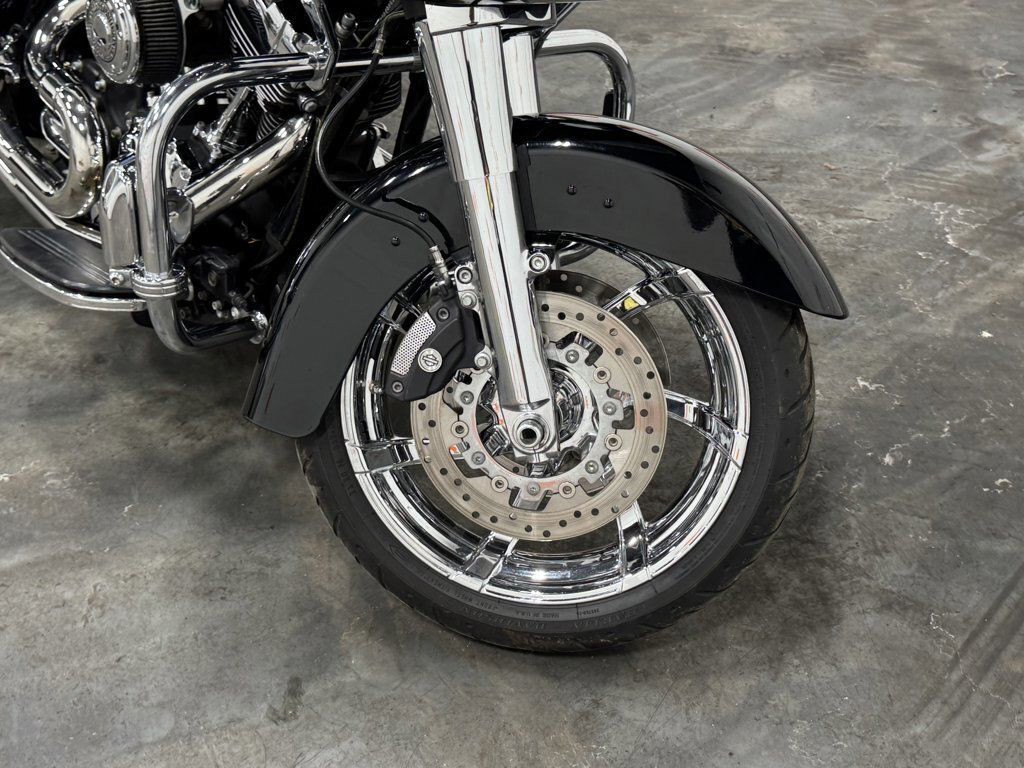 Powered by the proven Twin Cam 103 V-Twin engine and paired with a smooth 6-speed transmission, the Road Glide delivers strong torque, confident acceleration, and relaxed cruising at highway speeds. Its signature frame-mounted shark-nose fairing provides superior wind management and stability, especially on long rides, while the low-slung stance and responsive handling inspire confidence mile after mile. Hard saddlebags offer practical storage, and the clean black finish gives this bike a timeless, aggressive look that fits any riding style.