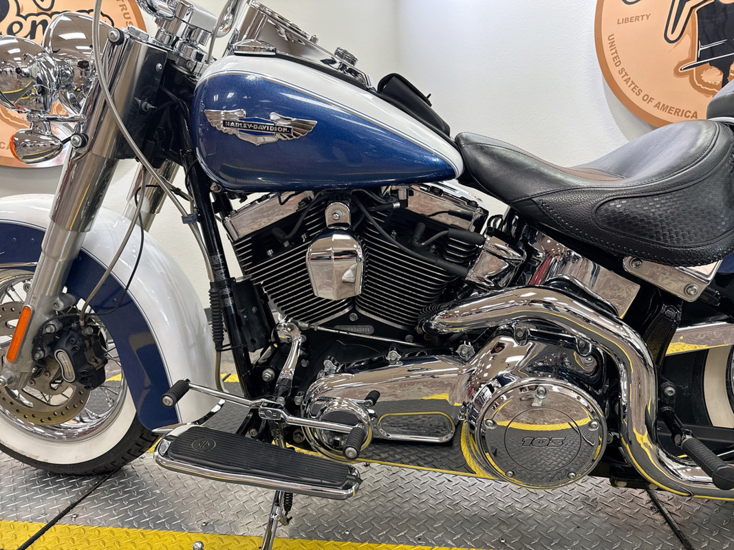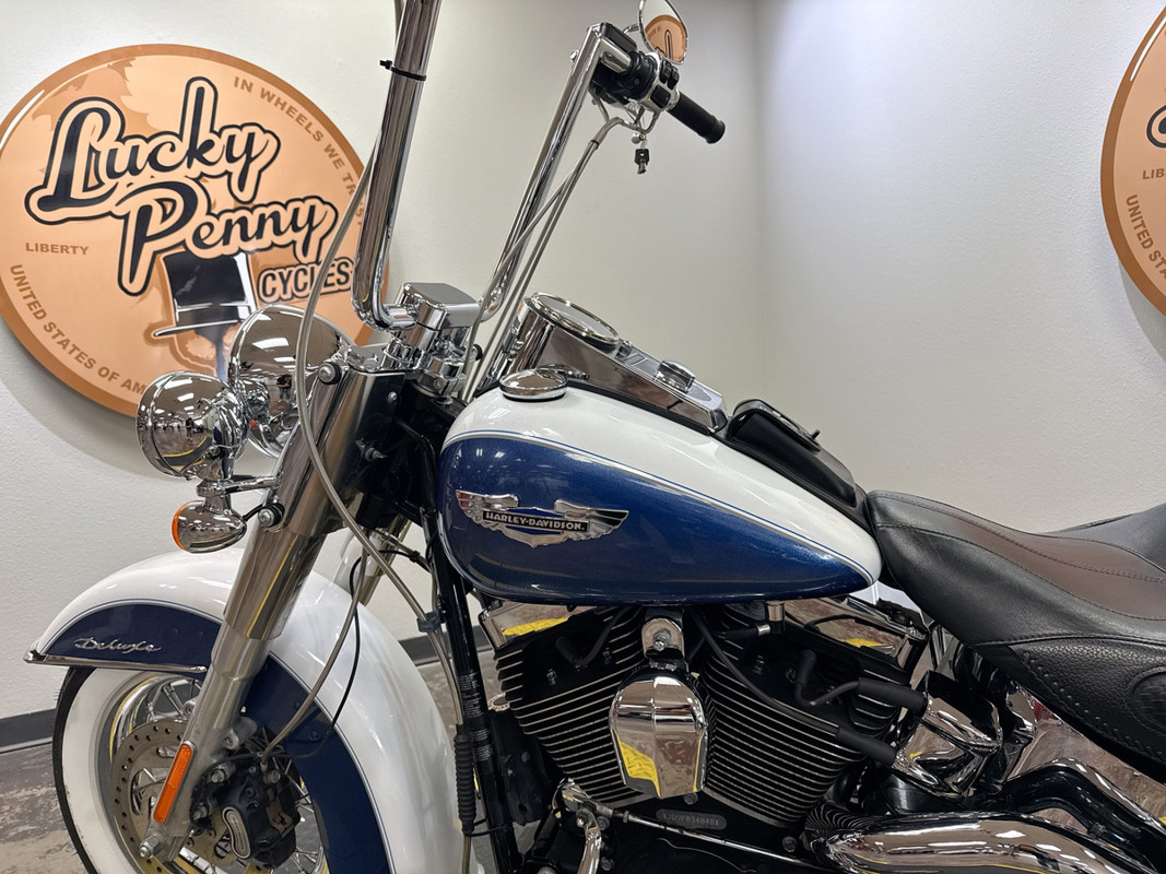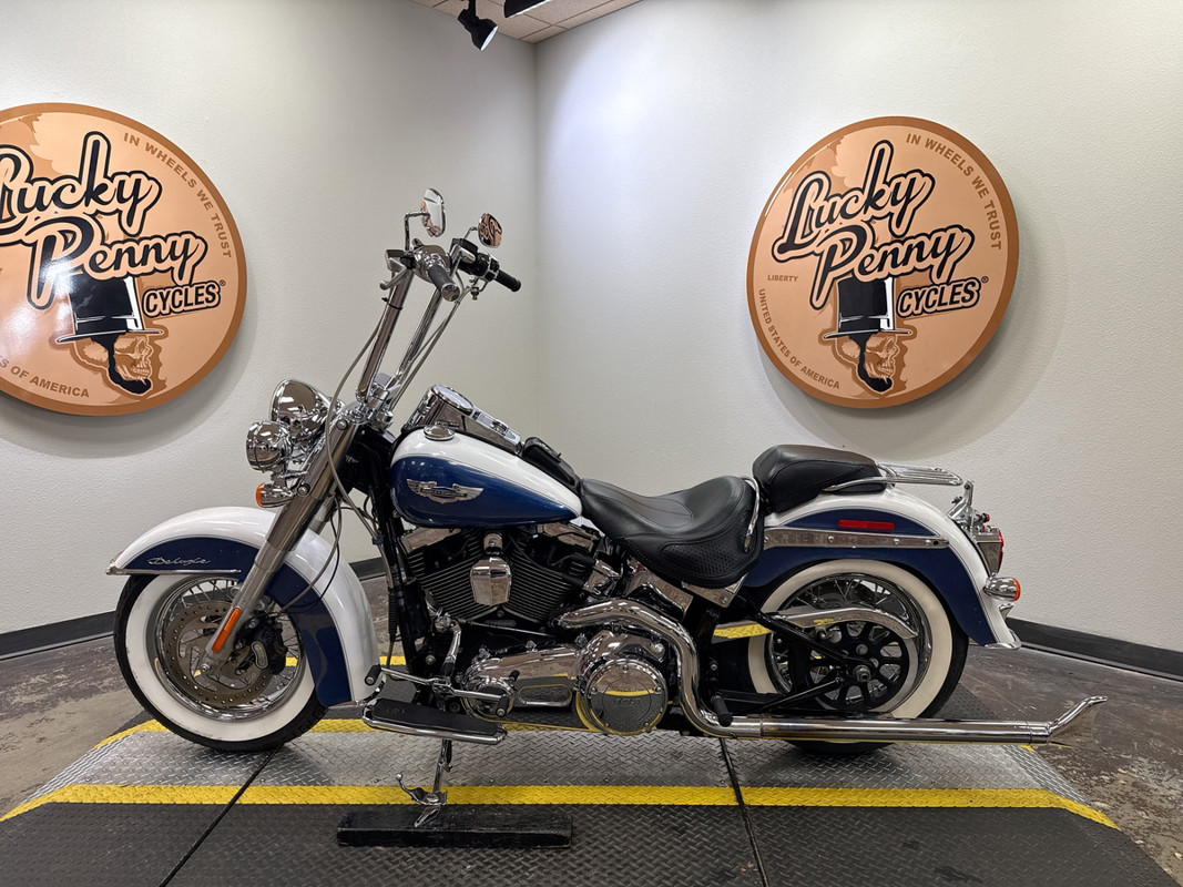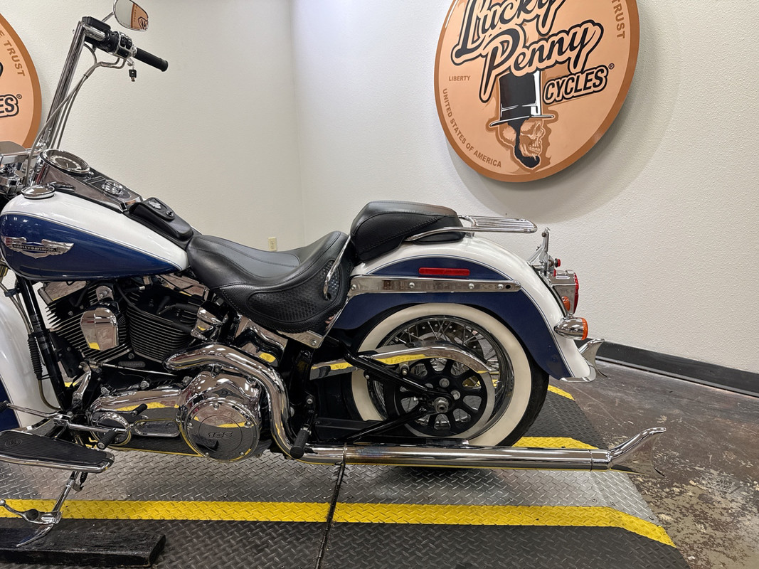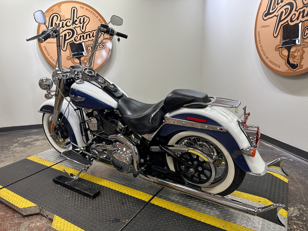 This is a 2015 Harley-Davidson Softail Deluxe (FLSTN) sporting a striking "White Hot Pearl/Blue Hot Pearl" paint scheme. This Softail Deluxe is powered by the reliable Twin Cam 103 engine.