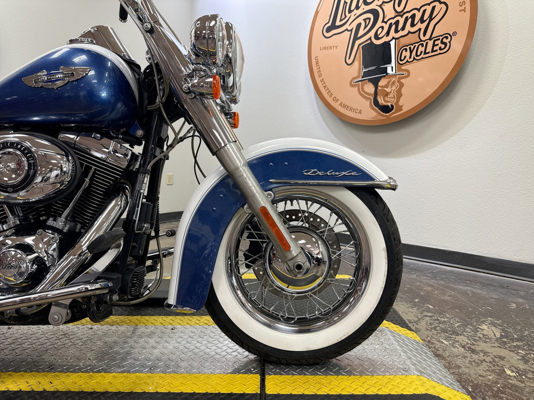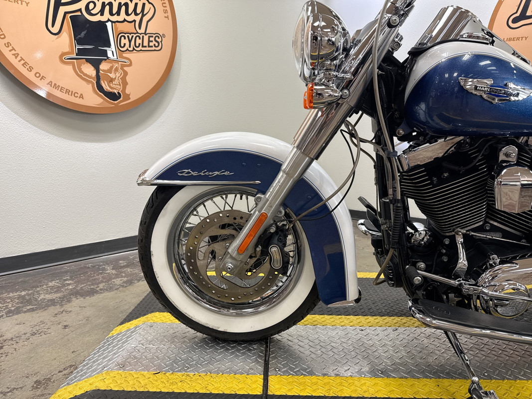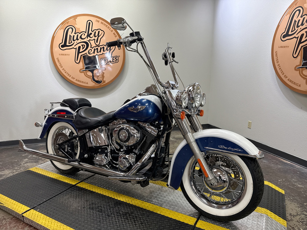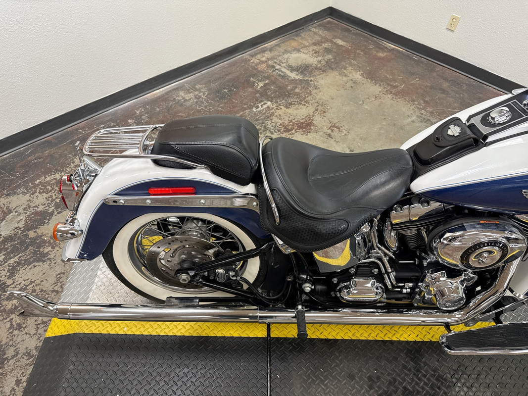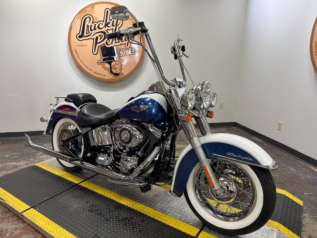 This is a 2015 Harley-Davidson Softail Deluxe (FLSTN) sporting a striking "White Hot Pearl/Blue Hot Pearl" paint scheme. This Softail Deluxe is powered by the reliable Twin Cam 103 engine.