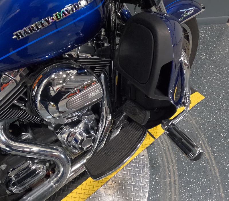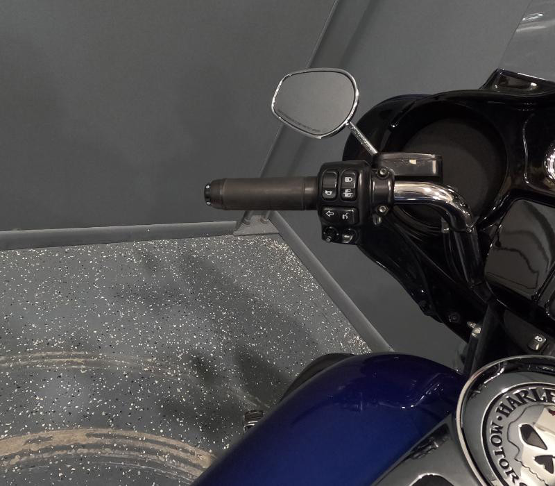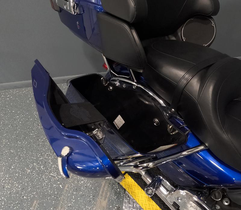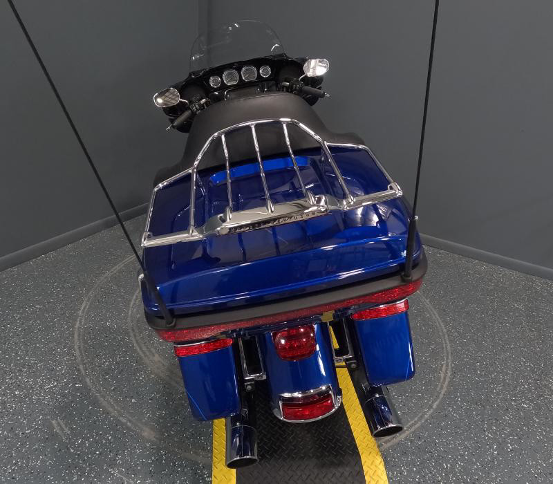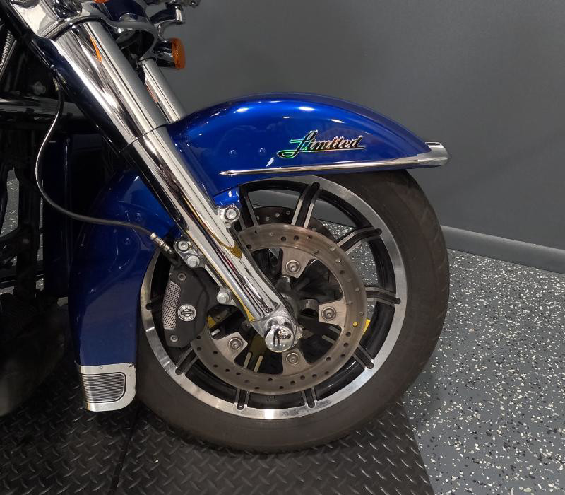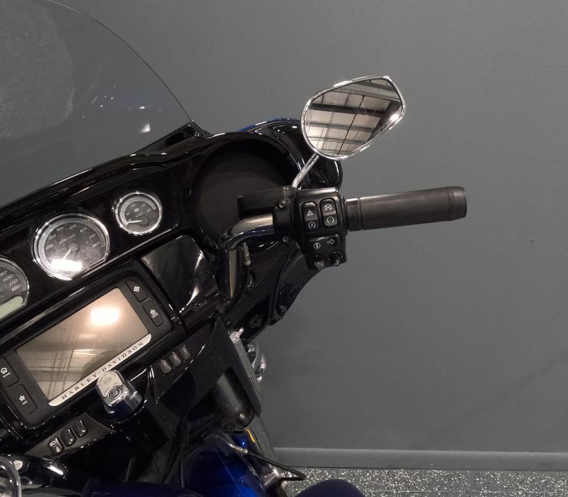 The Electra Glide Ultra Limited stands out with its striking exterior in Superior Blue with pinstripe accent, a color that not only captures attention but also emphasizes the bold character of this machine.